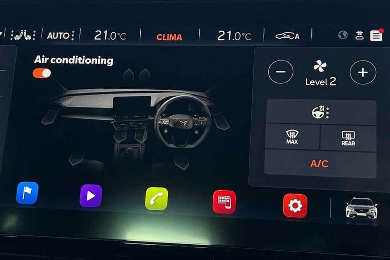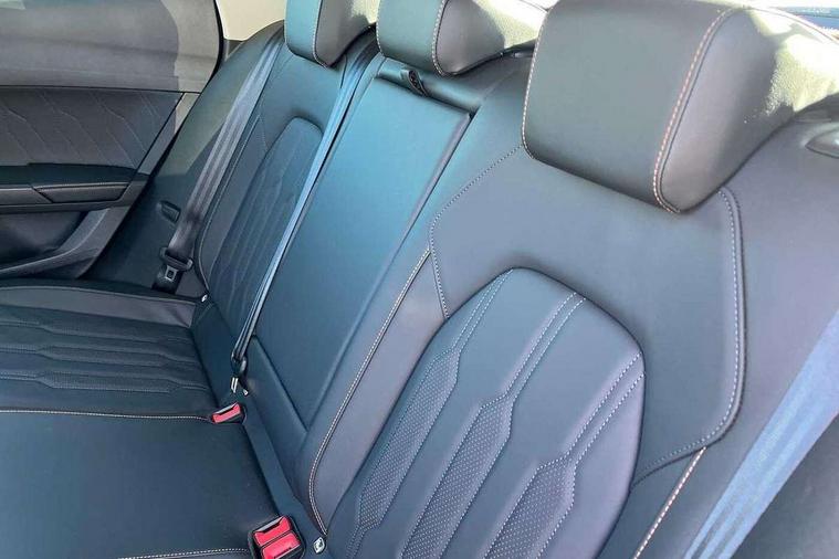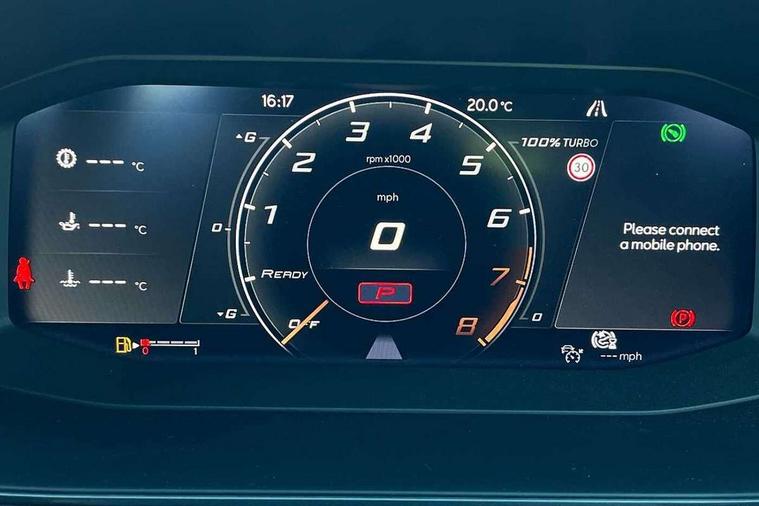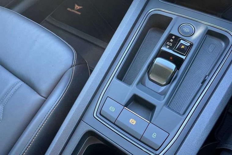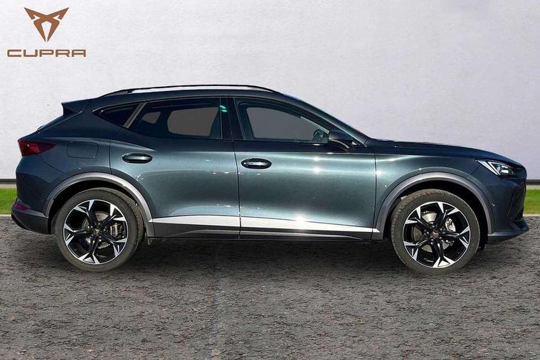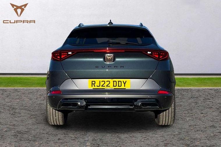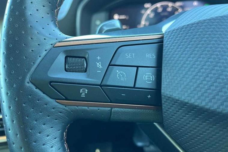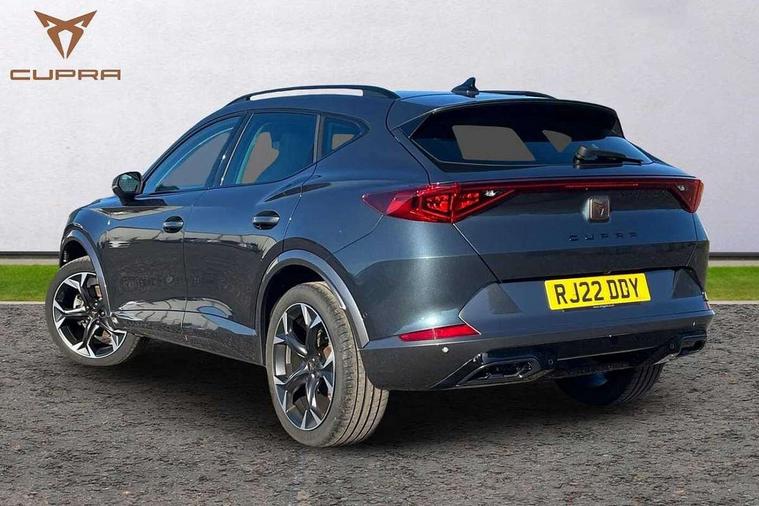 Digital cockpit and configurable dashboard, Driver alert system, Driving profile selection, E-call, Forward collision warning with automatic braking, Lane assist, Park assist (inc front/rear parking sensors), PAS, Predictive adaptive cruise control with speed limiter, Rear view camera, RPM, trip computer, outside temp gauge, instrument light brightness, low fuel warning light, lights on reminder, gearshift indicator, Service interval indicator, Start/stop system with regenerative braking, Wireless apple carplay, Wireless phone charger, Electronic locking differential and dynamic traction support, Standard suspension, 2 front and 2 rear USB type C sockets, Auxiliary input socket, DAB radio, Auto dimming rear view mirror, Body colour door handles, Body coloured bumpers, Dark grey wing mirror, Daytime running light with automatic headlight control and coming home feature, Dynamic headlight range control, Electric front/rear windows, Electrically adjustable heated and folding door mirrors with memory function, Front fog lamps with cornering function, Gloss black roof rails and window surrounds, LED Headlights, LED Taillights with dynamic indicator, Rain sensing wipers, Rear diffuser with black simulated exhaust pipes, Rear side wing doors, Rear wash/wipe, Third brake light, Tinted rear windows, Welcome lights, 12v power supply in centre console, 12V socket, 12v socket in loadspace, 2 front and 2 rear reading lights, 230V socket, 3 seat bench in 2nd row, 60/40 split rear bench seat with armrest and mechanical seat release, Dust/pollen filter, Front and rear head restraints, Front centre armrest, Height/reach adjust steering wheel, Illuminated interior front door sills, Illuminated sunvisor with mirror, Isofix, Leather multi function heated steering wheel with gear shift paddles, Luggage tie-down hooks, Single front passenger seat, Three zone climate control with control panel in rear, Variable luggage/load compartment floor, Wraparound lighting, Genuine Nappa leather Pack - Cupra, Navigation system pack with 10" navigation system - Formentor, 3 point seatbelts on all rear seats, ABS, Brake control system - ESC and brake booster, Child proof door locks, Driver and front passenger airbags with front passenger airbag de-activation, Electronic parking brake, Front and rear disc brakes, Front side curtain airbags, Hill hold control, Seat belt reminder for front and rear seats, Tyre pressure monitoring system, Anti theft alarm system, Keyless entry and start system (KESSY), Locking wheel bolts, Copper and aluminium interior detailing, 19" 'Exclusive' machined sport matte black and silver alloy wheels,
