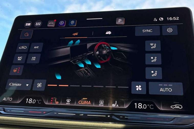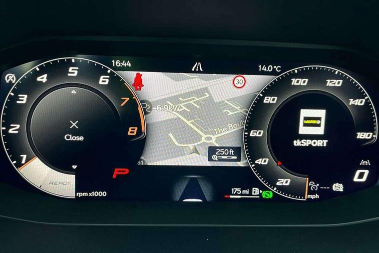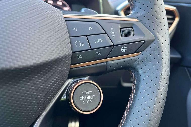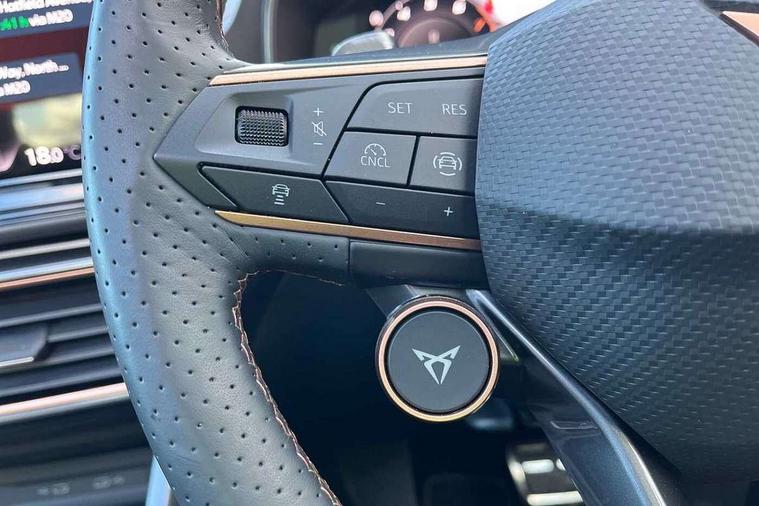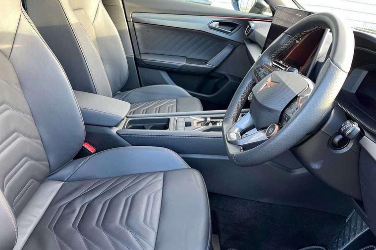 10.25" digital cockpit and configurable dashboard, Adaptive cruise control with follow-to-stop and speed limiter, Advanced driver alert system, Advanced lane assist with semi-automatic vehicle control in a medical emergency and traffic jam assist, Dynamic chassis control with driving profile selection (Comfort, Sport, CUPRA, Individual), Dynamic road sign display, Emergency steering support with turn assist, Forward collision warning with automatic braking, Full link phone integration, Intelligent park assist, RPM, trip computer, outside temp gauge, instrument light brightness, low fuel warning light, lights on reminder, gearshift indicator, Service interval indicator, Side and exit assist, Speed sensitive power steering, Start/stop system with regenerative braking, Top view camera, Virtual pedal and electric tailgate, Voice control system, Wired Android Auto, Wireless apple carplay, Wireless phone charger, Adaptive chassis control with continuous operation, CUPRA sport suspension, Electronic locking differential and dynamic traction support, 2 front and 2 rear USB type C sockets, Media system with navigation, 12.9" touchscreen display, voice control, DAB, steering wheel mounted controls, Auto dimming rear view mirror, Body colour door handles, Body coloured bumpers, Dark grey wing mirror, Daytime running light with automatic headlight control and coming home feature, Door panel ambient lighting, Dynamic headlight range control, Electric front/rear windows, Electrically adjustable heated and folding door mirrors with memory function, Gloss black roof rails and window surrounds, High beam assist, LED 3rd brake light, LED front fog lamps with cornering function, LED Taillights with dynamic indicator, Matrix LED headlights with multifunction camera, Rain sensing wipers, Rear fog lights, Rear side wing doors, Rear wash/wipe, Tinted rear windows, Welcome lights (within exterior mirror housing), 12V socket, 2 front and 2 rear reading lights, 3 seat bench in 2nd row, 60/40 split rear bench seat with armrest and mechanical seat release, Black headlining, Black interior roof lining, Cupra sports pedals, Dust/pollen filter, Electrically adjustable front seats with lumbar support and memory function, Front and rear head restraints, Front centre armrest, Heated front seats, Heated supersports multifunction leather steering wheel with satellite buttons and gear shift paddles, Height/reach adjust steering wheel, Illuminated aluminium doorsteps, Illuminated interior front door sills, Illuminated sunvisor with mirror, Isofix, Leather dashboard, door insert and side trim panel, Leather upholstery + bucket seats, LED smart wraparound lighting, Satellite steering wheel, Single front passenger seat, Storage pockets on rear of front seats, Three zone climate control with control panel in rear, Variable luggage/load compartment floor, 3 point seatbelts on all rear seats, ABS, Brake control system - ESC and brake booster, Child proof door locks, Driver and front passenger airbags with front passenger airbag de-activation, Electronic parking brake, Front and rear disc brakes, Front side curtain airbags, Hill hold control, Pre-crash front and rear seat belt tensioner, window closure and hazard lights, Public e-call, Seat belt reminder for front and rear seats, Tyre pressure monitoring system, Anti theft alarm system, KESSY Advanced - Keyless start, keyless entry with SAFELOCK, Locking wheel bolts, Copper and aluminium interior detailing, 19" Artic machined sport black and silver alloy wheels, Breakdown and tool kit,