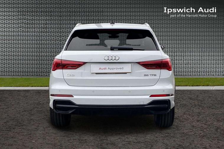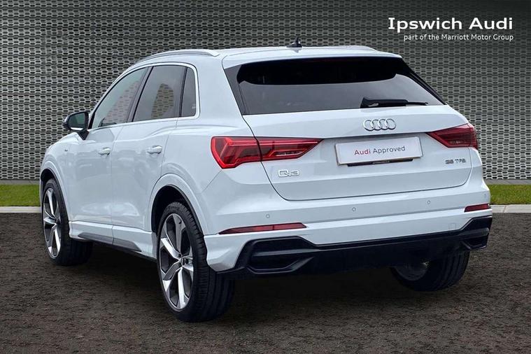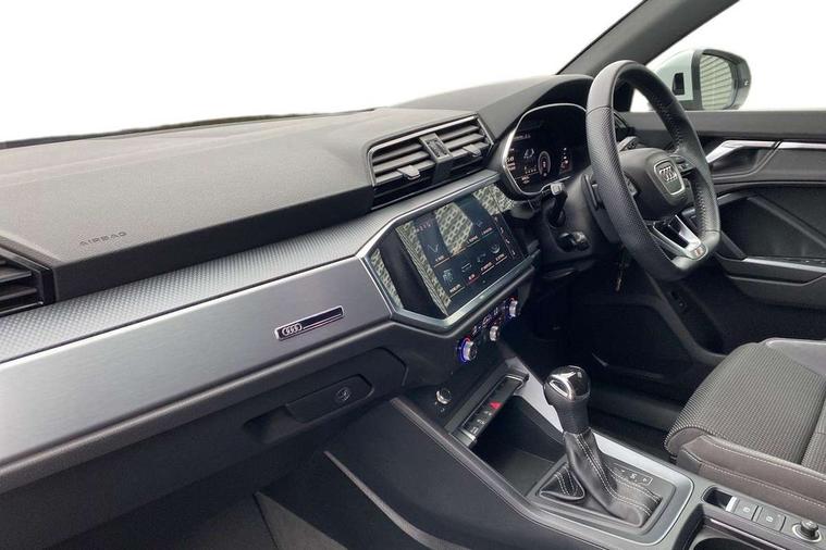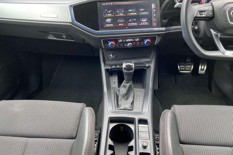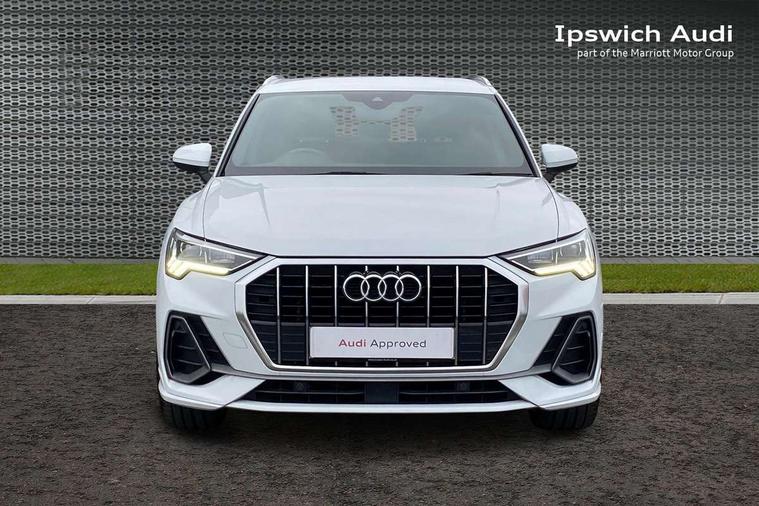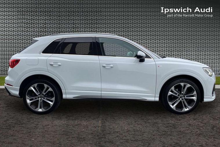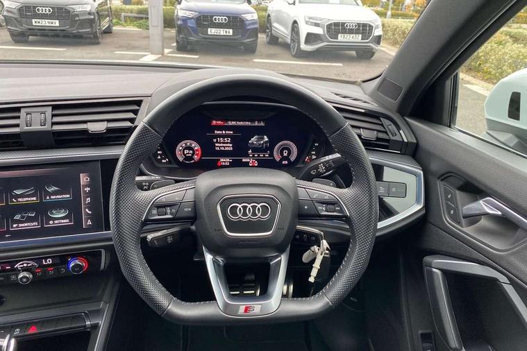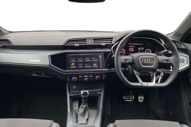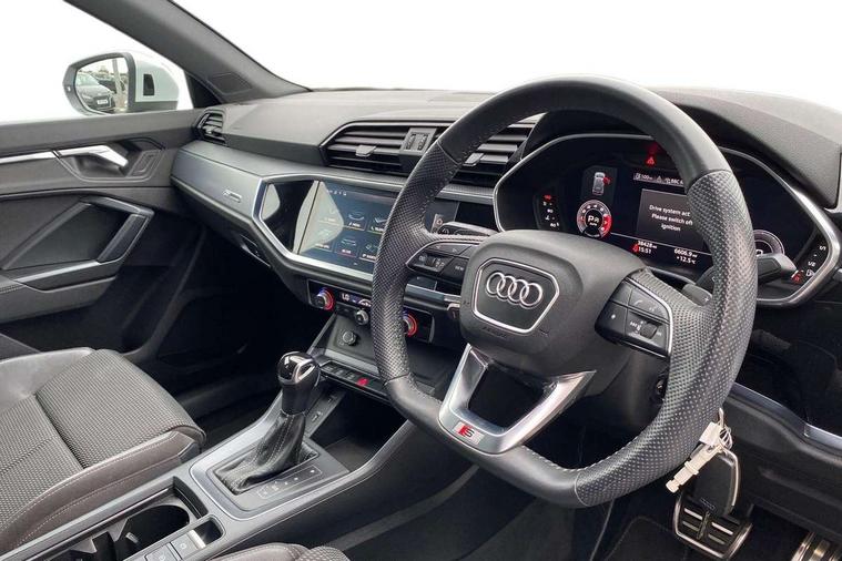Audi connect safety and service (e-call), Audi drive select, Audi lane departure warning, Audi side assist, Audi smartphone interface, Bluetooth interface, Camera based traffic sign recognition, MMI navigation plus with MMI touch, Power opening/closing tailgate, Progressive steering, Rear parking sensors, Service interval indicator, Stop/start system, Voice control system, Sports suspension, 1 x USB type C and 1 USB type A charging points, 6 speakers, DAB digital radio module, Acoustic windscreen, Aluminium roof rails, Aluminium window trim, Auto dimming rear view mirror, Body coloured bumpers, Diffuser in matt Platinum grey, Electrically adjustable and heated door mirrors with integrated LED side indicators, Front and rear electric windows, Front fog lights, Front side air inlets in matt platinum grey, Front spoiler blade in matt platinum grey, Grille vertical bars in aluminium silver/Matt, High gloss black finish B and C pillars, LED headlights with LED daytime running lights and dynamic rear indicator, LED rear lights, Privacy glass, Rain and light sensors, Rear diffuser strip in matt titanium black, S Line badge on wings, S Line front and rear bumpers, Side skirt insert in matt Platinium grey, Titanium black radiator grille, 12V socket in rear centre console, 40:20:40 split folding rear bench seat, Adjustable rear seat bench/backrest with centre armrest and cupholder, Aluminium door sill trims, Black cloth headlining, Dual zone climate control, Front and rear black floor mats with contrast stitching in rock grey, Front and rear headrests, Front centre armrest with storage compartment and angle adjustment, Illuminated door sill trims with S logo, ISOFIX child seat mounting and Top Tether with front passenger airbag deactivation, Manual front seats with height adjustment, Perforated leather gearknob, Stainless steel luggage compartment sill finisher, Stainless steel pedals, Non smoking pack - Q3, 3x3 point rear seatbelts, 6 airbags - Driver, front passenger, curtain and side windows, Audi pre-sense front with pedestrain and cyclist recognition, Electrically operated child locks on rear doors, Electromechanical parking brake, Electronic stabilisation control including ABS, ASR and EDL, Hill hold assist, Pre sense basic, Seatbelt monitoring, Tyre pressure warning, Warning triangle and first aid kit, Anti theft alarm, Anti theft wheel bolts, Remote central locking, Dark matt brushed aluminium inlay, MMI touch colour display in gloss black with aluminium surround, Tool kit, Tyre repair kit,