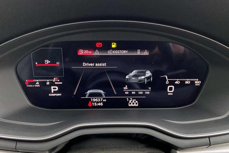 Audi connect safety and service (e-call), Audi drive select (Auto, Comfort, Dynamic, Efficiency and Individual), Audi smartphone interface, Audi virtual cockpit - 12.3" full colour digital instrument cluster, vehicle/engine speed, Radio/media information+Driver assistance systems, Automatic start-stop system with coasting functionality and efficiency programme, Bluetooth interface, Camera based traffic sign recognition, Electro-mechanical power steering, Email, calendar and text messages displayed via MMI, Front and rear parking sensors, Lane departure warning, MMI nav+ with MMI touch - 10.1" high resolution MMI display, touch sensitive, 3D map, route/country info, dynamic route guide, personal route assist, Power operated tailgate, Rear view camera, Service interval indicator, Voice control system, Comfort dynamic suspension, Diesel particulate filter, 8 passive loudspeakers, CD player, DAB digital radio reception, Two additional USB ports for rear passenger in rear centre console, Two SDXC card slots, Auto dimming door mirrors, Auto dimming rear view mirror, Body colour bumpers, Body colour door handles, Body colour side sill trim, Body coloured door mirrors, Electric adjustable heated door mirrors, Electric folding door mirrors, Electric front windows, Front fog lights, Kerb-view function for passenger side, LED headlights and rear lights with LED daytime running lights, LED side indicator lights integrated into door mirrors, LED third brake light, Matt aluminium silver tailpipe trim, Radiator grille in matt anthracite black and air inlets with inserts in matt aluminium silver, Rain and light sensors, Rear diffuser in matt anthracite black with trim strip in matt aluminium silver, Rear side wing doors, Rear wiper, Sport front and rear bumpers with side skirts, Variable front intermittent wipers, Windscreen with acoustic glazing, 3 seat bench in 2nd row, 3 spoke high multi-function leather sport steering wheel with paddle shift and height and reach adjustable, 4 way electric lumbar support for driver and front passenger, 40/20/40 split folding 3 seater rear bench seat, Deluxe 3 zone electronic climate control, Door sill trims with aluminium inlay, Front centre armrest, Front head restraints, Front/rear floor mats, Heated front seats, ISOFIX child seat mounting and top tether, Luggage compartment mat, Manual seat adjustment, Rear centre armrest, Rear headrests, Single front passenger seat, Sunvisors with vanity mirrors, Twin leather upholstery + front sports seats, LED interior light pack - A5/RS5, 3x3 point rear seatbelts, 6 airbags - Driver, front passenger, curtain and side airbags, Attention and drowsiness assist, Electromechanical parking brake, Electronic Stabilisation Control (ESC) including ABS, ASR and EDL, Front passenger airbag deactivation, Height adjustable front seatbelts, Hill hold assist, Manual child lock in rear doors, Multi collision brake assist, Pop-up bonnet for pedestrian protection, Pre sense city, Seatbelt monitoring, Tyre pressure warning, Variable restraint system, Warning triangle and first aid kit, Anti theft alarm system, Anti theft wheel bolts, Immobiliser, Keyless Go, Remote central locking, Aluminium ellipse silver inlays, Tool kit, Tyre repair kit,