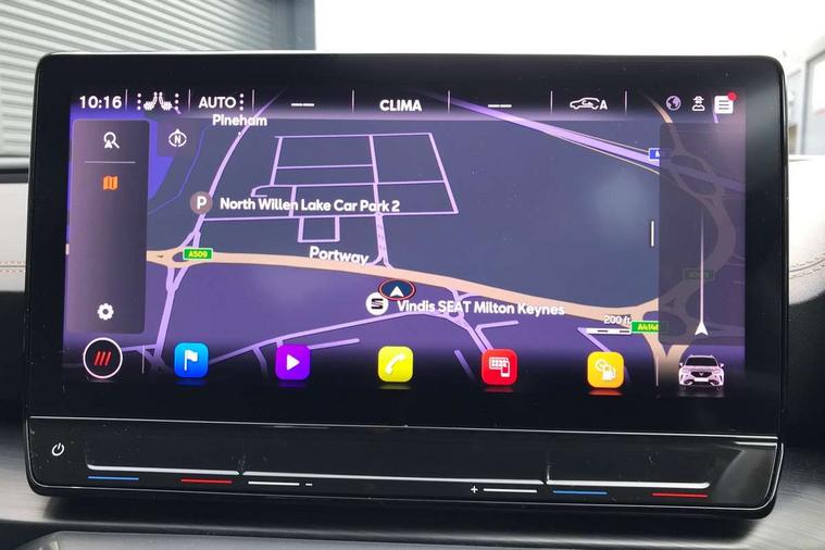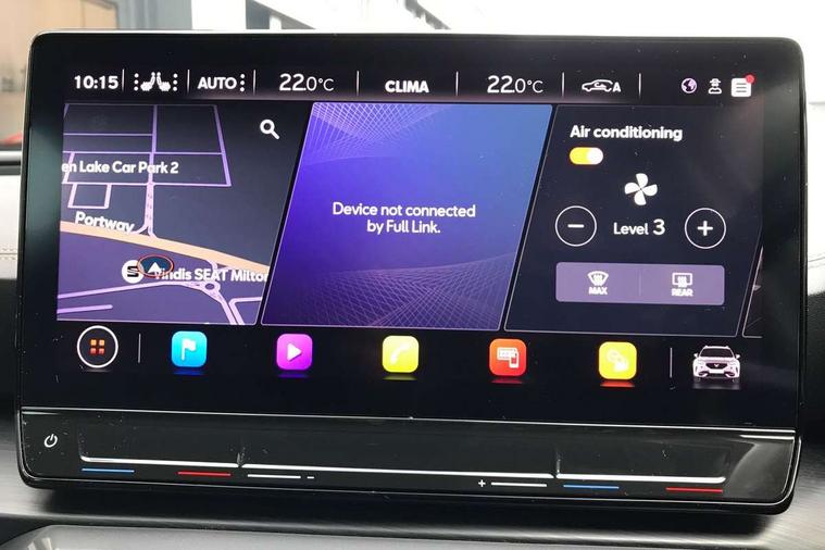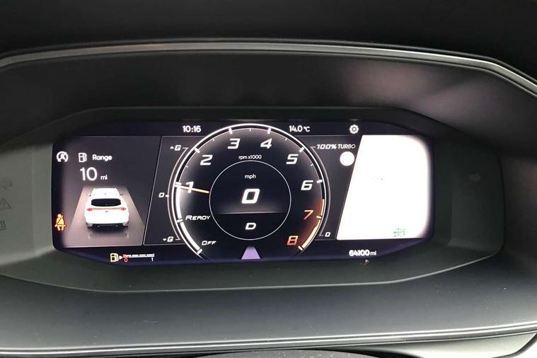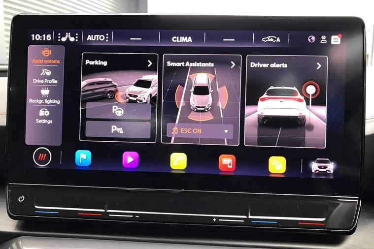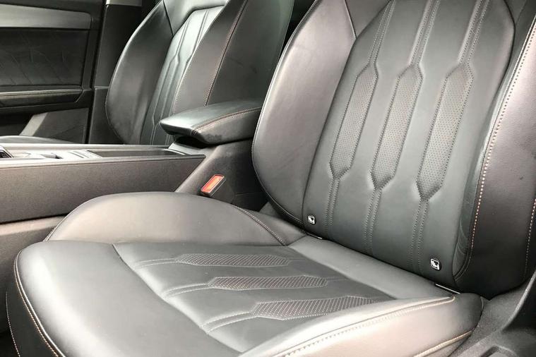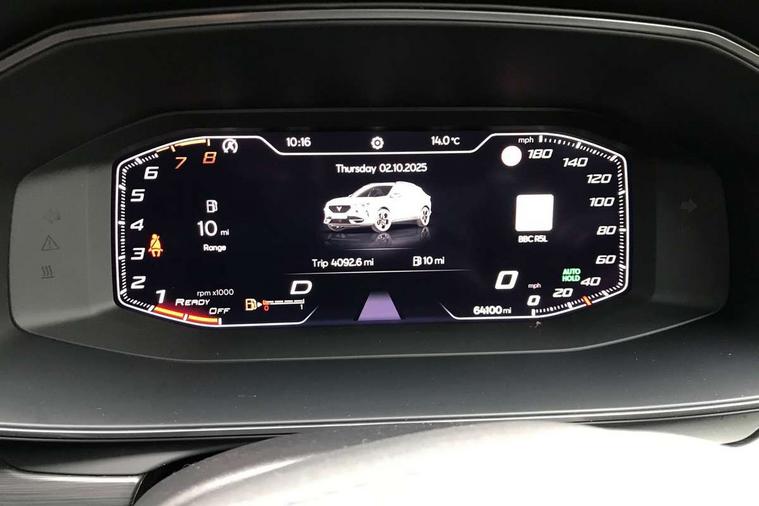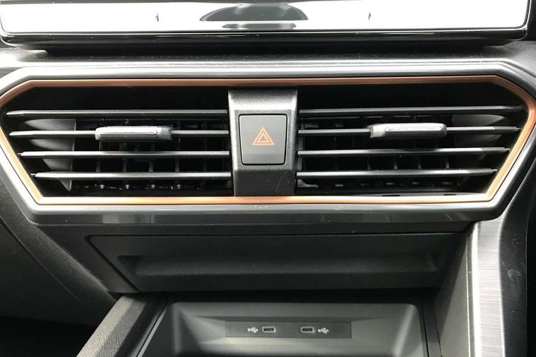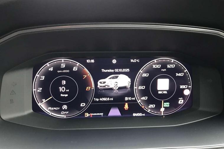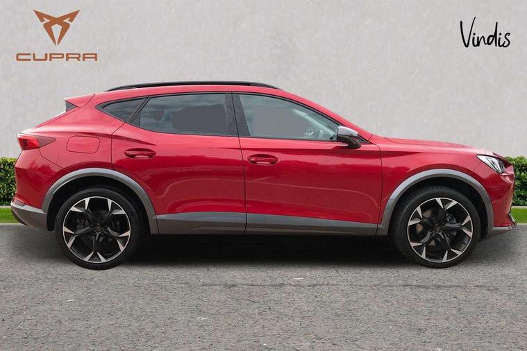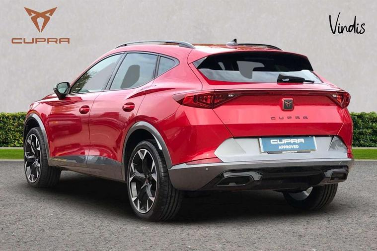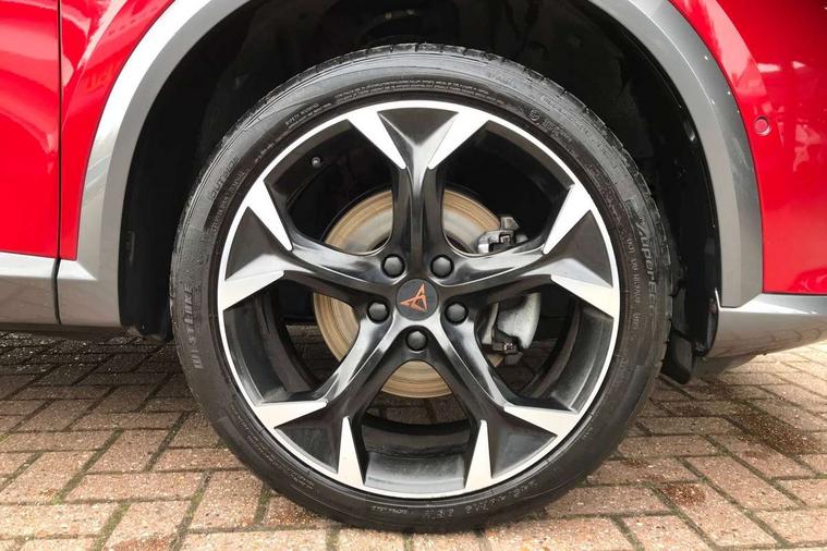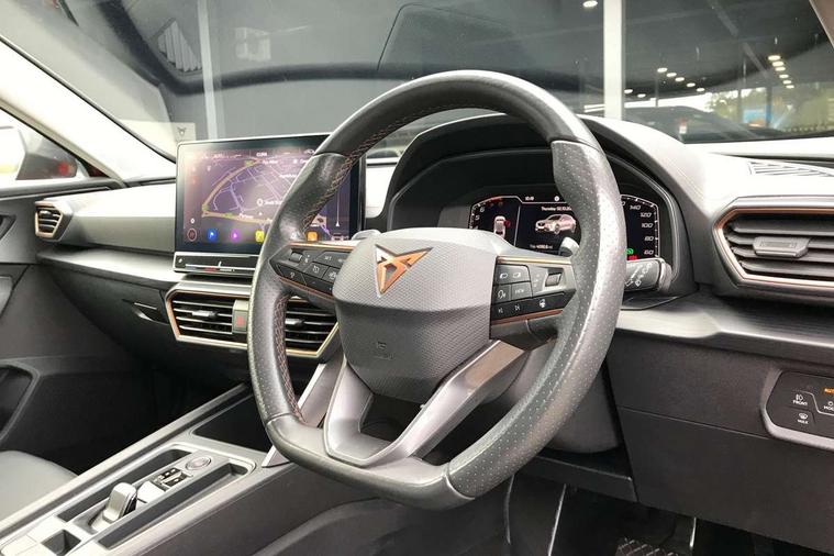 Digital cockpit and configurable dashboard, Driver alert system, Driving profile selection, E-call, Forward collision warning with automatic braking, Lane assist, Park assist (inc front/rear parking sensors), PAS, Predictive adaptive cruise control with speed limiter, Rear view camera, RPM, trip computer, outside temp gauge, instrument light brightness, low fuel warning light, lights on reminder, gearshift indicator, Service interval indicator, Start/stop system with regenerative braking, Wireless apple carplay, Wireless phone charger, Electronic locking differential and dynamic traction support, Standard suspension, 2 front and 2 rear USB type C sockets, Auxiliary input socket, DAB radio, Auto dimming rear view mirror, Body colour door handles, Body coloured bumpers, Dark grey wing mirror, Daytime running light with automatic headlight control and coming home feature, Dynamic headlight range control, Electric front/rear windows, Electrically adjustable heated and folding door mirrors with memory function, Front fog lamps with cornering function, Gloss black roof rails and window surrounds, LED Headlights, LED Taillights with dynamic indicator, Rain sensing wipers, Rear diffuser with black simulated exhaust pipes, Rear side wing doors, Rear wash/wipe, Third brake light, Tinted rear windows, Welcome lights, 12v power supply in centre console, 12V socket, 12v socket in loadspace, 2 front and 2 rear reading lights, 230V socket, 3 seat bench in 2nd row, 60/40 split rear bench seat with armrest and mechanical seat release, Dust/pollen filter, Front and rear head restraints, Front centre armrest, Height/reach adjust steering wheel, Illuminated interior front door sills, Illuminated sunvisor with mirror, Isofix, Leather multi function heated steering wheel with gear shift paddles, Luggage tie-down hooks, Single front passenger seat, Three zone climate control with control panel in rear, Variable luggage/load compartment floor, Wraparound lighting, Genuine Nappa leather Pack - Cupra, Navigation system pack with 10" navigation system - Formentor, 3 point seatbelts on all rear seats, ABS, Brake control system - ESC and brake booster, Child proof door locks, Driver and front passenger airbags with front passenger airbag de-activation, Electronic parking brake, Front and rear disc brakes, Front side curtain airbags, Hill hold control, Seat belt reminder for front and rear seats, Tyre pressure monitoring system, Anti theft alarm system, Keyless entry and start system (KESSY), Locking wheel bolts, Copper and aluminium interior detailing, 19" 'Exclusive' machined sport matte black and silver alloy wheels,