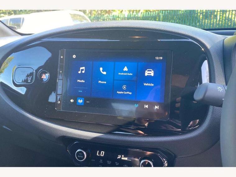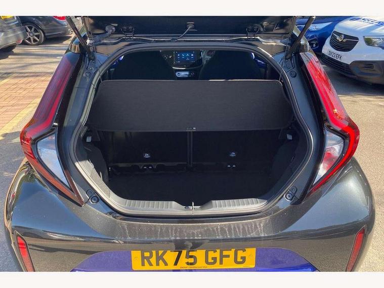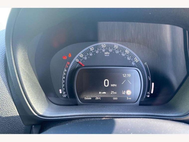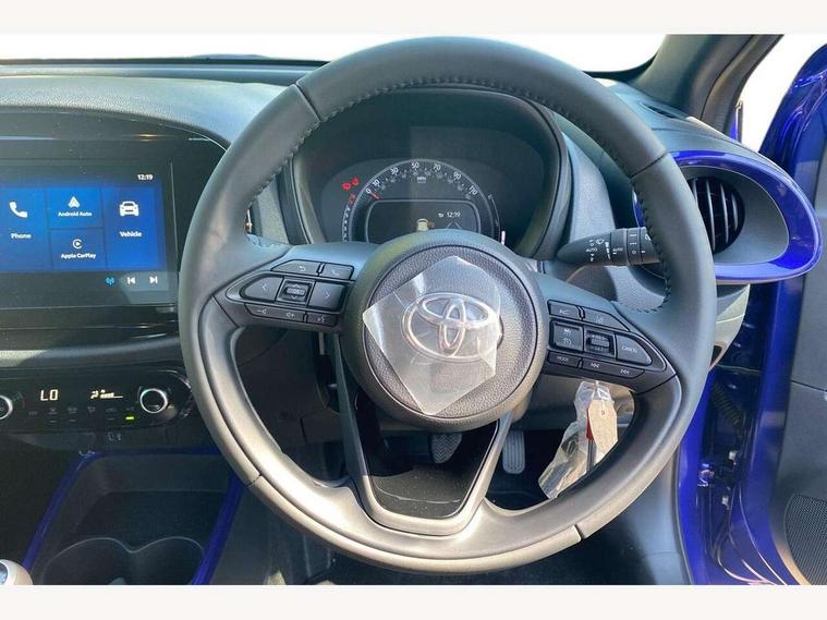 4.2" TFT colour screen, Adjustable speed limiter, Analogue speedometer, Bluetooth connectivity, Digital tachograph, Driver attention alert system, eCall emergency call system, Electric power steering, Intersection turn assist, Key reminder warning, Noise reduction kit, Pre collision system with emergency steering assist, Reversing camera with static guide lines, Smart phone integration with Apple car play/Android Auto, Speed limit display, Start and stop, Vehicle Stability Control (VSC), 4 speakers, 9" HD multimedia display touch screen with Toyota smart connect, DAB digital audio broadcast, USB connector, Auto headlights, Auto wipers, Automatic headlights cut-off, Bicycle towing hook, Black contrast roof, Black side protection mouldings, Black wheel arch mouldings, Body colour door handles, Body coloured front bumper, Boot door scuff plate, Eclipse black rear bumper, Electric heated door mirrors, Follow me home headlights, Front fog lights, Front power windows, Gloss black door mirrors, Gloss black upper front grille, Headlight cut-off reminder, LED daytime running lights, LED front light guide, LED High mounted stop lamp, Manual day/night rear view mirror, Manual headlight levelling, Pagoda roof, Power adjustable door mirrors, Power back door, Privacy glass, Projector halogen headlights, Rain sensor, Rear combination lights LED bulb type, Rear side wing doors, Rear windscreen defogger, Rear windscreen wiper, Short antenna, Variable intermittent windscreen wipers, 12v power outlet - front, 2 seat bench in 2nd row, 3 spoke leather steering wheel, 50/50 split folding rear seat, Adhesive roof headlining, Adjustable speed limiter switch on steering wheel, Audio and telephone switches on steering wheel, Auto air conditioning, Black insert on steering wheel, Black roof lining, Boot light, Centre room light, Chrome interior door handles, Chrome surround on air conditioning buttons, Clean air filter, Console box storage in body color, Fabric upholstery, Floor mats, Front and rear cup holders, Front head rest deco art, Front head restraints, Height adjustable driver seat, Intelligent adaptive cruise control switch on steering wheel, ISOFIX child restraint system on rear seats, Lane departure alert switch on steering wheel, Leather gearshift knob, Manual tilt steering wheel, Manually reclining and sliding driver seat, Manually reclining and sliding front passenger seat, Multimedia switches on steering wheel, Pollen filter, Rear door pockets, Rear head restraints, Satin silver insert on gear shift knob, Single compartment glovebox with lights, Single front passenger seat, Soft tonneau cover, Sun visors with mirror on driver and passenger side, Voice recognition switch on steering wheel, Toyota safety sense pack - Aygo X, Anti lock braking system + Electronic brake force distribution, Child safety door lock, Emergency brake light signal (EBS), Hill start assist control (HAC), Passenger airbag on/off switch, Seat belt reminder for front and rear seats, Supplement restraints system (SRS) - 6 airbags, Traction control, Tyre pressure warning system, Immobiliser, Remote power door locks, Black wheel centre caps, Tyre repair kit,