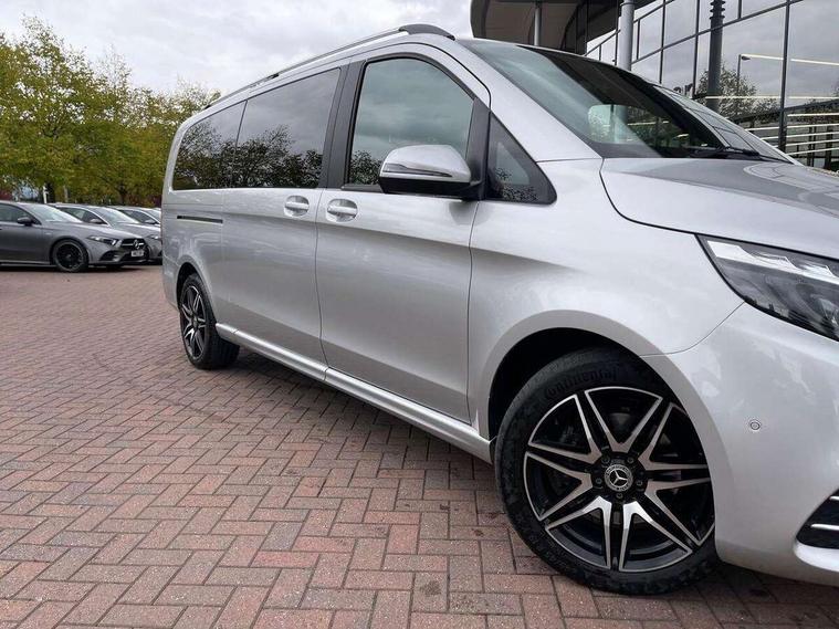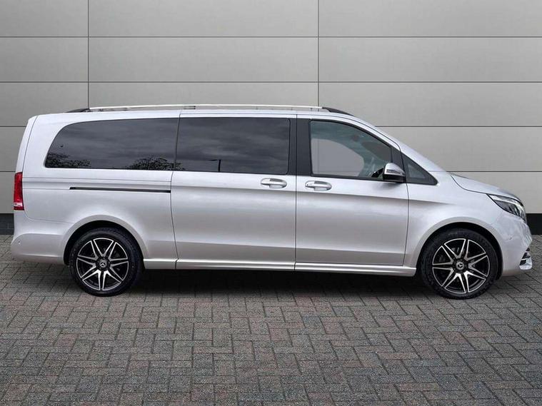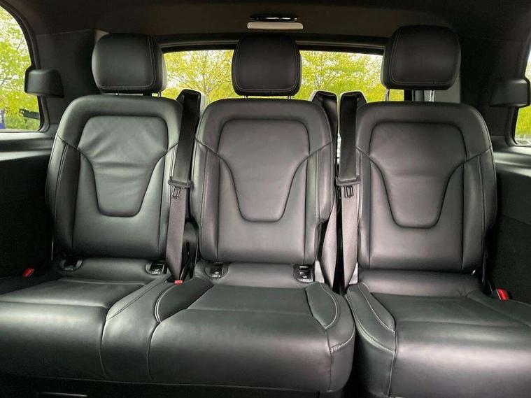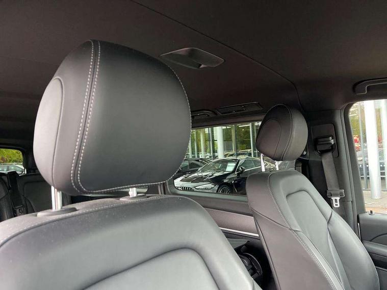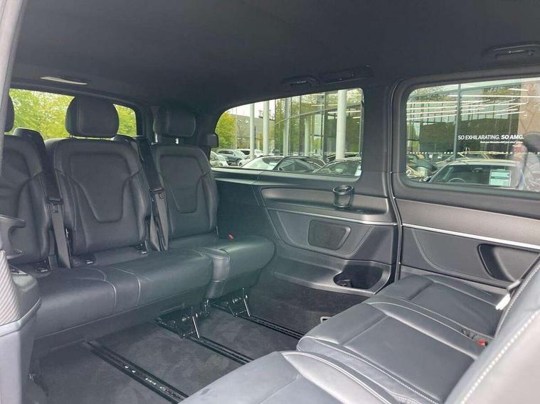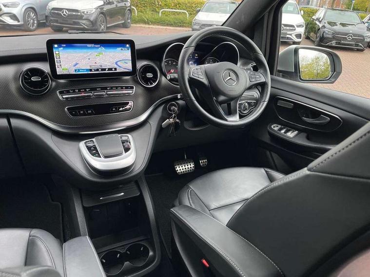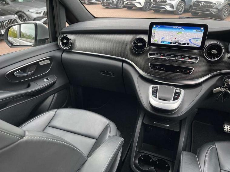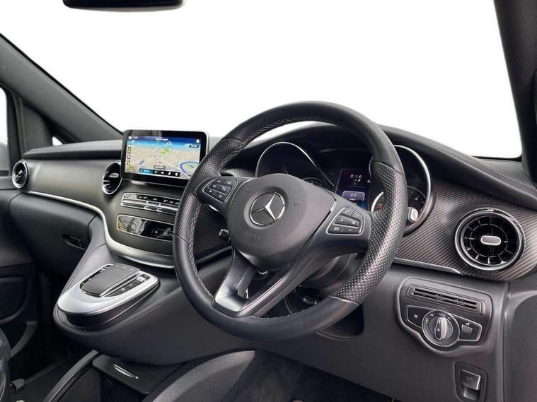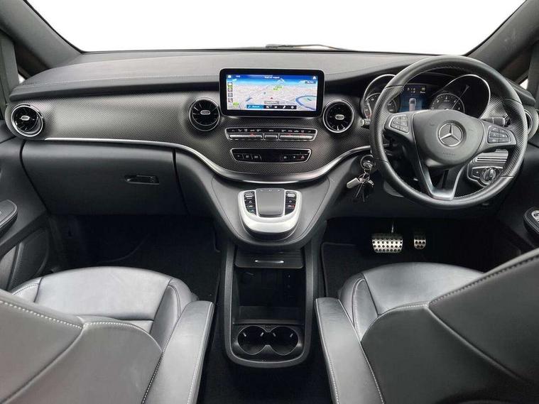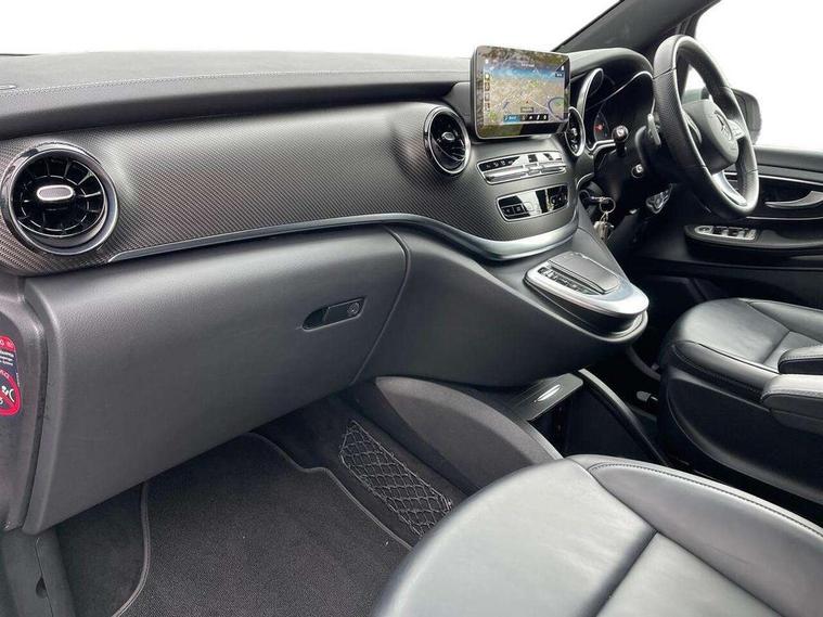 Active parking assist, Agility select with a choice of driving modes (Comfort, ECO, Sport, Individual), Attention assist, Brake wear warning display, Cruise control with speedtronic variable speed limiter, Direct steer speed sensitive steering, Easy-pack tailgate - Powered opening/closing automatically, ECO start/stop function, Instrument cluster with 5.5 inch colour display trip computer, MBUX multimedia nav with 10.25" touchscreen, Hey Mercedes intelligent voice control, 2 USB-C ports and mobile connectivity for up to 15 devices, MBUX personalised vehicle profiles, MBUX touchpad, Mercedes me connect including emergency call system, accident recovery, breakdown and maintenance management, Outside temperature display, Service indicator (ASSYST), Side wind assist system, Status display for rear seat belts in instrument cluster, 25 litres large AdBlue tank, 9G TRONIC 9 speed automatic transmission, Agility control comfort suspension, Diesel particulate filter, Audio 20 CD with integrated media interface, DAB Digital radio, Integrated radio aerial, iPod/iPhone + Bluetooth interface with handsfree function, Two USB ports and one SD Card slot in centre console, Adaptive brake lights, AMG bodystyling front apron and rear roof spoiler, AMG bodystyling front apron and rear spoiler, AMG bodystyling rear apron, AMG bodystyling side skirts, Anodised roof rails, Automated headlamp assist, Automatically dimming exterior driver's mirror, Black tinted rear windows, Body colour bumpers, Body colour door mirrors, Chrome pins diamond radiator grille with integrated stars, Chrome trim to front bumper, Electric folding door mirrors + auto dimming rear view mirror, Electric front windows, one touch / obstruction sensor, Electric sliding door in both side, Electric ventilation windows in passenger compartment, Heated windscreen washers, Illuminated front door sill panels with Mercedes-Benz lettering, LED intelligent light system including integral LED daytime running lamps, LED tail lamps/brake lamps and indicators, Logo projection, Metallic paint, Privacy glass, Rain sensing windscreen wipers, Rear wiper, Split tailgate in opening rear window with chrome handle, 12V socket in boot/load compartment and rear passenger compartment, 3 colours ambient lighting, 3 seat bench in 2nd row, 3 seat bench in 3rd row, 3 spoke nappa leather steering wheel, Adjustable front seat head restraints, ARTICO leather upper dashboard with contrast stitching, Carpet floor covering in passenger compartment, Comfort driver and front passenger seats including armrest, Driver + front passenger lumbar support, Electric air heater system - 1.2 kW output, Extended seat rails, Footwell lighting with reading light and illuminated handle in rear compartment, Height/reach adjustable steering column, Lockable glove compartment, Luxury centre console with retractable cover + two cup holder + 12V socket + multimedia box, Multifunction steering wheel with audio controls and onboard settings, Nappa leather upholstery, Rear head restraints, Seat occupancy sensor for front passenger seat, Single front passenger seat, Sports pedals in brushed stainless steel with rubber studs, Stowage nets behind individual seats, Sunvisors with illuminated vanity mirrors, Thermatic 3 zone automatic climate control, Three stage heated front seats, Seat comfort pack - V Class, Towing pack - V Class, Urban Guard protection pack - V Class, 3 point seatbelts on all seats, Active brake assist, Adaptive brake system with HOLD function and brake drying in the wet, Airbags - sidebag for driver and front passenger with combined thorax/pelvis bag, Airbags - windowbag for driver and front passenger, Anti-lock braking system (ABS), Electric parking brake, Electronic Stability Programme, Hill start assist, Perforated front brake discs and brake calipers with Mercedes-Benz lettering, Rear child proof door locks, Tyre pressure monitoring system, Warning triangle and first aid kit, Central locking with interior switch, Chrome surround electric key, Carbon look trim, Chrome air vent surrounds, 19" AMG 7 twin spoke alloy wheels, Space saver spare wheel with jack, Summer tyres,