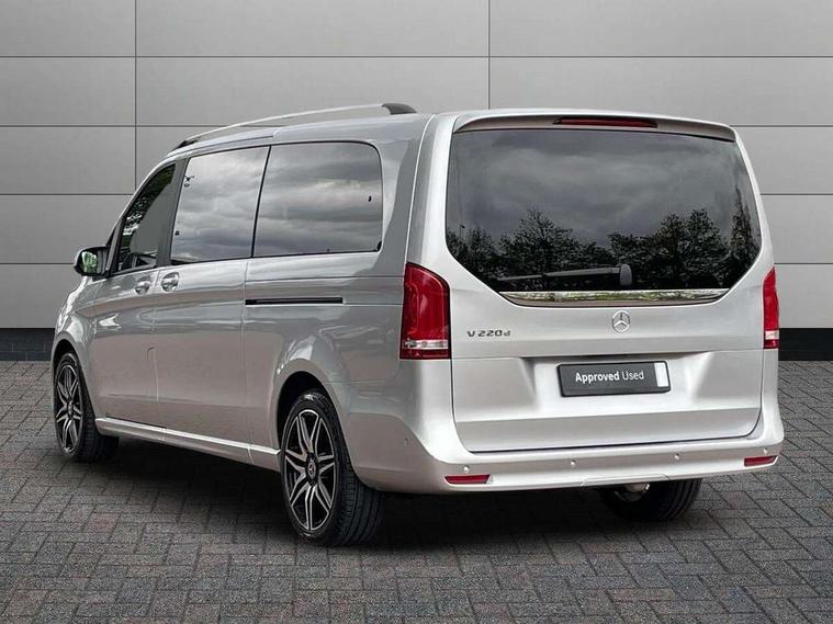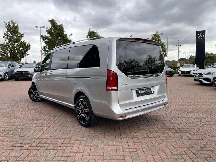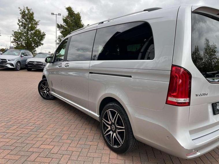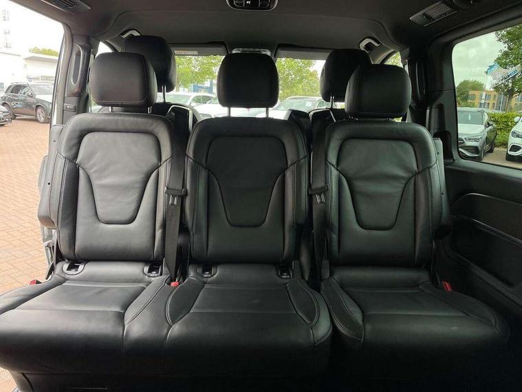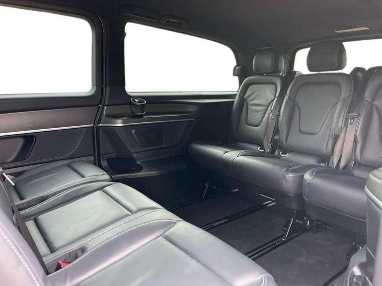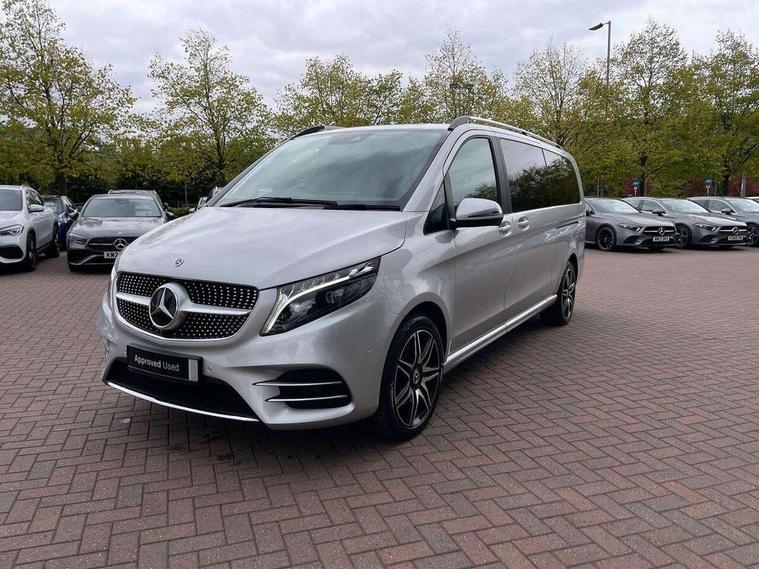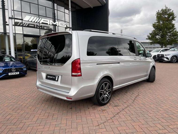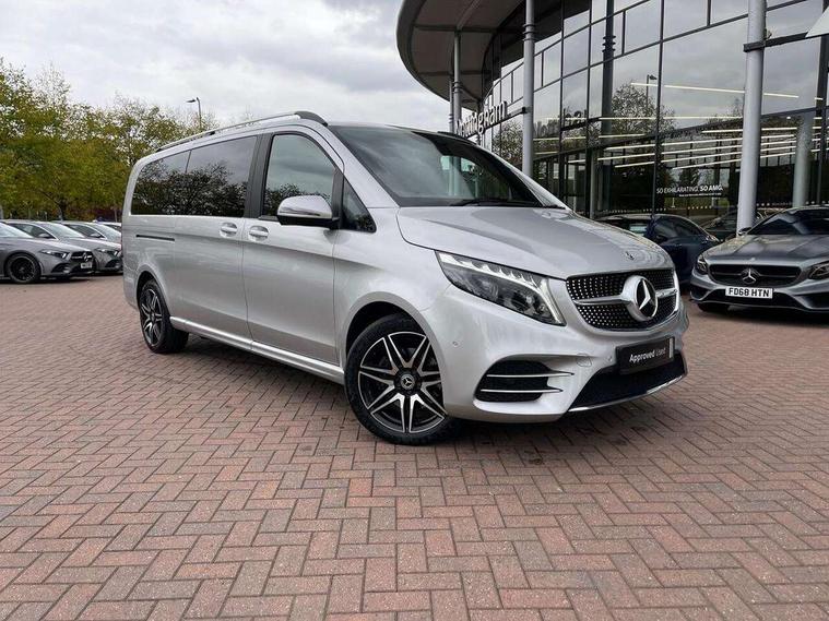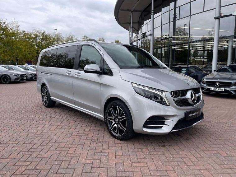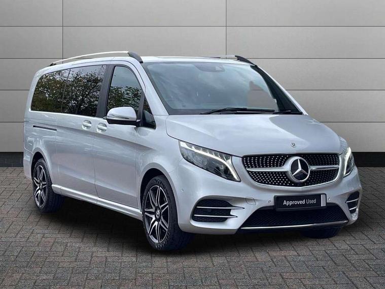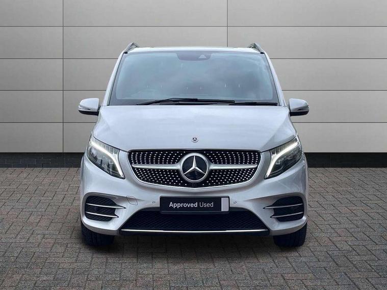 Active parking assist, Agility select with a choice of driving modes (Comfort, ECO, Sport, Individual), Attention assist, Brake wear warning display, Cruise control with speedtronic variable speed limiter, Direct steer speed sensitive steering, Easy-pack tailgate - Powered opening/closing automatically, ECO start/stop function, Instrument cluster with 5.5 inch colour display trip computer, MBUX multimedia nav with 10.25" touchscreen, Hey Mercedes intelligent voice control, 2 USB-C ports and mobile connectivity for up to 15 devices, MBUX personalised vehicle profiles, MBUX touchpad, Mercedes me connect including emergency call system, accident recovery, breakdown and maintenance management, Outside temperature display, Service indicator (ASSYST), Side wind assist system, Status display for rear seat belts in instrument cluster, 25 litres large AdBlue tank, 9G TRONIC 9 speed automatic transmission, Agility control comfort suspension, Diesel particulate filter, Audio 20 CD with integrated media interface, DAB Digital radio, Integrated radio aerial, iPod/iPhone + Bluetooth interface with handsfree function, Two USB ports and one SD Card slot in centre console, Adaptive brake lights, AMG bodystyling front apron and rear roof spoiler, AMG bodystyling front apron and rear spoiler, AMG bodystyling rear apron, AMG bodystyling side skirts, Anodised roof rails, Automated headlamp assist, Automatically dimming exterior driver's mirror, Black tinted rear windows, Body colour bumpers, Body colour door mirrors, Chrome pins diamond radiator grille with integrated stars, Chrome trim to front bumper, Electric folding door mirrors + auto dimming rear view mirror, Electric front windows, one touch / obstruction sensor, Electric sliding door in both side, Electric ventilation windows in passenger compartment, Heated windscreen washers, Illuminated front door sill panels with Mercedes-Benz lettering, LED intelligent light system including integral LED daytime running lamps, LED tail lamps/brake lamps and indicators, Logo projection, Metallic paint, Privacy glass, Rain sensing windscreen wipers, Rear wiper, Split tailgate in opening rear window with chrome handle, 12V socket in boot/load compartment and rear passenger compartment, 3 colours ambient lighting, 3 seat bench in 2nd row, 3 seat bench in 3rd row, 3 spoke nappa leather steering wheel, Adjustable front seat head restraints, ARTICO leather upper dashboard with contrast stitching, Carpet floor covering in passenger compartment, Comfort driver and front passenger seats including armrest, Driver + front passenger lumbar support, Electric air heater system - 1.2 kW output, Extended seat rails, Footwell lighting with reading light and illuminated handle in rear compartment, Height/reach adjustable steering column, Lockable glove compartment, Luxury centre console with retractable cover + two cup holder + 12V socket + multimedia box, Multifunction steering wheel with audio controls and onboard settings, Nappa leather upholstery, Rear head restraints, Seat occupancy sensor for front passenger seat, Single front passenger seat, Sports pedals in brushed stainless steel with rubber studs, Stowage nets behind individual seats, Sunvisors with illuminated vanity mirrors, Thermatic 3 zone automatic climate control, Three stage heated front seats, Seat comfort pack - V Class, Towing pack - V Class, Urban Guard protection pack - V Class, 3 point seatbelts on all seats, Active brake assist, Adaptive brake system with HOLD function and brake drying in the wet, Airbags - sidebag for driver and front passenger with combined thorax/pelvis bag, Airbags - windowbag for driver and front passenger, Anti-lock braking system (ABS), Electric parking brake, Electronic Stability Programme, Hill start assist, Perforated front brake discs and brake calipers with Mercedes-Benz lettering, Rear child proof door locks, Tyre pressure monitoring system, Warning triangle and first aid kit, Central locking with interior switch, Chrome surround electric key, Carbon look trim, Chrome air vent surrounds, 19" AMG 7 twin spoke alloy wheels, Space saver spare wheel with jack, Summer tyres,