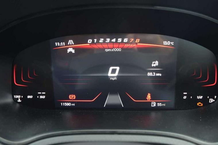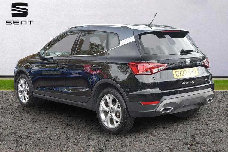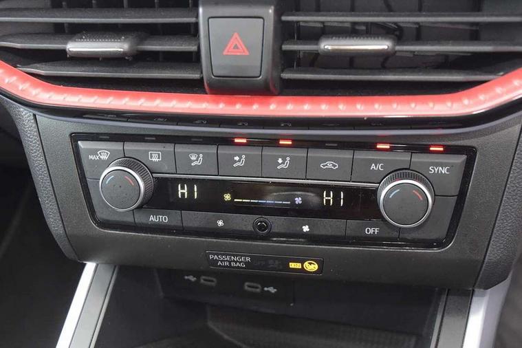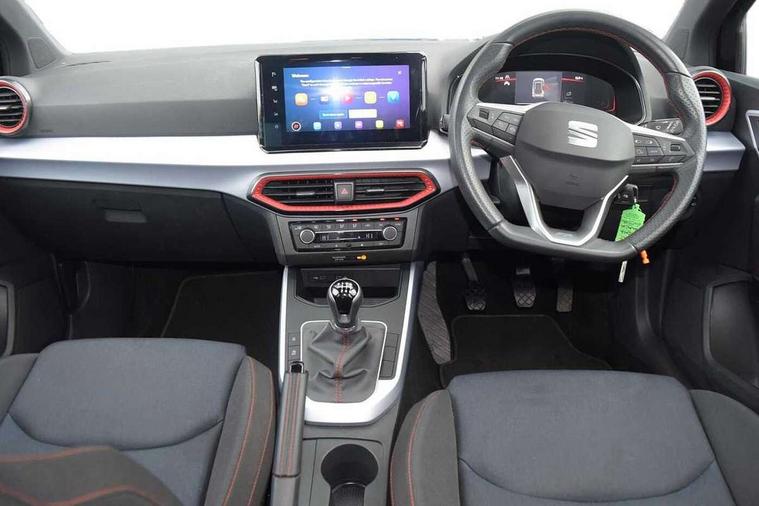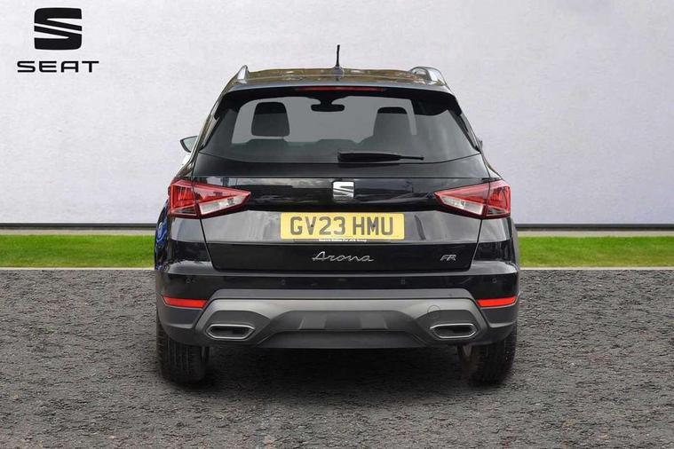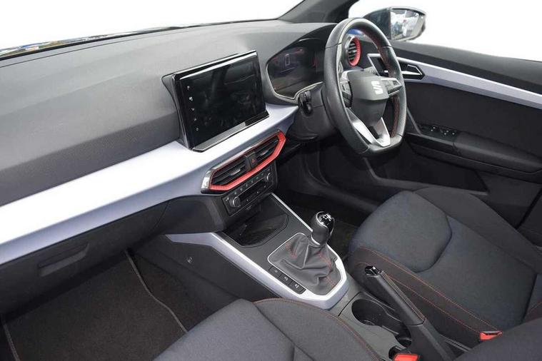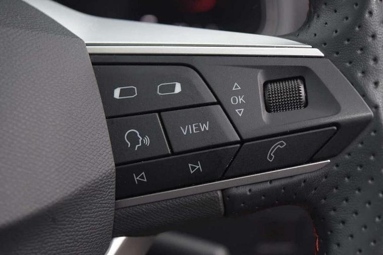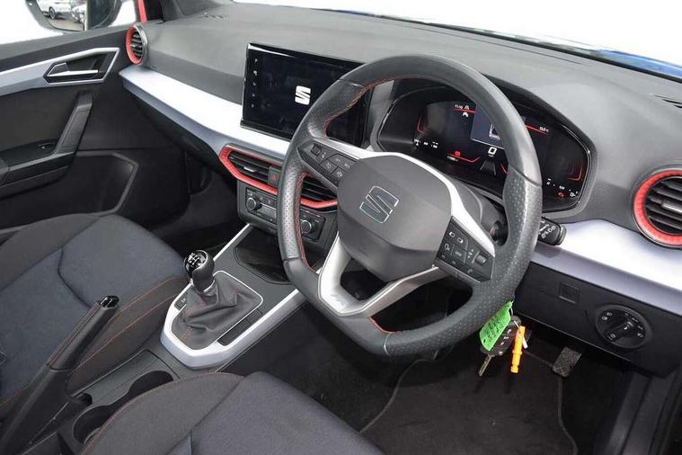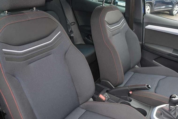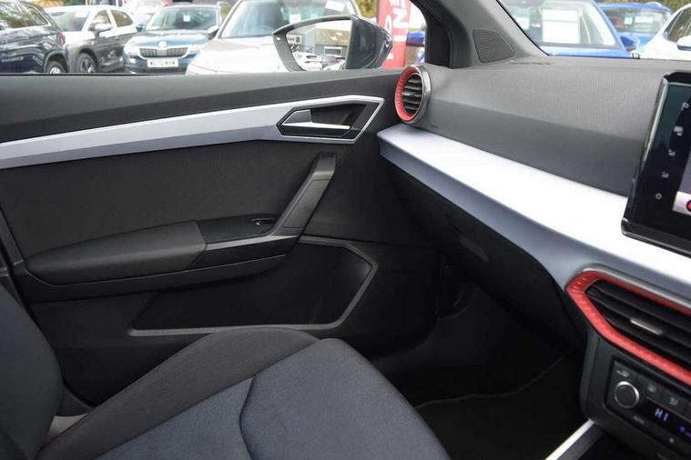 'Lights On' Reminder warning buzzer, 8" Digital cockpit, Digital clock, E-call, Electric speed sensitive power steering, Full Link Smartphone Integration with Mirror Link, Apple Car Play, Google Android Auto with USB Type C cable for Apple and Android compatibility, Lane keeping system, Low fuel warning light, Outside temperature display, Rear parking sensor, RPM counter, Seat connect with safety, service, remote and online, SEAT Drive profile - Four different models normal-sport-eco-individual, steering response, throttle response, Trip computer, Wireless phone charger, 9.2" colour touchscreen with navigation system, voice control and USB port (type c), Bluetooth interface for hands free and audio streaming, DAB digital radio and AM/FM radio, Steering wheel mounted audio controls, Anti theft roof antenna, Auto dimming interior rear view mirror, Automatic activation of hazard warning lights, Body coloured bumpers, Body coloured door handle inserts, Chrome roof rails and window surrounds, Dark tinted rear windows, Electric front/rear windows, Electrically adjustable, heated and folding door mirrors, Front fog lights with cornering function and rear fog light, FULL LED automatic headlights with dynamic headlight range control, coming and leaving home, LED daytime running lights, LED rear tail lights and licence plate lights, Protective side mouldings, Rain sensing wipers, Rear side wing doors, Rear spoiler, Rear window wash/wipe, Roof colour door mirrors, Third brake light, Twin exhaust pipe styling hidden exhaust pipe, Visible VIN plate, Windshield wiper with intermittent control and potentiometer, 2 cupholders, 3 seat bench in 2nd row, 60/40 split folding rear seat, Aircare filter, Black interior roof, Cloth upholstery, Double boot floor, Driver sunvisor with covered mirror + card holder, Dual zone climate control, Front courtesy light with front reading lights, Front sport seats, Gear shift indicator, Height adjustable front seats, Height/reach adjustable steering column, Illuminated boot, Instrument lighting with brightness control, Interior ambient lighting, Interior light in footwell, central console and door panel, ISOFIX points in outer rear seats with top tether anchorage points, Passenger sunvisor with vanity mirror, Perforated flat bottomed leather steering wheel/gear knob/handbrake with red stitching and FR logo, Single front passenger seat, Two front and three rear height adjustable headrests, Interior chrome pack - Arona, 3 point seatbelts on all rear seats, ABS, Active front headrests, Child locks on rear doors, Driver and front passenger airbags with front passenger airbag de activation, front side and curtain airbags, Electronic stability control, Emergency Brake Assist (EBA) and front assist, Front and rear seatbelt reminder, Hill hold control, Multi-Collision braking, Tiredness recognition system, Traction control, Tyre pressure monitoring system, Alarm with back-up horn, Electronic engine immobiliser, Locking wheel bolts, Remote central locking + deadlocks, Tow away protection, Titan black dashboard, 17" Dynamic alloy wheels,