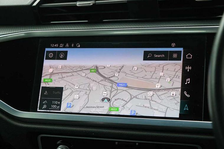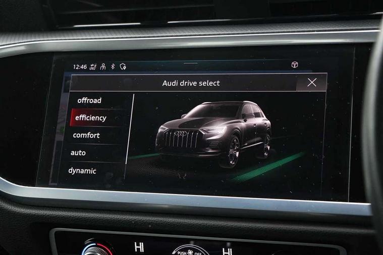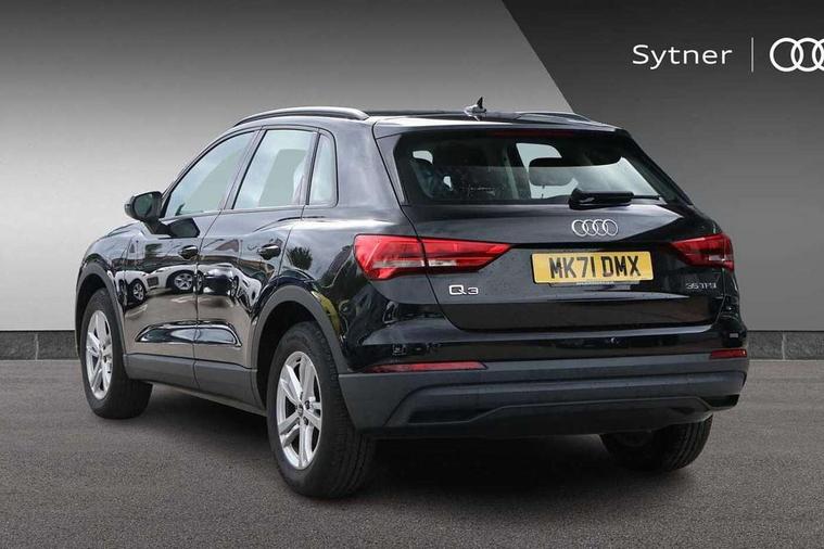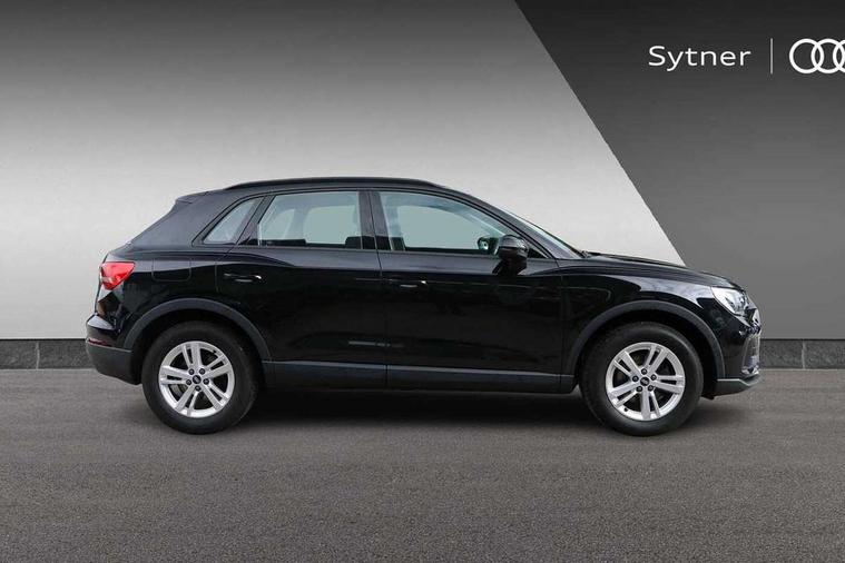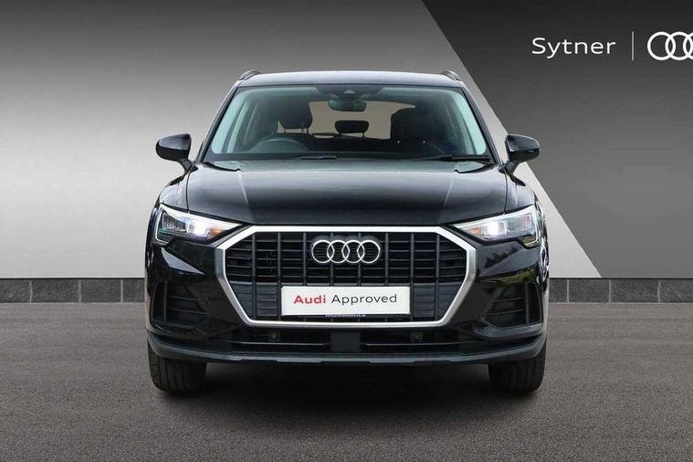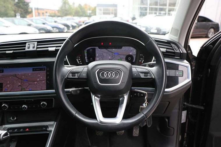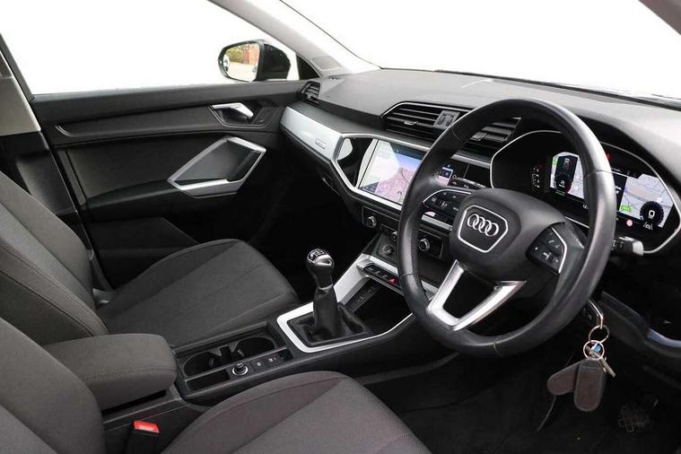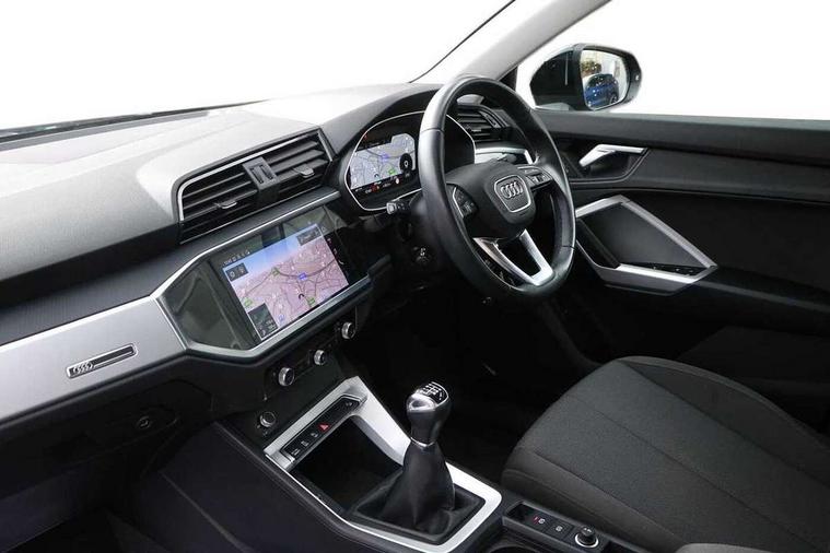 Amazon alexa Integration, Audi connect safety and service (e-call), Audi drive select, Audi lane departure warning, Audi Virtual Cockpit - 10.25" display, Bluetooth interface, Camera based traffic sign recognition, Cruise control + speed limiter, MMI Navigation Plus with high resolution 10.1 inch touchscreen colour display, Power operated tailgate, Progressive steering, Rear parking sensors, Service interval indicator, Smartphone interface includes wireless Apple carplay/Android Auto, Start stop system with recuperation, Voice control system with natural language interaction, Standard suspension, 2 USB-C ports with charge and data functions, 6 passive loudspeakers, DAB digital radio module, Acoustic windscreen, Auto dimming frameless rear view mirror, Black roof rails, Body colour door mirrors, Diffuser in grained anthracite, Electrically folding, adjustable and heated door mirrors with integrated LED side indicators and kerb view function for passenger side, Exterior bumper with wheel arch trims and side sill trims in grained black matt, Front and rear electric windows, Grained radiator protective grille, Halogen rear lights, LED headlights with LED daytime running lights, Rain and light sensors, 12V socket in rear centre console, 3 spoke multi-function leather steering wheel, 40:20:40 folding with manual adjustment for 60:40 forwards/backwards position and backrest angle, Dual zone electronic climate control, Front and rear floor mats, Front and rear headrests, Front and rear roof module including reading lights, Front centre armrest, Glove compartment lighting, Height and reach adjustable steering wheel, ISOFIX child seat mounting for front passenger with airbag deactivation and outer rear seat including top tether attachment point for outer rear seats, Luggage compartment light, Lunar silver cloth headlining, Manual front seats with height adjustment, Stainless steel luggage compartment sill finisher, Non smoking pack - Q3, 3x3 point rear seatbelts, 6 airbags - Driver, front passenger, curtain and side windows, Audi pre-sense front with pedestrain and cyclist recognition, Electrically operated child locks on rear doors, Electromechanical parking brake, Electronic stabilisation control including ABS, ASR and EDL, Hill descent control, Hill hold assist, Pre sense basic, Seatbelt monitoring, Tyre pressure warning, Warning triangle and first aid kit, Anti theft alarm, Anti theft wheel bolts, Remote central locking, Detail dashboard around MMI touch colour display in glass look, black with surround in aluminium look, Micrometallic silver inlay, 17" 5 twin spoke design alloy wheels,