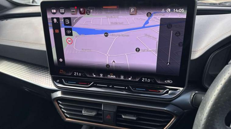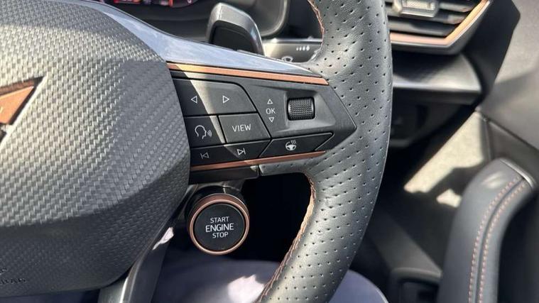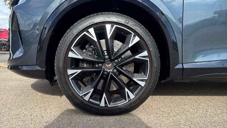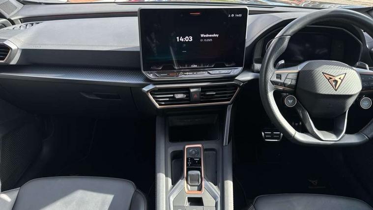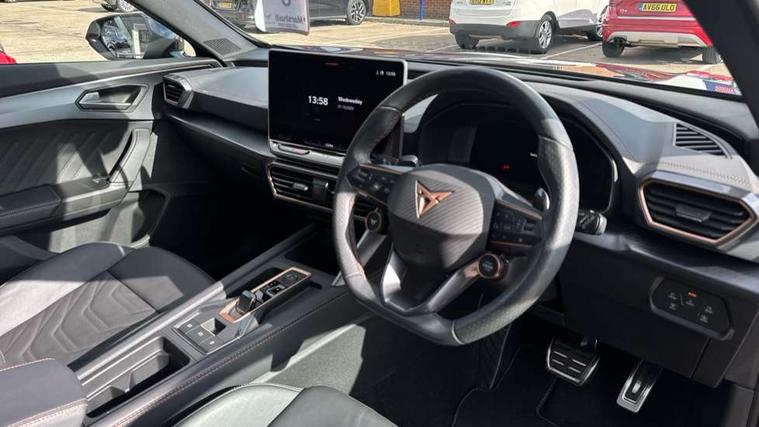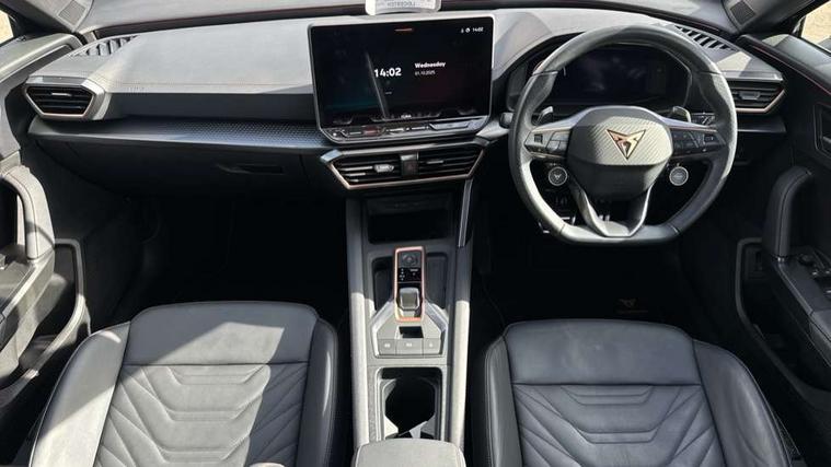 10.25" digital cockpit and configurable dashboard, Adaptive cruise control with follow-to-stop and speed limiter, Advanced driver alert system, Advanced lane assist with semi-automatic vehicle control in a medical emergency and traffic jam assist, Dynamic chassis control with driving profile selection (Comfort, Sport, CUPRA, Individual), Dynamic road sign display, Emergency steering support with turn assist, Forward collision warning with automatic braking, Full link phone integration, Intelligent park assist, RPM, trip computer, outside temp gauge, instrument light brightness, low fuel warning light, lights on reminder, gearshift indicator, Service interval indicator, Side and exit assist, Speed sensitive power steering, Start/stop system with regenerative braking, Top view camera, Virtual pedal and electric tailgate, Voice control system, Wired Android Auto, Wireless apple carplay, Wireless phone charger, Adaptive chassis control with continuous operation, CUPRA sport suspension, Electronic locking differential and dynamic traction support, 2 front and 2 rear USB type C sockets, Media system with navigation, 12.9" touchscreen display, voice control, DAB, steering wheel mounted controls, Auto dimming rear view mirror, Body colour door handles, Body coloured bumpers, Dark grey wing mirror, Daytime running light with automatic headlight control and coming home feature, Door panel ambient lighting, Dynamic headlight range control, Electric front/rear windows, Electrically adjustable heated and folding door mirrors with memory function, Gloss black roof rails and window surrounds, High beam assist, LED 3rd brake light, LED front fog lamps with cornering function, LED Taillights with dynamic indicator, Matrix LED headlights with multifunction camera, Rain sensing wipers, Rear diffuser with twin exhaust pipe on each side, Rear fog lights, Rear side wing doors, Rear wash/wipe, Tinted rear windows, Welcome lights (within exterior mirror housing), 12V socket, 2 front and 2 rear reading lights, 3 seat bench in 2nd row, 60/40 split rear bench seat with armrest and mechanical seat release, Black headlining, Black interior roof lining, Cupra sports pedals, Dust/pollen filter, Electrically adjustable front seats with lumbar support and memory function, Front and rear head restraints, Front centre armrest, Heated front seats, Heated supersports multifunction leather steering wheel with satellite buttons and gear shift paddles, Height/reach adjust steering wheel, Illuminated aluminium doorsteps, Illuminated interior front door sills, Illuminated sunvisor with mirror, Isofix, Leather dashboard, door insert and side trim panel, LED smart wraparound lighting, PVC/Leather upholstery, Satellite steering wheel, Single front passenger seat, Storage pockets on rear of front seats, Three zone climate control with control panel in rear, Variable luggage/load compartment floor, 3 point seatbelts on all rear seats, ABS, Brake control system - ESC and brake booster, Child proof door locks, Driver and front passenger airbags with front passenger airbag de-activation, Electronic parking brake, Front and rear disc brakes, Front side curtain airbags, Hill hold control, Pre-crash front and rear seat belt tensioner, window closure and hazard lights, Public e-call, Seat belt reminder for front and rear seats, Tyre pressure monitoring system, Anti theft alarm system, KESSY Advanced - Keyless start, keyless entry with SAFELOCK, Locking wheel bolts, Copper and aluminium interior detailing, 19" Artic machined sport black and silver alloy wheels, Breakdown and tool kit,