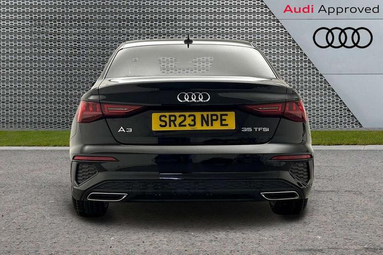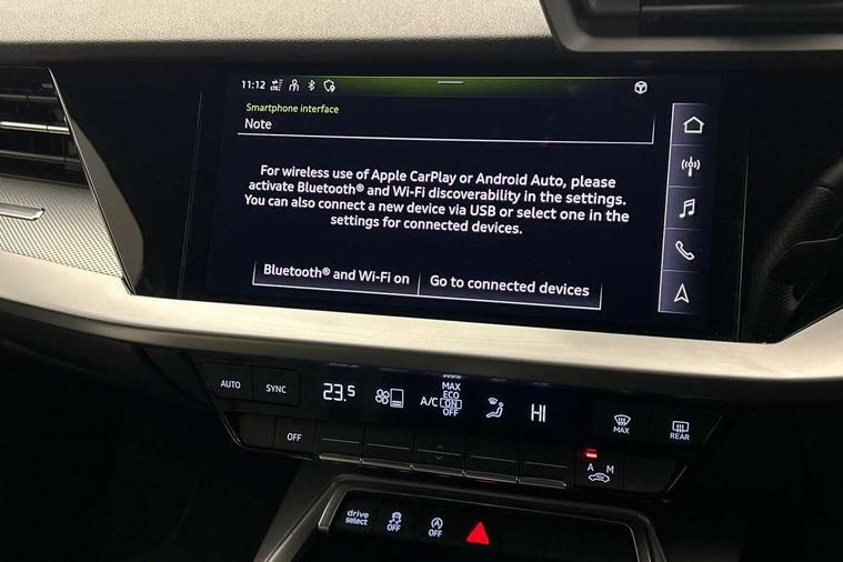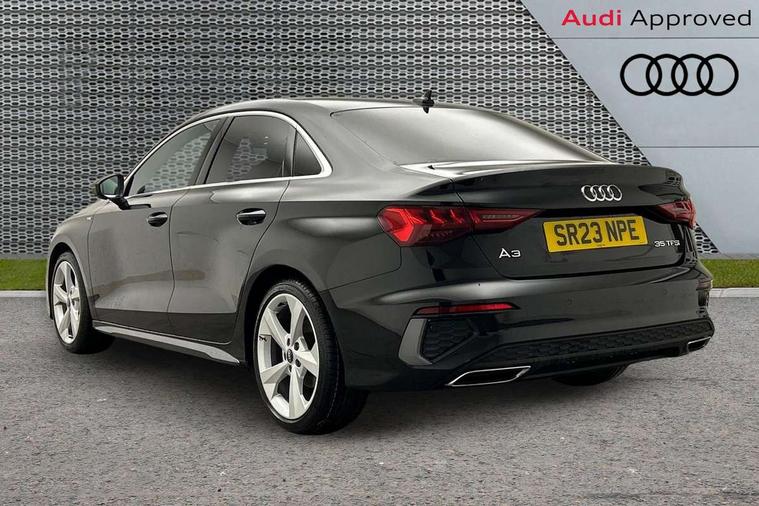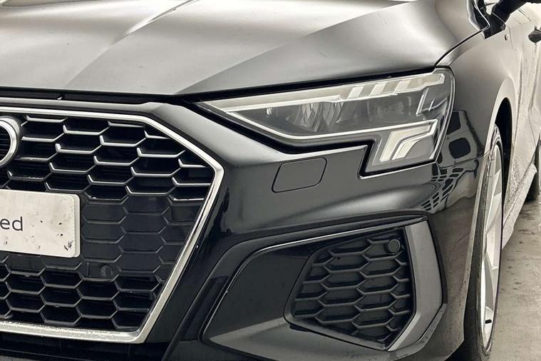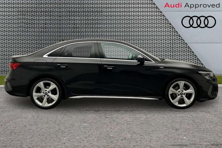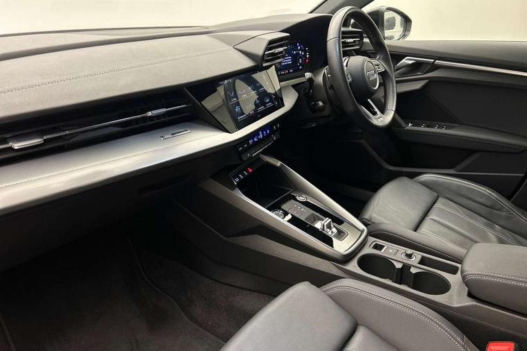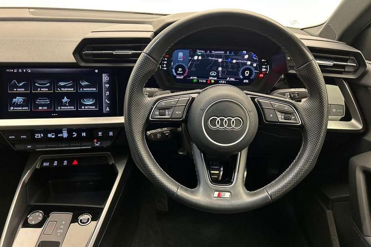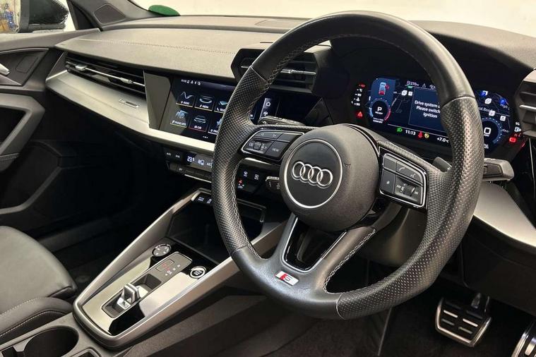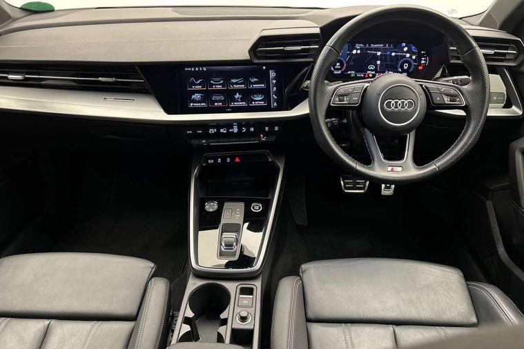 Audi connect emergency call and service, Audi drive select (Auto, Comfort, Dynamic, Efficiency and Individual), Audi smartphone interface, Audi Virtual Cockpit - 10.25" digital and colour instrument cluster, Automatic start/stop system with recuperation, Bluetooth interface, Collision avoidance assistant, Electromechanical power speed sensitive steering, Lane departure warning system, MMI Navigation Plus with high resolution 10.1" colour touch screen display, Service indicator, Voice control system with natural language interaction, Sports suspension, 2x USB Type C ports (for charging and data transfer), 6 passive loudspeakers, CD player, DAB Digital radio, 3rd brake light, Acoustic glass windscreen, Aluminium window trim, Auto dimming frameless rear view mirror, Body colour exterior mirrors, Electrically adjustable/heated/folding/auto dimming door mirrors with integrated LED indications + kerb view function for passenger side, Front electric windows, Illuminated door sills with aluminium inserts at the front with S logo, LED daytime running lights, LED headlights with LED rear lights and dynamic rear indicators, Light and rain sensors, Model and engine designation badges at rear, Privacy glass - dark tinted rear window, rear door and side windows, Rear boot, Rear electric windows, Rear side wing doors, S line bumpers, S roof spoiler, 12V socket and storage compartment in front centre console, 3 seat bench in 2nd row, 3 spoke leather multifunction steering wheel with gear shift paddles, 40/20/40 split folding rear seat bench with cupholder, Black cloth headlining, Dual zone electronic climate control, Front and rear centre armrest in leather, Front and rear headrests, Front/rear floor mats, Height and reach adjustable steering wheel, Illuminated vanity mirror, Interior lighting - glove compartment light and right hand side, Luggage compartment floor covering, Manual boot compartment lid, Manually adjustable front sport seats, Seat side bolsters, Single front passenger seat, Stainless steel pedals and front footrest in black, Twin leather upholstery with front sports seats S embossed logo, Aluminium interior elements pack - A3, LED interior lighting pack - A3 Saloon, S line styling pack - A3 Saloon, 3x3 point rear seat belts, Driver and front passenger airbag with passenger airbag deactivation, Electronic Stabilisation Control (ESC) including ABS, ASR and EDL, First aid kit with warning triangle and 2 safety vests, Front side airbags with head airbags and interaction airbag, Hill hold assist, Pre-sense front with pedestrian and cyclist detection, Seatbelt monitoring, Tyre pressure loss indicator, Anti theft alarm, Anti-theft wheel bolts, Electronically operated child locks, Immobiliser, Remote control central locking, Aluminium air vent surrounds, Aluminium trim elements, Dark spectrum aluminium inlays, accent surfaces in the dashboard and centre console in platinum grey silk effect paint finish,