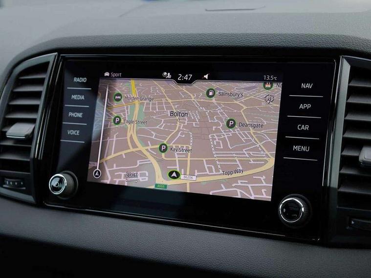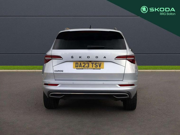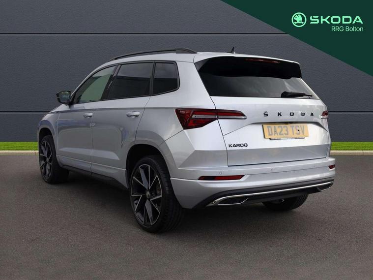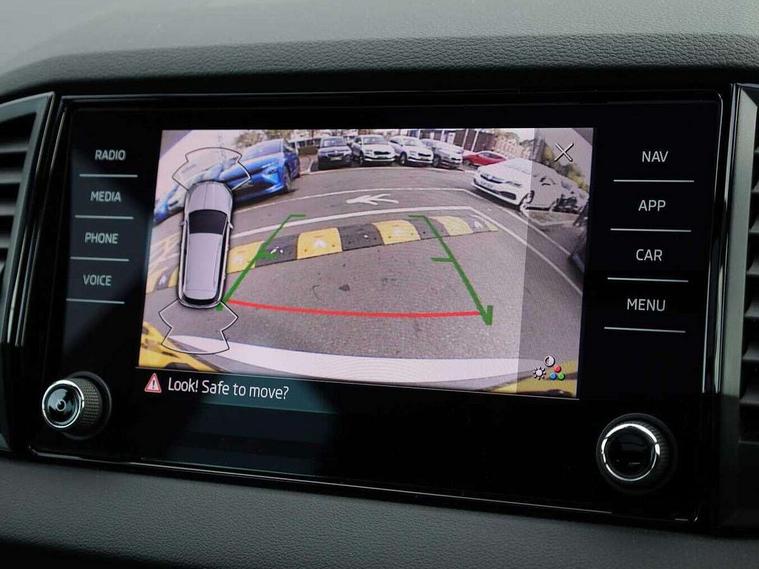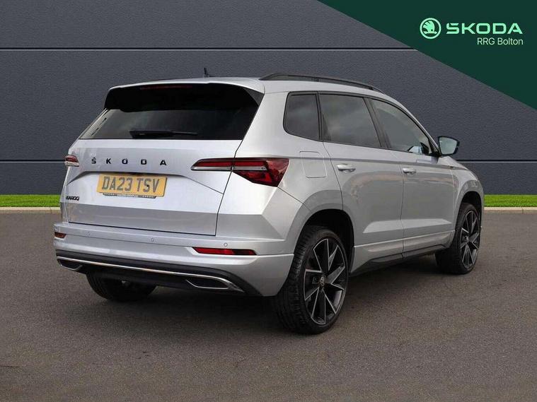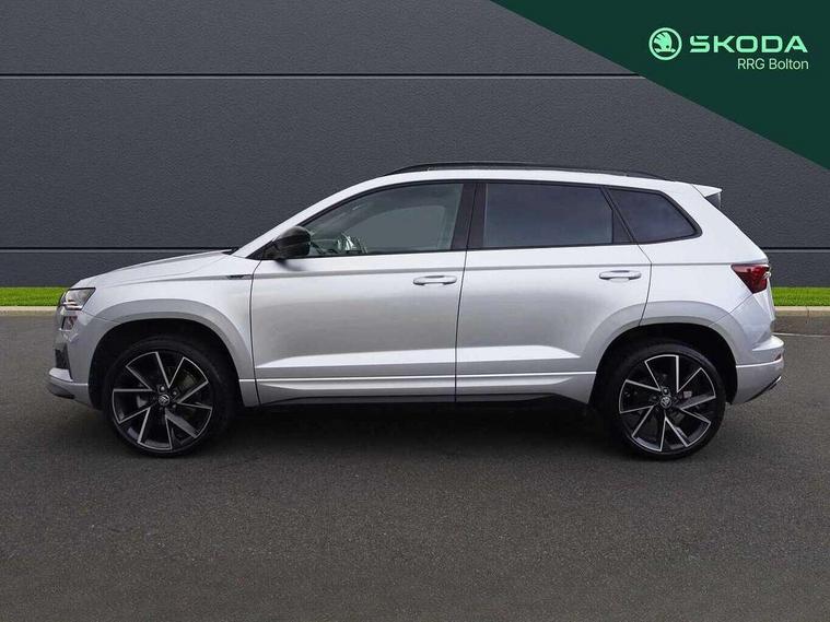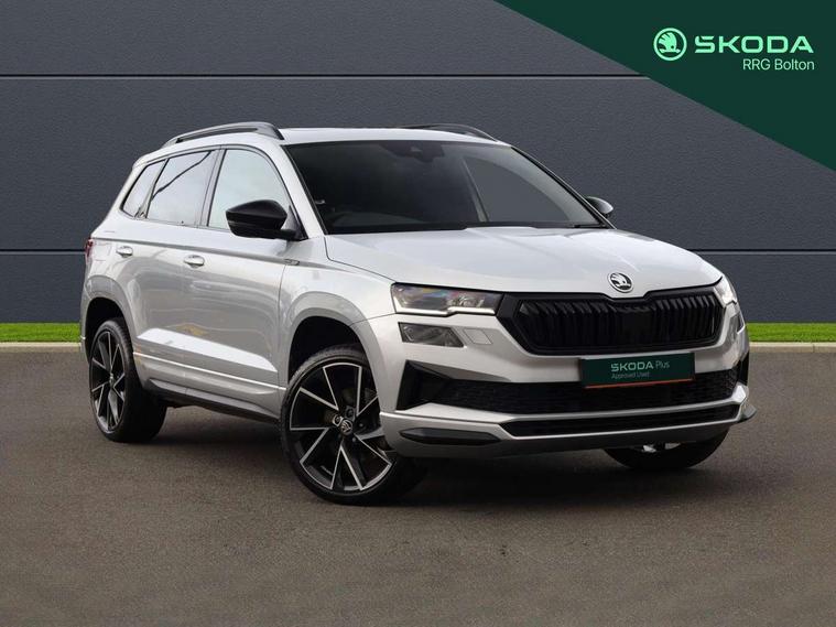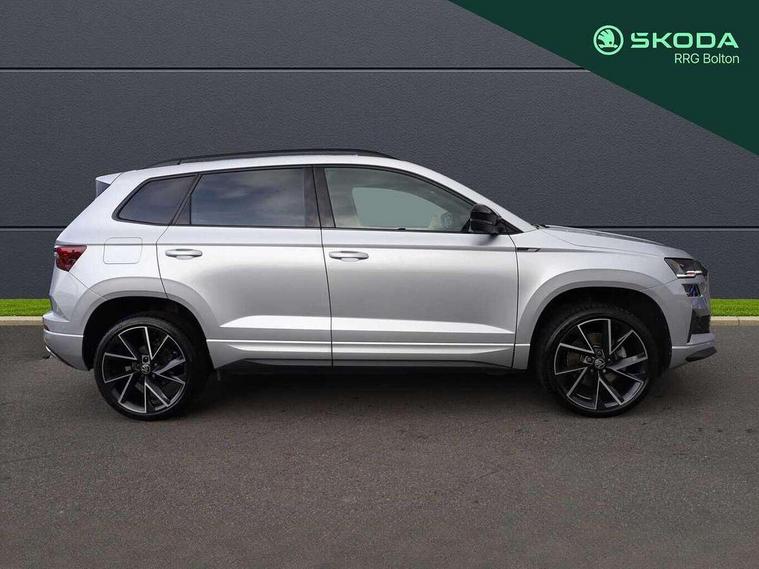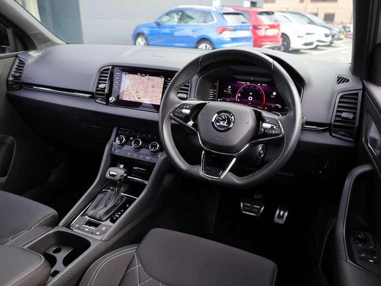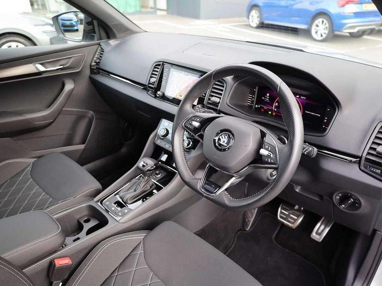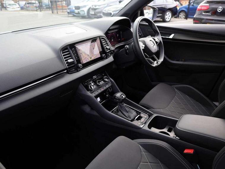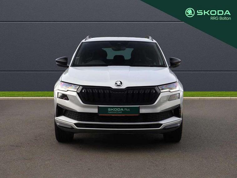8" Digital display, Care connect, Driver fatigue sensor, Emergency services call system, Outside temperature gauge, Service interval indicator, SmartLink wireless for Apple and wired for Android, Start/stop system with regenerative braking, USB C Port x 2 in front centre console, Virtual cockpit, Virtual pedal with electrically operated boot door, 8 Speakers, DAB radio with Bluetooth, USB connection, Wireless charging without wireless aerial connection, Acoustic glass, Aero front windscreen wipers with intermittent function, Auto dimming rear view mirror with light and rain sensors, Black door mirrors, Black electric window control buttons, Black radiator grille, Black roof rails, Body colour door handles, Dynamic headlight range control with cornering light function, Electric front and rear windows with child proof lock, Front door steps with SportLine logo, Heated rear windscreen, LED daytime running lights, LED rear lights with high functionality welcome effect and dynamic indicators, Light assistant (coming/leaving home/tunnel light), Panoramic sliding sunroof, Plastic scuff plates, Privacy glass, Protective door side sills in body colour, Rear diffuser, Rear side wing doors, Rear spoiler, Rear window wiper with washer system and intermittent control, Safety reflectors on front doors, Skoda lettering on tailgate in black, Sportline badge on front fender, Sportline decorative inserts with badging, Sports front and rear bumpers, 1.5 litre bottle holders in driver and front passenger door panels, 12V socket in boot, 12v socket in front centre armrest with storage compartment and rear air vents, 3 rear height adjustable headrests, 3 seat bench in 2nd row, 3 spoke leather sports multifunction steering wheel and silver stitching with gear shift paddles, 4 foldable roof handles with rear coat hooks, Black floor carpet, Black roof headlining, Chrome inner door handles, Double sided boot floor, Foldable hooks in the boot, Front head restraints, Height adjustable front three point seats belts with tensioners, Height/reach adjust steering wheel, Ice scraper, Illuminated glovebox, Illuminated luggage compartment, Isofix child seat preparation outer rear, Manual lumbar support for front seats, Pen holder, Pollen filter, Rear boot cover, Rear reading lights, Rear seats fixed folding and divided 60:40, Rubbish bin door, Safety vest holder, Single front passenger seat, Storage box in upper central dashboard closed, Sunvisors with illuminated vanity mirrors, Textile floor mats, Ticket holder, Titan black interior ceiling, Welcome animation with sportline logo, Boot pack - Karoq, Light Pack - Karoq, Parking pack - Karoq, Automatic door unlocking in case of crash, Automatic fuel cut off in case of crash, Child locks on rear doors, Driver airbag, Electronic parking brake with auto hold function, Emergency rear braking signal, ESC including ABS, MSR, ASR, EDS, HBA, DSR, RBS, MKB and traction control, Front side airbags, Hill hold control, Knee airbags, Passenger airbag with switch-off function, Pedestrian monitor, Seatbelt reminder signalisation and pretensioner for all seats, Three point seatbelts rear, Two tone horn, Tyre pressure display, Tyre pressure monitor, Alarm with interior monitoring, back up horn and tilt sensor with safe function, Electronic engine immobiliser, Keyless entry and start/stop, Remote central locking with 2 remote folding keys, Black air vent surround, Black centre console, Satin black dashboard, Satin black door trim, 19" Vega black polished alloy wheels, Anti-theft wheel bolts protection, Matt black aero hub caps, Storage on wheel cover, Tool kit,