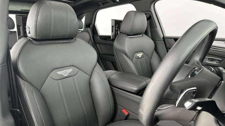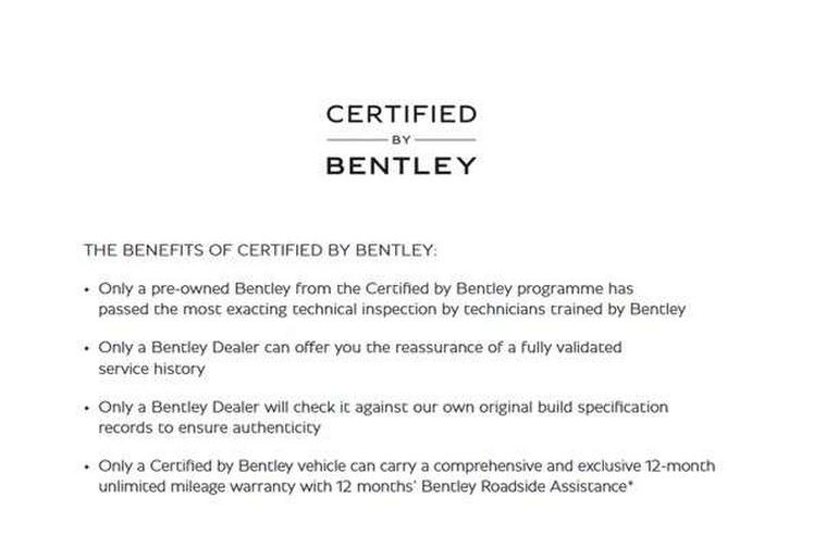 10.9" touch screen high resolution and configurable infotainment display and digital drivers information display, Advanced navigation function with text, search, 3D, satellite maps, speed limit, dynamic traffic route guide, telephone, Text-speech + voice, Bentley branded clock, Bentley GPS tracking system full fitment, Bentley safeguard, Blind spot assist, Bluetooth and WIFI enabled, Emergency services call system, Four drive dynamics modes (bentley, comfort, sport, custom), Front/rear park distance control, Hands free power tailgate, MMI Screen, My Bentley connected car services, Power latching to all doors for easy entry, Redesigned instrument panel lower trim rolls, incorporating a storage compartment on the passenger side, Seamlessly integrated technology with wireless apple car play and android auto, Speed sensitive variable ratio electric power steering, Touch screen remote, Voice control system, Wireless phone charging compartment, Air suspension with continuous damping control, Permanent all wheel drive with centre torsen differential, Bluetooth audio streaming, 3rd brake light, Auto dimming rear view mirror, Automatic headlights, Bentley badge in tailgate opening switch, Black painted shark fin aerial, Body colour door mirrors, Body coloured lower bodywork - Standard paint range, Bumper design with large side intakes and sculptured surfaces, Clamshell rear tailgate design with Bentley lettering under the wings, Elec/heat/adj/fold door mirror+memory, Electric tilt/slide panoramic sunroof, Fender design reduces over bodied perception, Fixed rear spoiler, Front and rear fog lamps, Full LED supplementary lamps and tail lamps, Full matrix LED headlamps with high beam assist, Full width clamshell design and deeply contoured rear tailgate panel, Heated rear windscreen, Large dominant B shaped side wing vent front position, LED daytime running lights, Long fender vent above the power line on body side, Lower door side mouldings, Number plate aperture position under rear bumper, Oval split tailpipe, Phone antenna amplifier, Rain sensing wipers, Rear side wing doors, Rear wiper, Self levelling wheel badge, Trailer sway mitigation, Tunnel detection for auto light control, V8 exterior badge, Wet arm wipers and heated water jets, 12V power in rear centre console, 12V socket in glovebox, 12V socket in luggage compartment, 2 seat bench in 3rd row, 4-Zone HVAC, Air Ioniser, Black (Beluga) boot carpet, Electric tilt and reach adjustment steering column with memory and easy entry function, Electronic accessory preparation, Fluted seat design, Foams and cover design on all seats, Folding luggage compartment cover, Front and rear cupholders, Indented steering wheel, Isofix attachments on outer rear seats, Key box, Leather trimmed gear lever, Load through facility, Lockable cooled glovebox, Luggage rails, Rear head restraints, Rear seat climate control, Rear seat massage function, Single front passenger seat, Stowage with instrument panel, doors (front and rear), armrests and console, Twin front armrests, Two metal bulls eye vents with organ stops and redesigned centre vents, Two type C USB ports front and rear, Wing pockets for small items, 7 Seat Specification - Bentayga, 2nd and 3 rd row rear seatbelts, ABS/EBD, Child safety lock, EDL, Electronic park brake with move-off assist, Electronic stability control, Electronic tyre pressure monitoring, ESP + MSR + ASR, Exit warning, Front and rear head airbags, Front and rear thorax airbag system, Front passenger airbag deactivation, Front seatbelt pretensioners with force limiters, Hill descent function, Hydraulic Brake Assist (HBA), Rear outer seatbelt pretensioners with force limiters, Rollover mitigation, Side airbags, Traction control, Immobiliser, Keyless entry, Keyless ignition, Preparation for vehicle tracking, Remote central locking, Volumetric anti theft alarm, Veneered centre fascia panel,