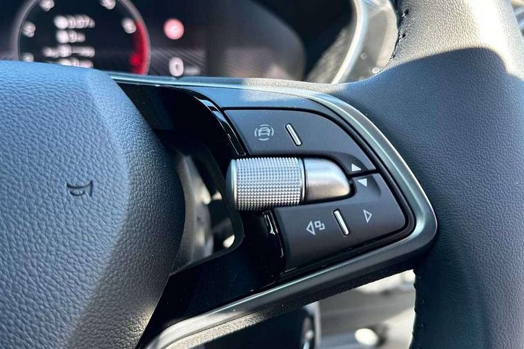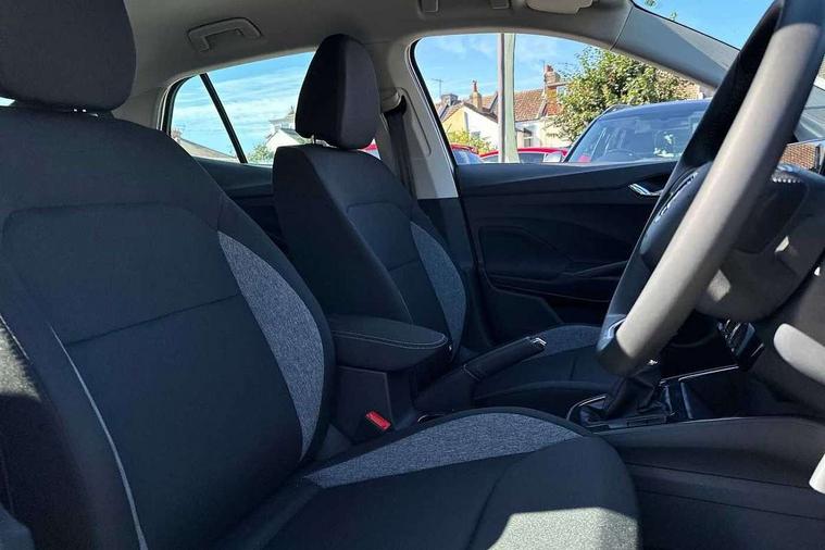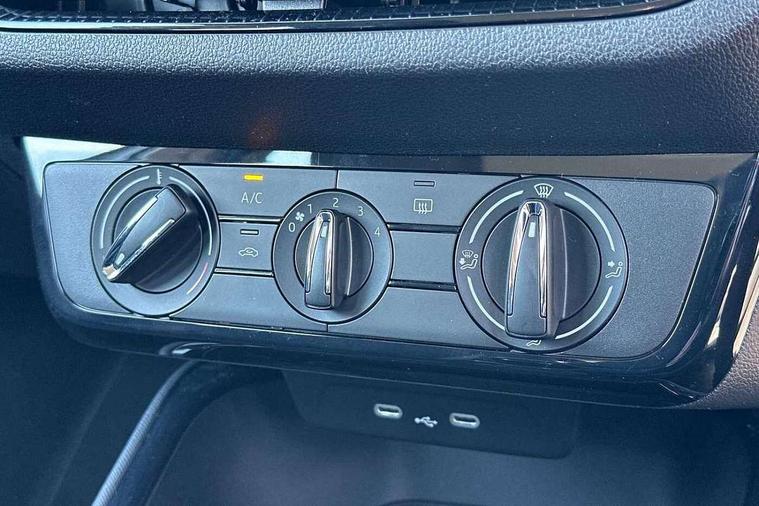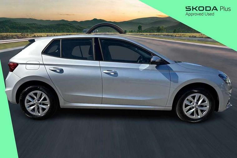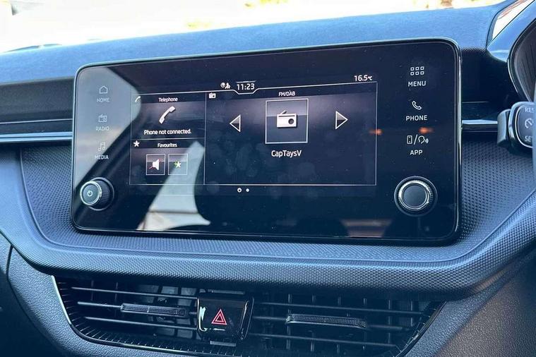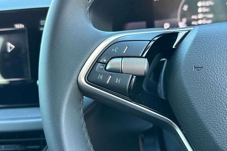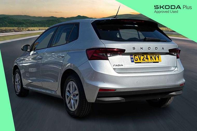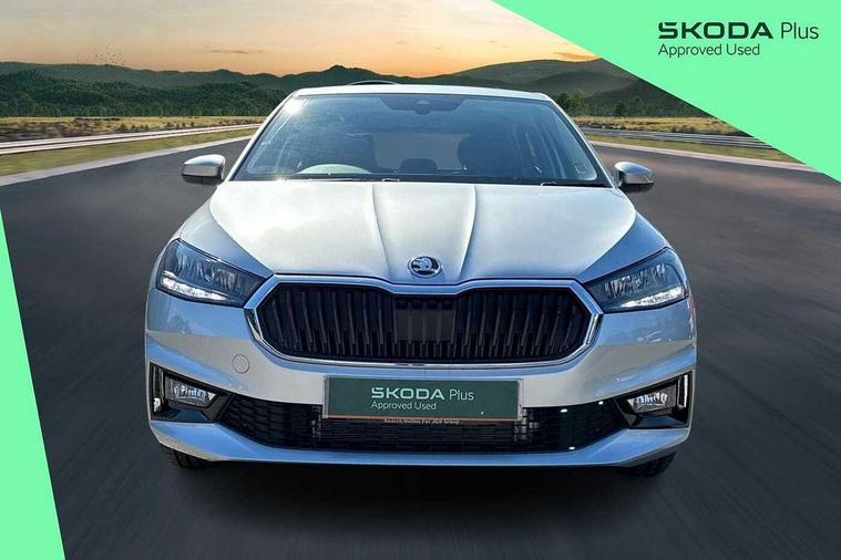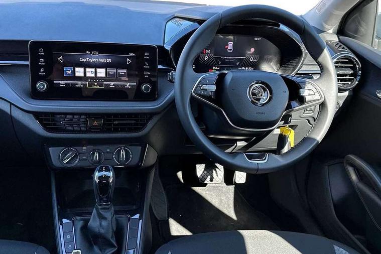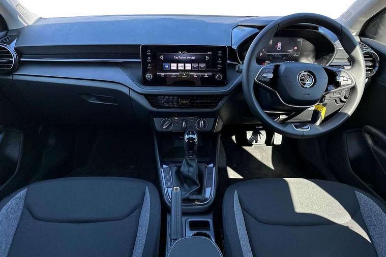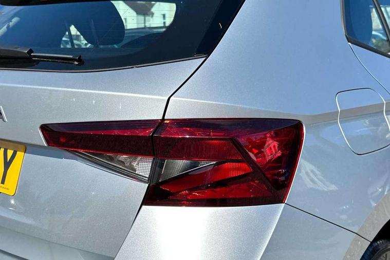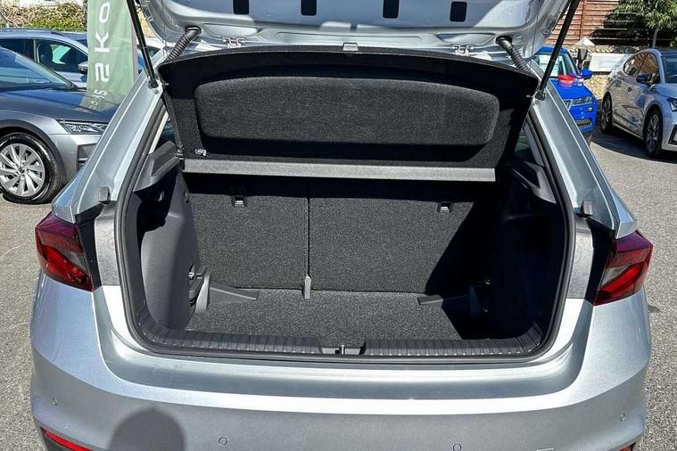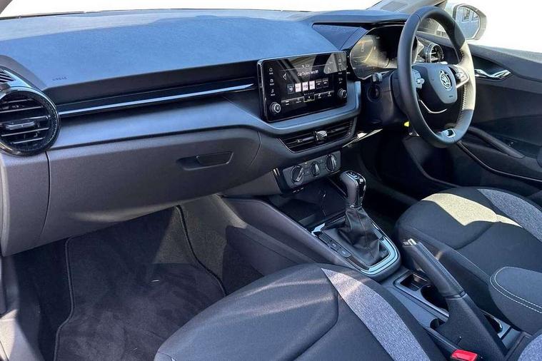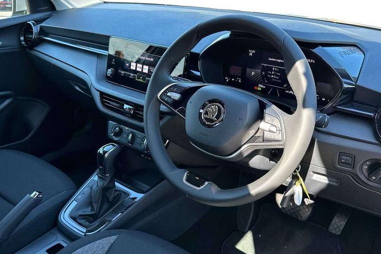 8" Digital instrument display, Advanced driver attention and drowsiness monitor, Bluetooth connection, Electromechanical power steering, Exterior temperature gauge, Lane assist including road edge detection, Rear parking sensors, Service interval indicator, Speed limiter, Traffic sign recognition, Wireless SmartLink for Apple CarPlay and Android Auto, 2x USB-C in the front (for data transmission and charging), 6 speakers (4 speakers/2 tweeters), 8.25" Skoda infotainment touchscreen display, Auxiliary socket for external MP3 player, DAB digital radio reception, Basic LED Headlights, Basic rear lights, Body colour door mirrors, Body coloured bumpers, Dimming rear view mirror with black frame, Door mirror integrated indicators, Electrically adjustable and heated door mirrors, Electrically adjustable front windows with function auto up/down, Front fog lights, Front window wiper intermittent control, Headlight range control - Automatic, Ice scraper in fuel cap, LED daytime running lights with coming and leaving home feature, Mechanical adjustable rear windows, Rain sensor, Rear LED fog light, Rear side wing doors, Rear window wiper with washing nozzles, Roof mounted spoiler, SKODA tailgate lettering in chrome, Third brake light, 2 reading lights in front and 2 reading lights in rear, 2 spoke leather multifunction steering wheel, 3 rear headrests, Backrest split and folding, Central console with removable cup holder and storage box, Chrome handbrake release button, Fabric upholstery, Front centre armrest, Gearshift knob/handle in leather, Grain satin black interior door handles, Hand brake lever handle in leather, Height adjustable driver seat, Height adjustable front headrests, Height adjustable steering wheel, ISOFIX and TopTether anchorage points to the outer rear seats, ISOFIX and TopTether on the front passenger seat, Luggage compartment lighting, Manual air conditioning, Pollen filter, Rear seat bench unsplit, Single front passenger seat, Storm grey headlining, Sun visors with mirror and airbag label on passenger side, Textile floor mats, Ticket holder, 3-point height adjustable front seats belts with pretensioner and force limiter, Automatic warning lights in case of crash, Driver and passengers airbag with switch off function, e-Call+, ESC including ABS, MSR, ASR, EDS, HBA and XDS, Front and rear seat belt warning, FRONT ASSIST (AEB City and AEB Inter Urban), Front side airbags, Head airbags, Hill hold control, One tone horn, Pedestrian protection, Three rear 3-points safety seat belts with pretensioner and force limiter including stop function for outer rear seat belts, Tyre pressure monitoring system, Anti-theft alarm system including immobiliser, interior monitoring, backup horn, and towing protection, Central locking with radio remote control, interior controls, SAFE function and 2 foldable keys, Black painted air vents, Glossy black decorative trim, Grain satin black central console cover, Grain satin black lower decorative trim, Satin black door and side trim panel in front, Anti-theft wheel bolts protection, Super-low rolling resistance tyres,