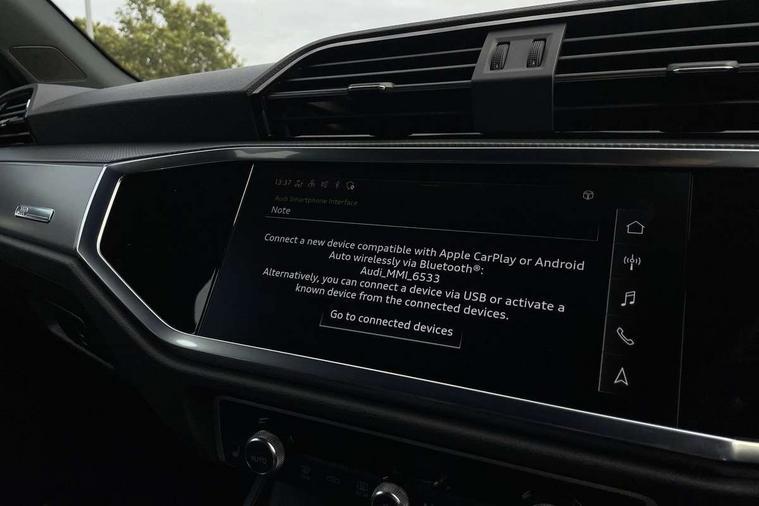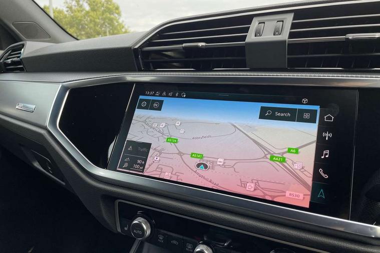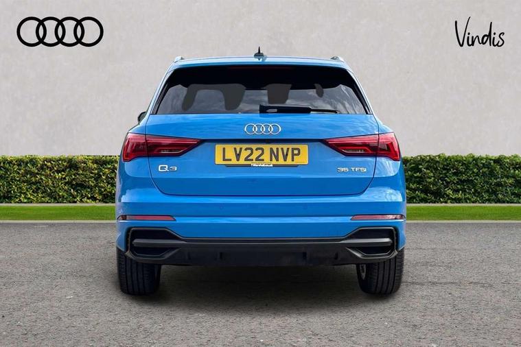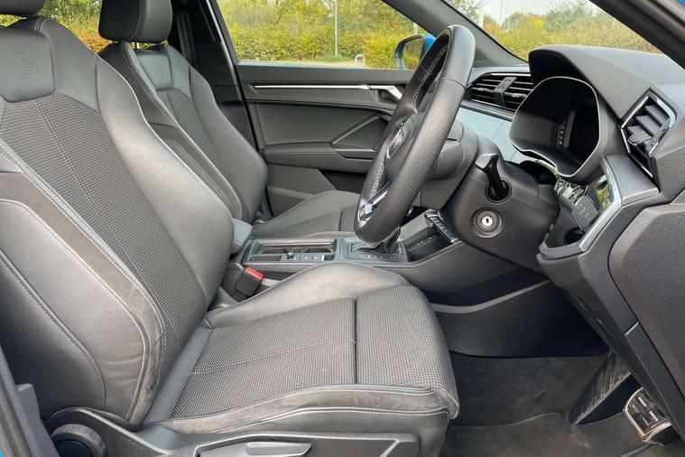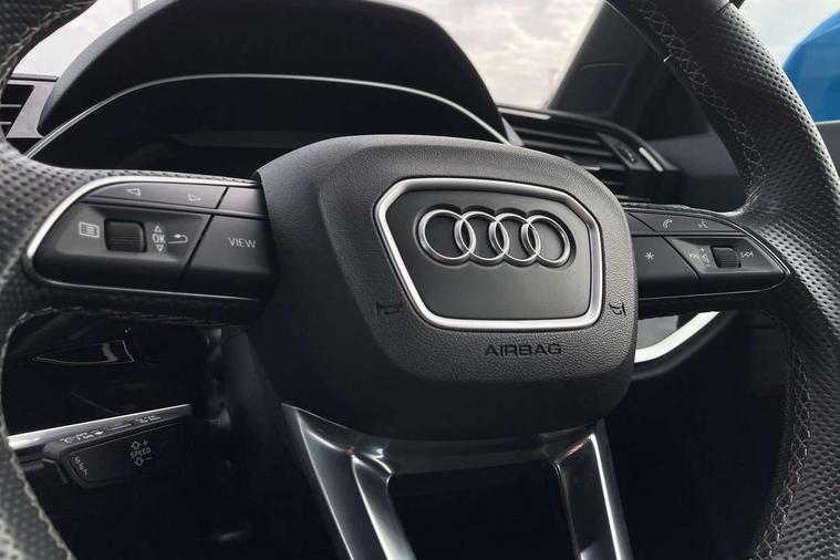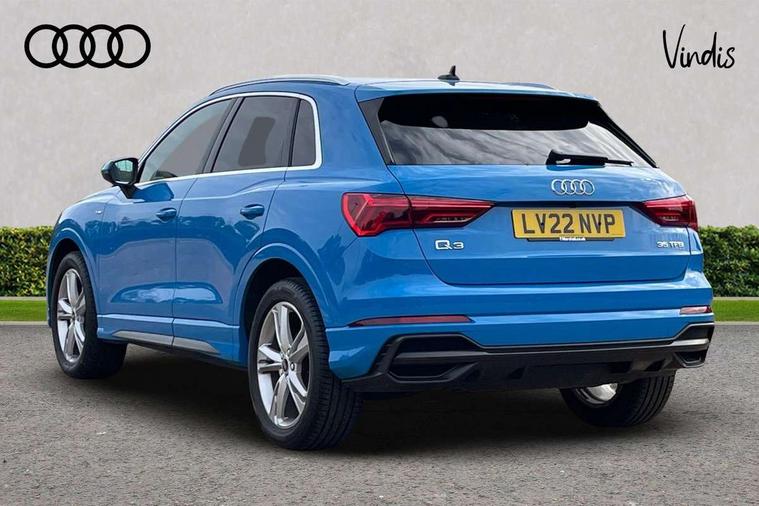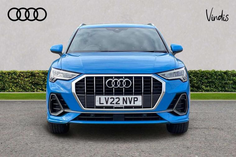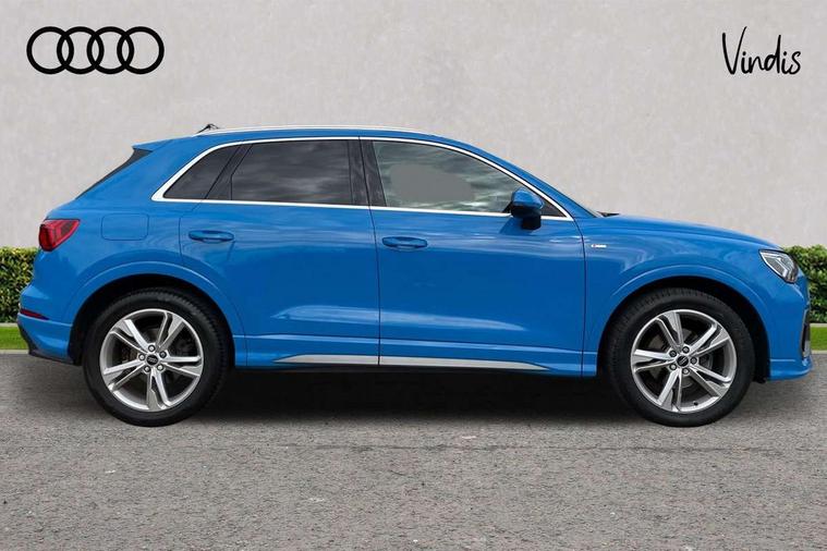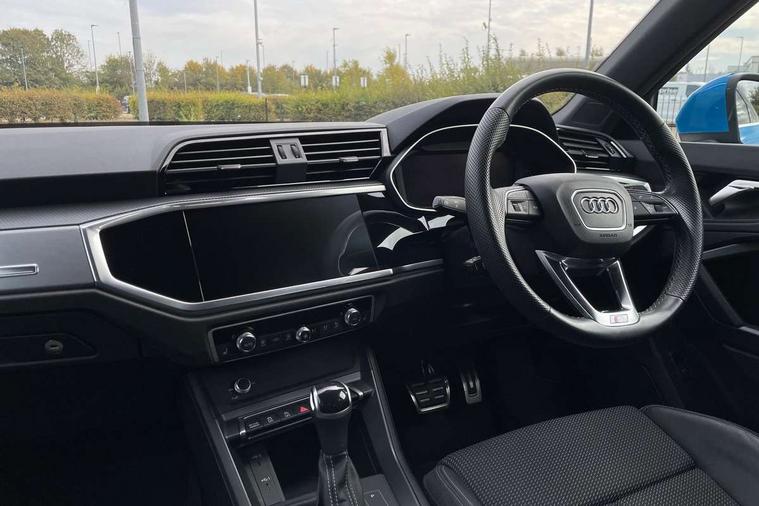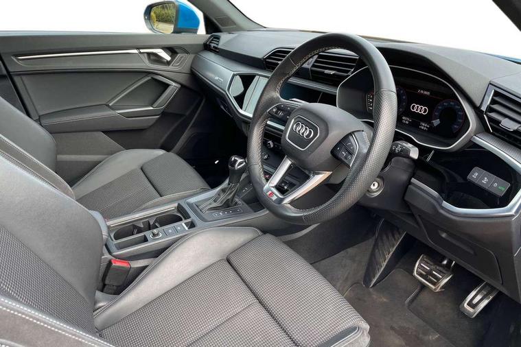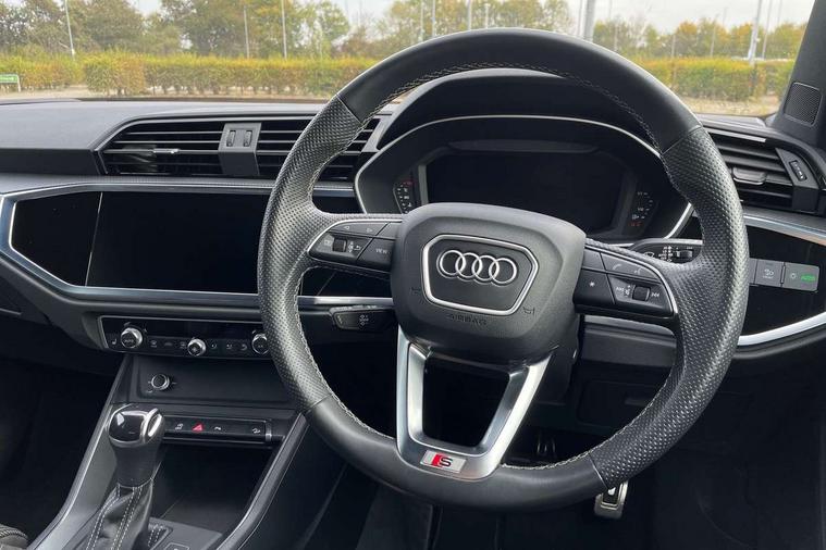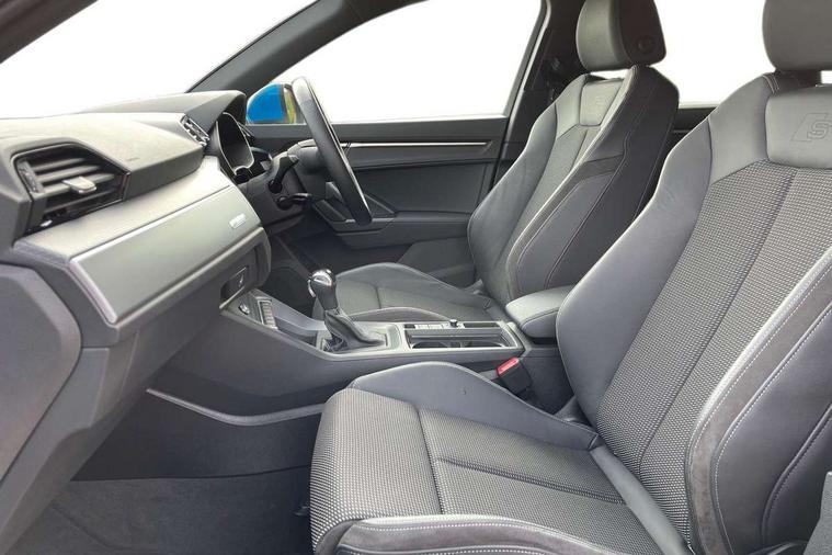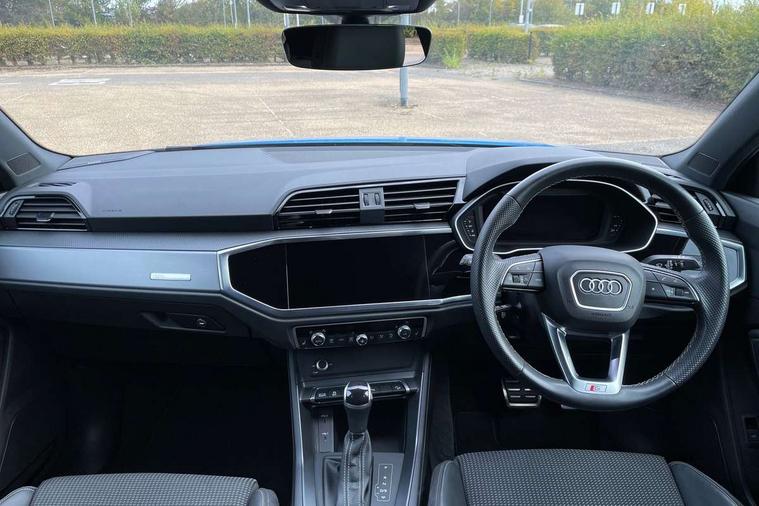 Amazon alexa Integration, Audi connect safety and service (e-call), Audi drive select, Audi lane departure warning, Audi Virtual Cockpit - 10.25" display, Bluetooth interface, Camera based traffic sign recognition, MMI Navigation Plus with high resolution 10.1 inch touchscreen colour display, Power operated tailgate, Progressive steering, Service interval indicator, Smartphone interface includes wireless Apple carplay/Android Auto, Start stop system with recuperation, Voice control system with natural language interaction, 48V Mild hybrid technology, Sports suspension, 2 USB-C ports with charge and data functions, 6 passive loudspeakers, DAB digital radio module, Acoustic windscreen, Aluminium roof rails, Aluminium window trim, Auto dimming frameless rear view mirror, Body coloured bumpers, Electrically folding, adjustable and heated door mirrors with integrated LED side indicators and kerb view function for passenger side, Front and rear electric windows, Front fog lights, Front side air inlets in matt platinum grey, Front spoiler blade in matt platinum grey, Grille vertical bars in aluminium silver/Matt, High gloss black finish B and C pillars, LED headlights with LED daytime running lights, LED rear lights, LED third brake light, Privacy glass dark tinted rear and rear-side windows (from B-pillar backwards), Rain and light sensors, Rear diffuser strip in matt titanium black, Rear side wing doors, Rear wiper, S line badges on front wings, S Line front and rear bumpers, Side skirt insert in matt Platinium grey, Silver chrome grille surround, Titanium black radiator grille, Variable front intermittent wipers, 12V socket in rear centre console, 3 seat bench in 2nd row, 40:20:40 folding with manual adjustment for 60:40 forwards/backwards position and backrest angle, Adjustable rear seat bench/backrest with centre armrest and cupholder, Black cloth headlining, Dual zone electronic climate control, Front and rear black floor mats with contrast stitching in rock grey, Front and rear headrests, Front and rear roof module including reading lights, Front centre armrest, Glove compartment lighting, Height and reach adjustable steering wheel, Illuminated door sill trims with S logo, ISOFIX child seat mounting for front passenger with airbag deactivation and outer rear seat including top tether attachment point for outer rear seats, Luggage compartment light, Manual front seats with height adjustment, Perforated leather gearknob, Single front passenger seat, Stainless steel luggage compartment sill finisher, Stainless steel pedals, Non smoking pack - Q3, 3x3 point rear seatbelts, 6 airbags - Driver, front passenger, curtain and side windows, Audi pre-sense front with pedestrain and cyclist recognition, Electromechanical parking brake, Electronic stabilisation control including ABS, ASR and EDL, Front seatbelt reminder, Hill descent control, Hill hold assist, Manual child lock in rear doors, Pre sense basic, Seatbelt monitoring, Tyre pressure warning, Warning triangle and first aid kit, Anti theft alarm, Anti theft wheel bolts, Immobiliser, Remote central locking, Dark matt brushed aluminium inlay, Detail dashboard around MMI touch colour display in glass look, black with surround in aluminium look, Leatherette door armrest, Tool kit, Tyre repair kit,