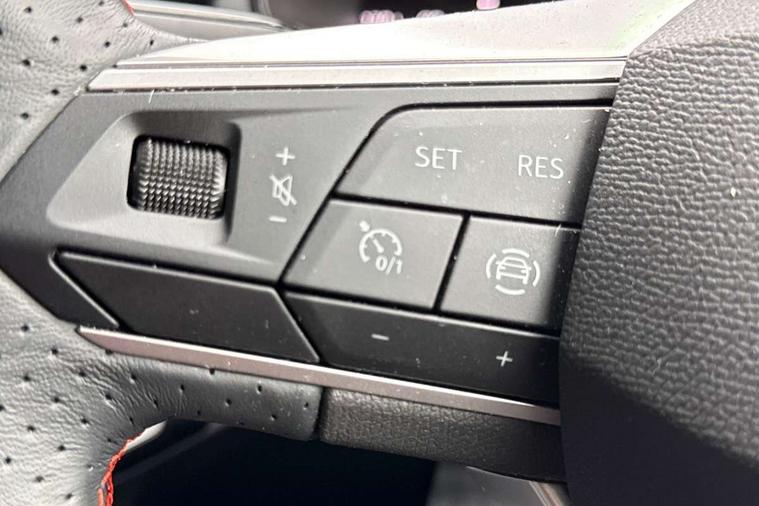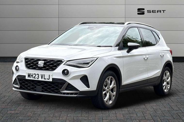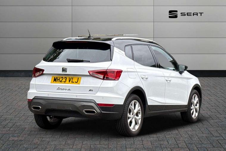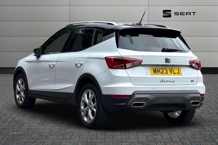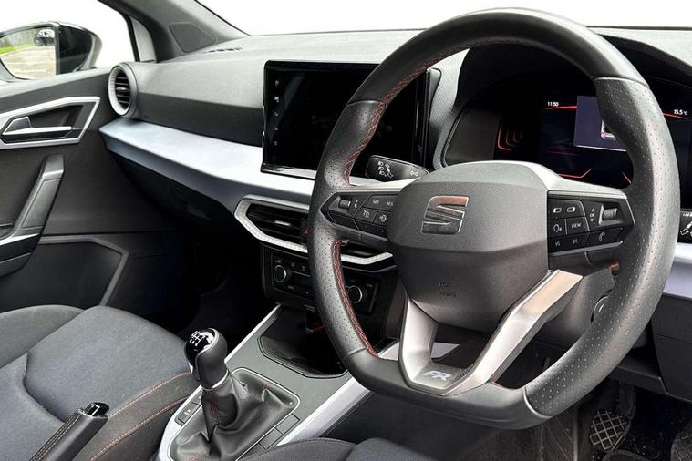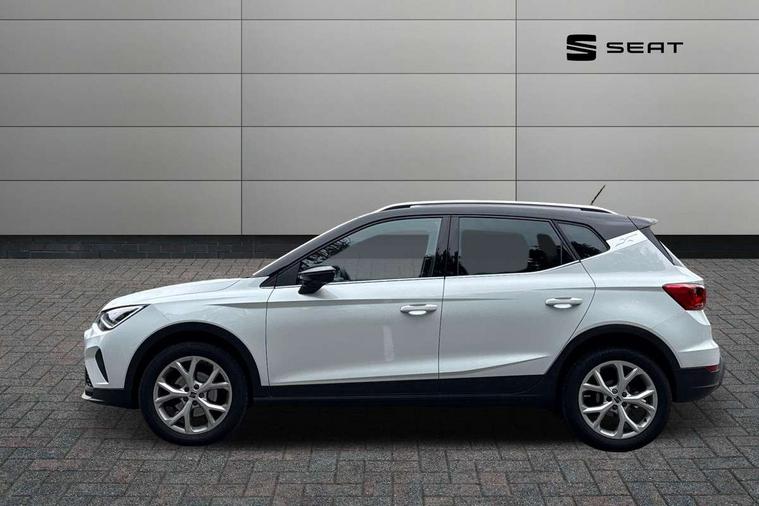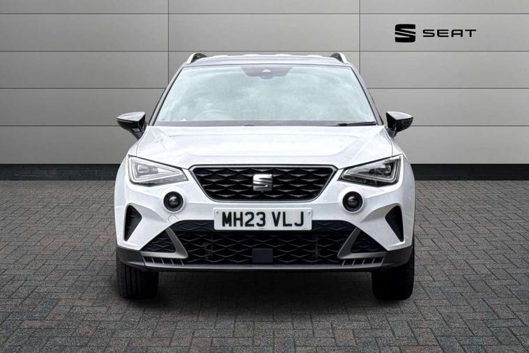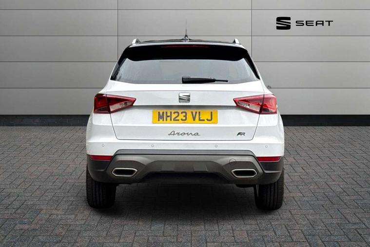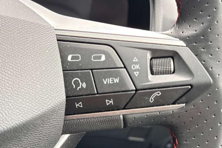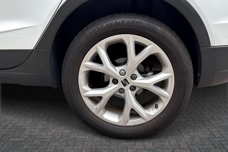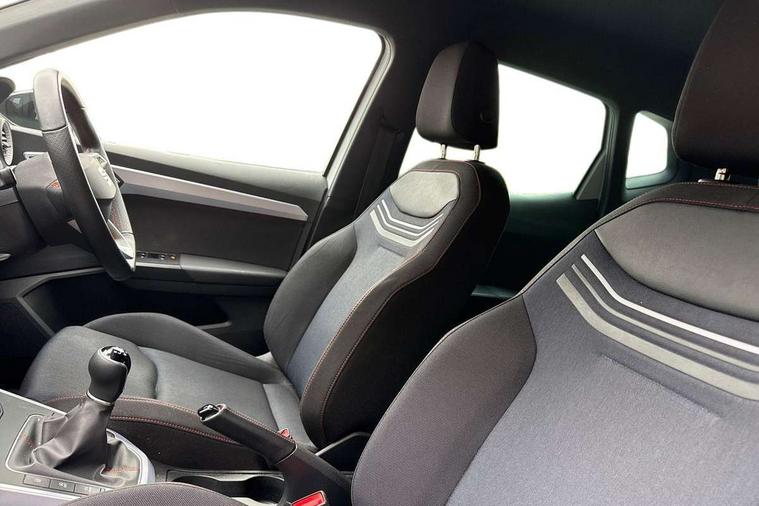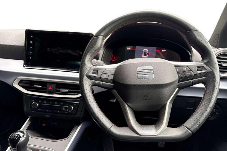 'Lights On' Reminder warning buzzer, 8" Digital cockpit, Digital clock, E-call, Electric speed sensitive power steering, Full Link Smartphone Integration with Mirror Link, Apple Car Play, Google Android Auto with USB Type C cable for Apple and Android compatibility, Lane keeping system, Low fuel warning light, Outside temperature display, Rear parking sensor, RPM counter, Seat connect with safety, service, remote and online, SEAT Drive profile - Four different models normal-sport-eco-individual, steering response, throttle response, Trip computer, Wireless phone charger, 9.2" colour touchscreen with navigation system, voice control and USB port (type c), Bluetooth interface for hands free and audio streaming, DAB digital radio and AM/FM radio, Steering wheel mounted audio controls, Anti theft roof antenna, Auto dimming interior rear view mirror, Automatic activation of hazard warning lights, Body coloured bumpers, Body coloured door handle inserts, Chrome roof rails and window surrounds, Dark tinted rear windows, Electric front/rear windows, Electrically adjustable, heated and folding door mirrors, Front fog lights with cornering function and rear fog light, FULL LED automatic headlights with dynamic headlight range control, coming and leaving home, LED daytime running lights, LED rear tail lights and licence plate lights, Protective side mouldings, Rain sensing wipers, Rear side wing doors, Rear spoiler, Rear window wash/wipe, Roof colour door mirrors, Third brake light, Twin exhaust pipe styling hidden exhaust pipe, Visible VIN plate, Windshield wiper with intermittent control and potentiometer, 2 cupholders, 3 seat bench in 2nd row, 60/40 split folding rear seat, Aircare filter, Black interior roof, Cloth upholstery, Double boot floor, Driver sunvisor with covered mirror + card holder, Dual zone climate control, Front courtesy light with front reading lights, Front sport seats, Gear shift indicator, Height adjustable front seats, Height/reach adjustable steering column, Illuminated boot, Instrument lighting with brightness control, Interior ambient lighting, Interior light in footwell, central console and door panel, ISOFIX points in outer rear seats with top tether anchorage points, Passenger sunvisor with vanity mirror, Perforated flat bottomed leather steering wheel/gear knob/handbrake with red stitching and FR logo, Single front passenger seat, Two front and three rear height adjustable headrests, Interior chrome pack - Arona, 3 point seatbelts on all rear seats, ABS, Active front headrests, Child locks on rear doors, Driver and front passenger airbags with front passenger airbag de activation, front side and curtain airbags, Electronic stability control, Emergency Brake Assist (EBA) and front assist, Front and rear seatbelt reminder, Hill hold control, Multi-Collision braking, Tiredness recognition system, Traction control, Tyre pressure monitoring system, Alarm with back-up horn, Electronic engine immobiliser, Locking wheel bolts, Remote central locking + deadlocks, Tow away protection, Titan black dashboard, 17" Dynamic alloy wheels,