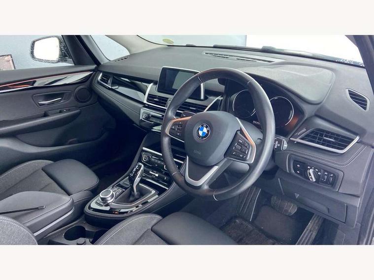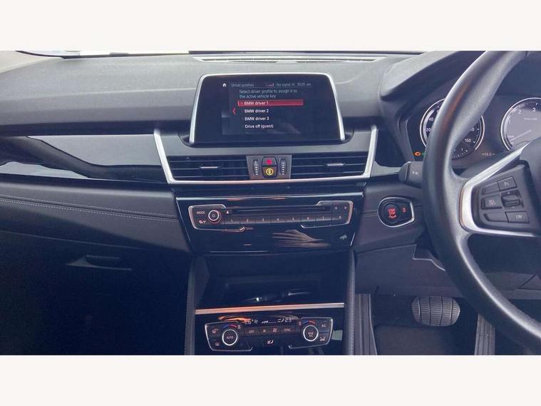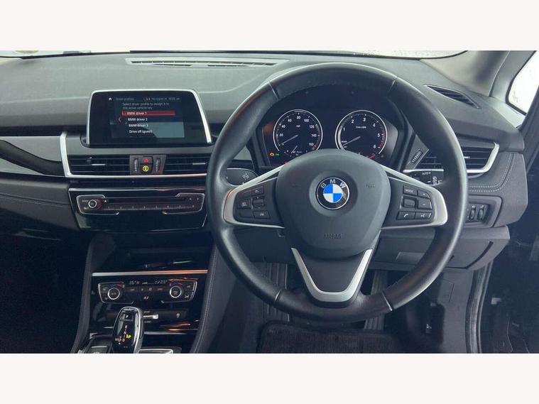 Attentiveness assist, Automatic tailgate operation, BMW Online services, BMW remote services, BMW Teleservices, Check control system, Cruise control with brake assist, Door/boot open warning light, Forward collision warning, Lights on warning, Oil temperature gauge, On board computer, Outside temperature display, Personal Profile, Service interval indicator, Speed limiter, Stop/start button, Diesel particulate filter, Drive Performance Control, Electronic differential lock, 2x USB sockets in front, Bluetooth audio streaming, BMW professional radio/CD/MP3, DAB Digital radio, Body colour bumpers, Body colour door handles, Body colour roof mouldings, Chrome exhaust tailpipe, Chrome kidney grille with black vertical slats, Electric adjustable heated door mirrors, Electric front/rear windows with one touch/auto up/down, Exclusive door sill finishers, Follow me home headlights, Heat insulating tinted glass, Heated windscreen washer jets, High beam assistant, LED daytime running lights, LED front fog lights, Rain sensor including auto headlights activation, Rear wiper, Welcome lighting, 3 rear headrests, 3 spoke sports leather steering wheel, 4 grab handles, Anthracite Velour floor mats, Dual zone automatic air conditioning, Front armrest, Front head restraints, Front sports seats with electric side bolster adjustment, Front/rear armrests within door panels, Illuminated glovebox, Isofix front passenger and rear seat preparation, Luggage compartment lighting, Multifunction steering wheel, Reach + rake adjustable steering column, Rear centre armrest, Sliding rear seats with front under seat storage, Sunvisors, Extended storage pack - 2 Series Active/Gran Tourer, 3 point seatbelts on all seats, ABS, BMW emergency call, Brake assist function, Childproof rear door locks, Collision mitigation braking system, Crash Sensor - activates hazard/interior lighting + unlocks doors, Driver/Front Passenger airbags, DSC+, Dynamic Traction Control - DTC, Front and rear curtain airbags, Front passenger airbag deactivation, Front seatbelt force limiters, Front seatbelt pretensioner, Front side airbags, Hill start assist, Seatbelt warning, Side impact protection, Tyre pressure monitoring system, Warning triangle and first aid kit, Electronic immobiliser, Key integrated remote control central locking, Locking wheel bolts, Remote control Thatcham category 1 alarm,