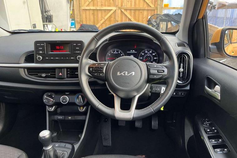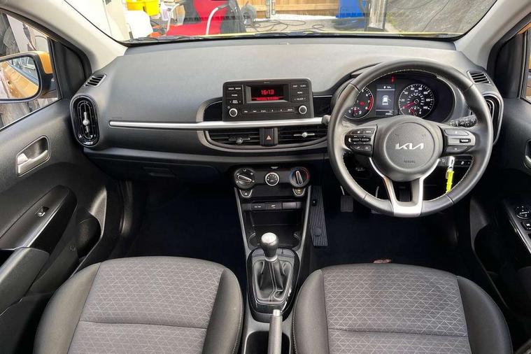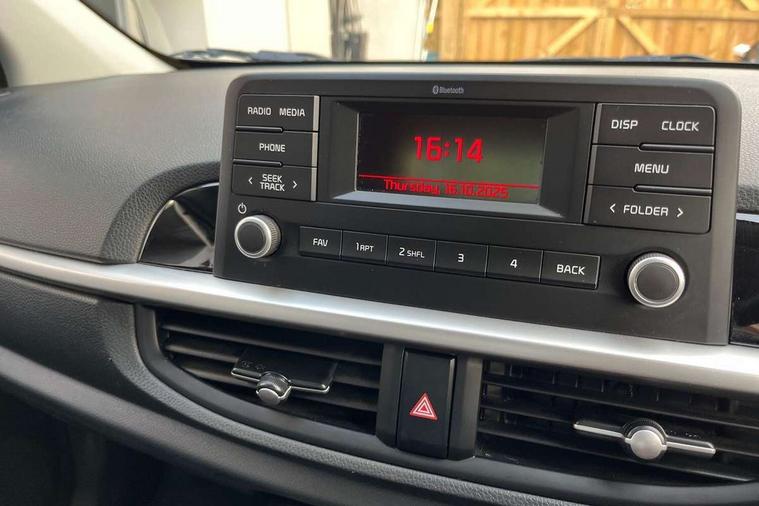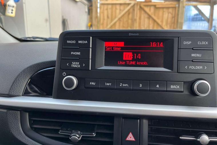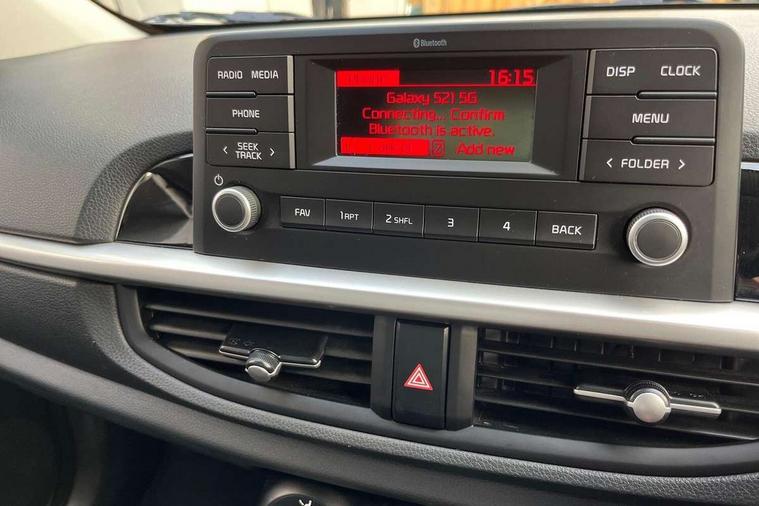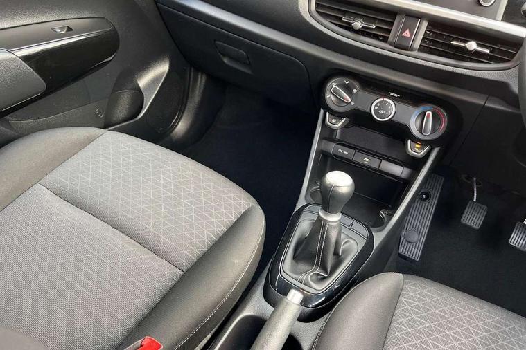 3.8" monochrome audio display with RDS and DAB, 4.2" supervision monochrome cluster display, Emergency call service, Emergency stop signalling system, External temperature gauge, Forward Collision-Avoidance Assist (FCA) - City, Motor driven power steering, Tachometer, Tailgate, Trip computer, 4 speaker audio system, Bluetooth with music streaming, Steering wheel mounted controls, USB ports for connection of a media device, Automatic headlight control system, Black radiator grille with chrome surround, Body colour bumpers, Body colour mirrors and door handles, Day/night rear view mirror, Daytime running lights, Electric adjustable heated door mirrors, Front and rear electric windows with drivers's auto up/down function, Headlamp levelling, Heated rear window, High mount brake light, MFR - Multi Focus Reflector halogen headlights with black bezel, Rain sensor, Rear fog lights, Rear side wing doors, Rear wash/wipe, Speed variable front wipers, Tinted glass, Visible VIN plate, Welcome and follow-me home light functionality, 1 x rear coat hook, 12V power point front, 2 seat bench in 2nd row, 3 x passenger assist grips, 60/40 split/folding 2nd row of seats, All round height adjustable headrests, Cupholders in centre console, Driver and front passenger sunvisor with vanity mirror, Driver seat height adjust, Front cabin lights, Glovebox, High gloss lower centre fascia trim, door armrest and air vents, ISOFIX Child seat top tethers and anchor fixings, Leather trimmed steering wheel and gearshift, Luggage area light, Luggage area parcel shelf, Manual air conditioning, Passenger front seatback pockets, Premium cloth upholstery, Silver paint finished interior door handles, Single front passenger seat, Slide/reclining front seats, Tilt adjustable steering wheel, Advanced Driver Assistance Pack - Picanto, 2 x 3-point rear seatbelts, ABS/EBD, Automatic unlocking of doors in case of impact, ESC + BAS + VSM + HAC, Front passenger airbag cut-off switch, Front seatbelt height adjusters, Front seatbelt pretensioners, Hill hold control, Hill start assist control (HAC), Knee airbags, Rear child proof door locks, Seatbelt warning, Side impact protection, Torque vectoring brake based and straight line stability (SLS), Traction control, Twin curtain airbags, Twin front airbags, Twin front side airbags, Tyre pressure monitoring system, Anti theft alarm, Engine immobiliser, Folding key, Locking wheel nuts, Remote central door locking, 14" alloy wheels, Tyre mobility kit,