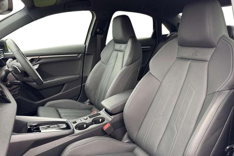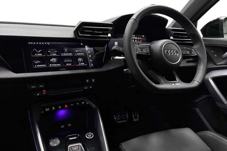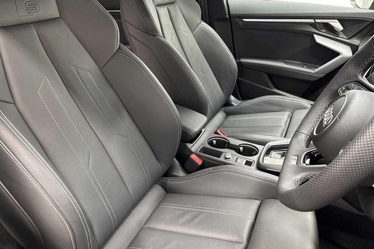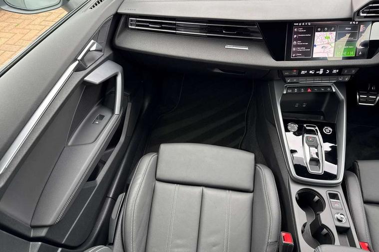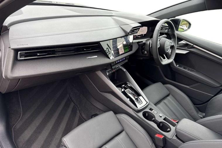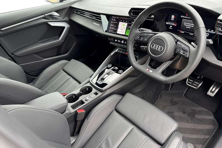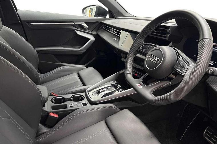 Adjustable speed limiter, Audi drive select, Audi smartphone interface with app store includes wireless Apple carplay, Android auto and Amazon alexa integration, Audi virtual cockpit plus - 12.3" full HD resolution dynamic digital instrument cluster, Automatic start/stop system with recuperation, Bluetooth interface, Camera based traffic sign recognition, Collision avoidance assistant, Cruise control, Distraction and Fatigue warning, e-Call (emergency call), Electromechanical power speed sensitive steering, Lane departure warning system, MMI Navigation Plus with high resolution 10.1" colour touch screen display, Park Assist with parking system Plus, Service indicator, Trip computer, Voice control system with natural language interaction, Sports suspension, Audi Phonebox light with wireless charging, Audi sound system - 10 loudspeakers including centre loudspeaker and subwoofer, DAB Digital radio, USB ports with charging function in the rear, Acoustic glass windscreen, Anthracite grey Audi rings (front and rear), Audi beam uses LEDs to project the Audi logo onto the ground as you exit your A3, Auto dimming frameless rear view mirror, Black accents front and rear bumpers, Black accents in the area of the Audi single frame grille, Black accents window trims strips, Electrically adjustable/heated/folding/auto dimming door mirrors with integrated LED indications + kerb view function for passenger side, Exterior model badging, Front electric windows, Heat insulating glass windscreen, Illuminated door sills with aluminium inserts at the front with S logo, LED 3rd brake light, LED daytime running lights, LED headlights with LED rear lights and dynamic rear indicators, Light and rain sensors, Privacy glass - dark tinted rear window, rear door and side windows, Rear boot, Rear electric windows, Rear side wing doors, 12V socket and storage compartment in front centre console, 3 seat bench in 2nd row, 3 spoke flat bottomed leather multifunction sport steering wheel with gear shift paddles, 3-zone deluxe automatic air conditioning, 4 way electrically adjustable lumbar support for driver and front passenger, 40/20/40 split folding rear seat bench, Black cloth headlining, Front and rear centre armrest in artificial leather, Front and rear centre armrest in artificial leather with contrasting stitching on armrests and instrument panel, Front and rear headrests, Front/rear floor mats, Heated front seats, Height and reach adjustable steering wheel, Manual boot compartment lid, Manually adjustable front seats, Rear cup holders, S badging on the steering wheel, Seat side bolsters, Single front passenger seat, Stainless steel pedals and front footrest in black, Twin leather upholstery with front sports seats S embossed logo, Aluminium interior elements pack - A3, Multi-coloured LED interior lighting package - A3 Black Edition, 3x3 point rear seat belts, Driver and front passenger airbag with passenger airbag deactivation, Electronic Stabilisation Control (ESC) including ABS, ASR and EDL, First aid kit with warning triangle and 2 safety vests, Front side airbags with head airbags and interaction airbag, Hill hold assist, Pre-sense front with pedestrian and cyclist detection, Seatbelt monitoring, Tyre pressure loss indicator, Anti theft alarm, Anti-theft wheel bolts, Electronically operated child locks, Immobiliser, Remote central locking with safelock, Inlays in black Impressum woven textile,