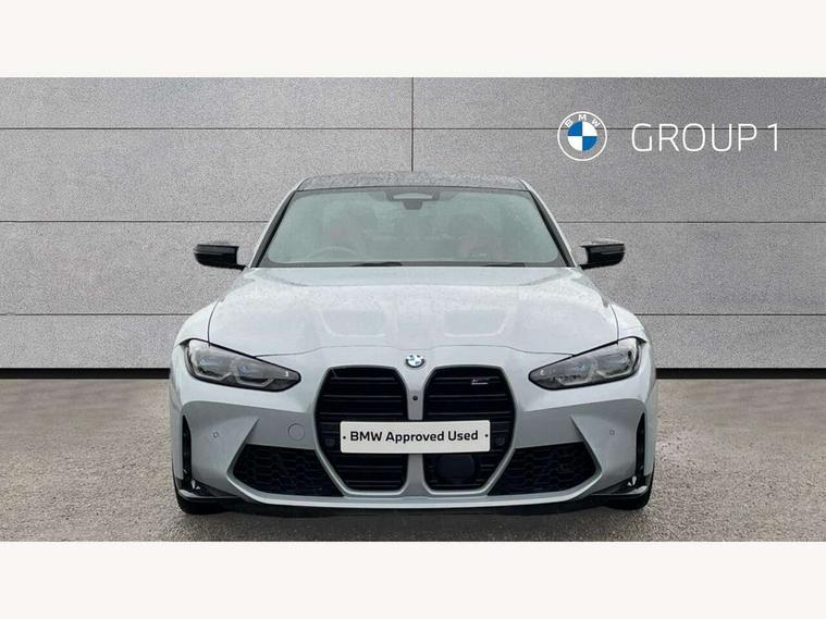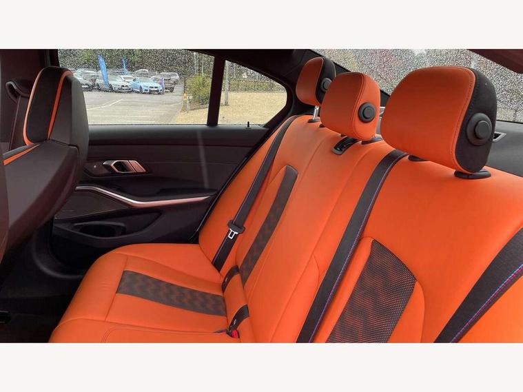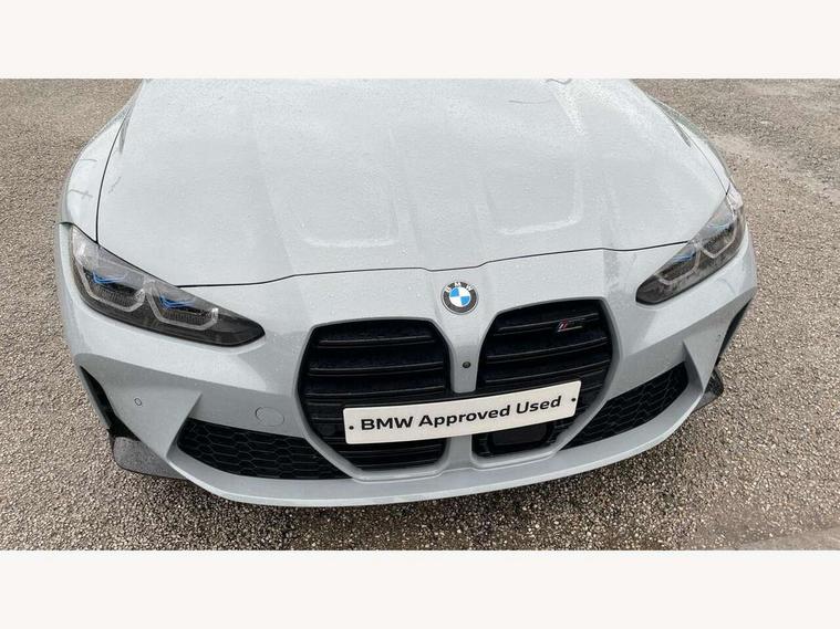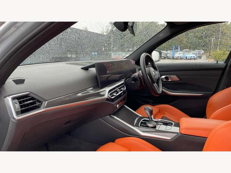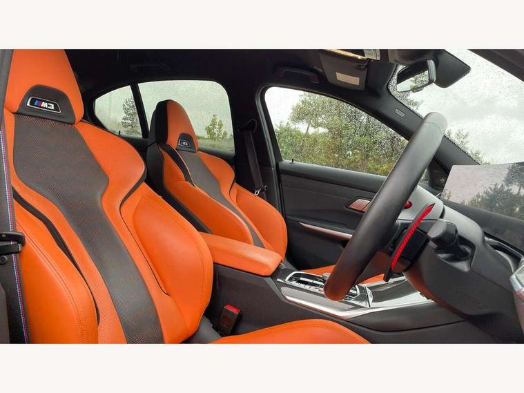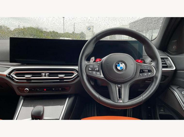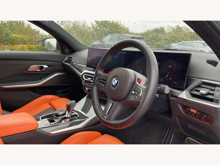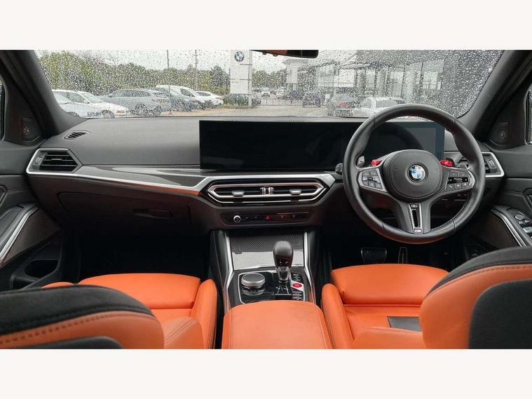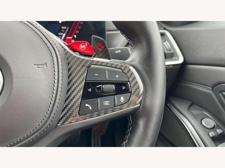 Active guard plus, Automatic start/stop system, Bluetooth functionality with Apple CarPlay/Android Auto, BMW iDrive controller on centre console, BMW legal emergency call, BMW Live Cockpit Professional sat nav system with 12.3" instrument display and high resolution control display, BMW Online services, BMW Teleservices, Brake pad wear indicator warning light, Condition based service, Connected drive services, Door/boot open warning light, Driving experience switch, Head up Display, Illuminated control elements, Instrument cluster with extended contents, Lights on warning, M drive buttons, Oil sensor for level and grade, warning by check control system, Oil temperature gauge, On board computer, On board diagnostics, Optimum shift indicator, Outside temperature display, Pull away assistant, Run flat indicator, Service interval indicator, Shifting point display, Speed limiter, Variable sport steering, Wi-Fi hotspot, Widescreen display, Adaptive M Sport suspension, Double joint spring strut front axle, M Drive Professional including track mode, laptimer, traction control & Drift analyser, M Sport differential, M steptronic sport transmission with drivelogic, Safety battery terminal clamp, 8 programmable favourite buttons, Auxiliary point for auxiliary devices, BMW professional radio/CD/MP3, DAB Digital radio, Harman/Kardon loudspeaker system, 3rd brake light, Acoustic glazing, Auto dimming driver's door mirror, Auto dimming rear view mirror, Automatic headlights + automatic windscreen wipers, Black chrome exhaust tailpipes, Black model designation badges, BMW emblem on engine compartment lid and tailgate, BMW high gloss shadow line with extended contents, BMW Individual shadowline lights, Body colour bumpers, Body colour door handles, Carbon fibre reinforced plastic (CFRP) roof with high gloss black roof aerial bulge and roof mouldings, Day time running light, Door mirror integrated indicators, Door sill finishers with aluminium inserts, Dynamic brake lights, Electric adjustable heated door mirrors, Electric folding door mirrors, Electric front and rear windows with one touch/convenient open/close function, Follow me home headlights, Front and rear apron plastic in body colour, Front and rear bumper system, Headlight beam throw control, Heat protection, sun protection glazing, Heated rear window with automatic switch off, Heated washer jets, High beam assistant, High gloss black frameless kidney grille with M badge, High gloss black lower bumper edges, side sills and diffuser edge binding, LED number plate light, LED tail lights with 3D L-shaped LED light design, M designation, M Sport entry door sill strips, Mirror glass aspheric on driver's side, convex on passenger side, Rear boot, Rear fog lights, Rear reflectors, Rear right M3 competition inscription, Rear side wing doors, Reversing light, Shark fin roof aerial, Strakes in front side panel, black matt/black high-gloss, with model badge, Visible VIN plate, Welcome lighting, 2 front cupholder in centre console with clamping elements and matt black inlay, 2 x 12 V Power sockets (luggage compartment and front centre console), 2 x USB Type C ports for charging and data transmission in front centre console, 2 x USB Type C ports for charging in rear centre console, 3 folding rear headrests, 3 seat bench in 2nd row, Ambient inside door handle light, Ambient lighting for instrument panel, Ambient lighting for storage compartment, Ambient lighting front and rear, Ambient lighting in door panels, Anthracite headlining, Battery in luggage compartment, Carbon fibre centre console incl. cover for cupholders and storage compartment, Carbon fibre decorative steering wheel finishers, Carbon fibre shift paddles, Carbon fibre strip in instrument panel on front passenger side, Centre console armrest with storage compartment, Compartment in front of cupholder, Driver/passenger sunvisors with illuminated vanity mirrors + covers, Dynamic ambient interior lighting, Electric front seats + driver memory, English handbook, Floor mats in velour, Folding rear centre armrest with 2 cupholders, Footwell lighting, Front and rear ambient footwell lighting, Front and rear door exit lights, Front door storage bins with bottle holder, Front interior light, Front isofix attachment + airbag deactivation, Front seat backrest width adjustment, Front seats lumbar support, Front/rear door armrests, Gearshift lever with embossed M badge, Heated front seats, Height adjustable front headrests, Interior mirror lighting, Isofix on 2nd row outer seats, Lockable/illuminated glovebox, Luggage compartment lighting, Manual 40:20:40 split folding rear seat with two tilt positions for backrest, Multifunction steering wheel, Rake/reach adjustable steering wheel, Single front passenger seat, Storage compartment in rear doors, Three zone automatic air conditioning, Through loading system, Toolkit located in luggage compartment, Wireless charging tray, Additional storage compartment pack - M3, Connected package professional - M3, High gloss shadowline exterior trim pack - M3, 3 point seatbelts on all seats, ABS/EBD, Automatic Stability Control (ASC), Brake energy regeneration, Brake fade compensation, Compound structure brake discs, Cornering brake control (CBC), Crash sensor, Driver/Front Passenger airbags, Dry braking, Dynamic brake control, Dynamic Stability Control with M Dynamic mode, Dynamic Traction Control - DTC, Electromechanical parking brake, Electronic differential lock control (EDLC), Front and rear head airbags, Front seat side impact airbags, Front seatbelt pretensioners + load limiters, Hill start assist, M Sport seat belts, Rear child proof door locks, Seatbelt warning, Side impact protection, Two tone horn, Tyre pressure sensor, Warning triangle and first aid kit, Centre lock switch, Closing system with central locking, Digital key, Electronic immobiliser, Thatcham cat 1 remote alarm, Vehicle Key with 4 buttons including the integrated key, Galvanic finish to control surroun