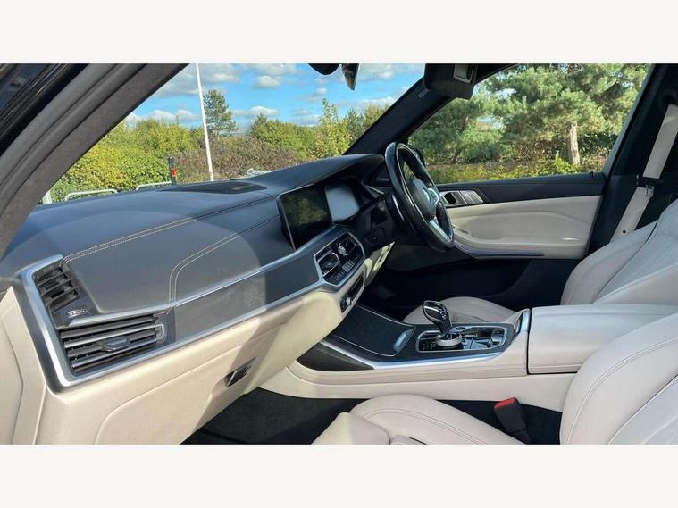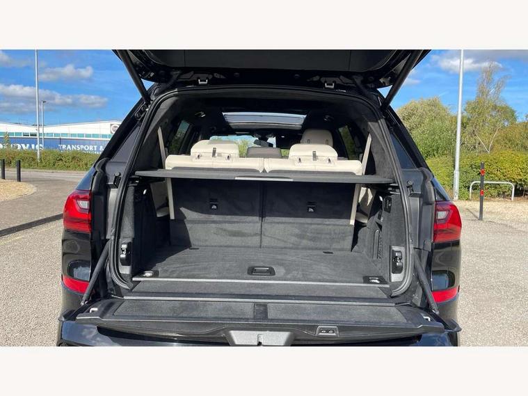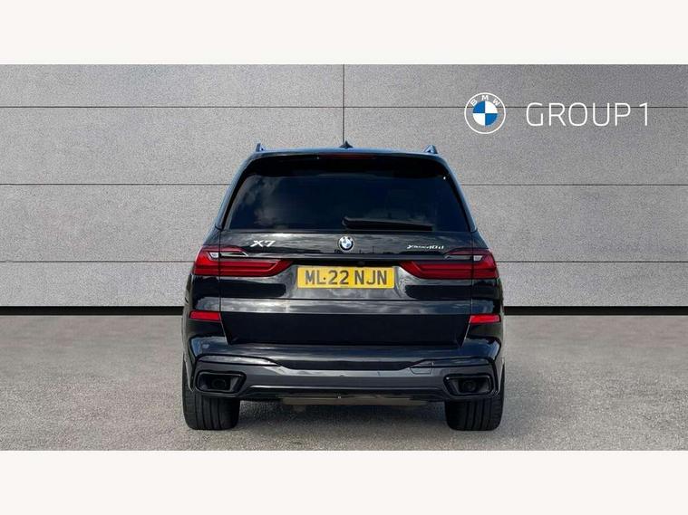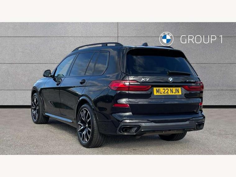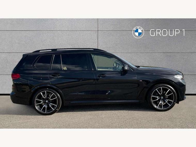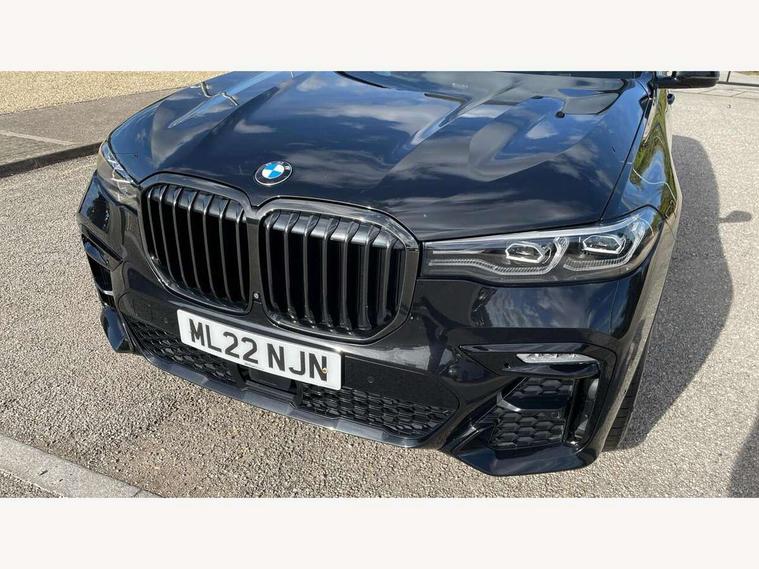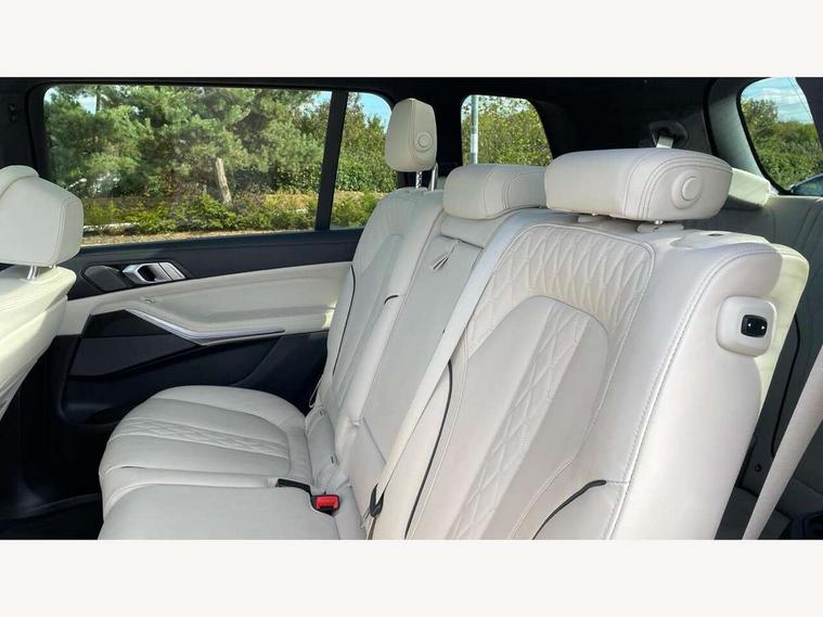20GB hard disc drive (HDD) memory, Active guard plus, Attentiveness assist, Automatic tailgate operation, BMW digital live cockpit professional - 12.3" digital instrument panel and 12.3" CID + Intelligent personal assistant, BMW Drive recorder, BMW Head up display, BMW legal emergency call, BMW Online services, BMW Teleservices, Brake force display, Brake pad wear indicator warning light, Connected drive services, Enhanced bluetooth with wireless charging and Wi-Fi hot spot, iDrive controller with shortcut buttons, Oil sensor for level and grade, On board computer inc. average speed, fuel consumption, liquid crystal Info display, journey computer, outside temperature display, personal profile, Parking assistant plus with reversing assistant, surround view system, review camera and active park distance control, Speed limiting function, Stop/start button, 48V Mild hybrid technology, 8 speed automatic with steptronic transmission including launch control and gearshift paddles on the steering wheel, Adaptive 2-axle air suspension, Common rail technology, Diesel particulate filter, Double wishbone front axle, Drive performance control with ECO PRO comfort + sport and adaptive mode, Variable vane geometry, 1 x USB A 1.5A in cupholder, 1 x USB C 3A in centre armrest & 1 x double USB C 3A in rear end of console for 2nd seat row, DAB tuner, Favourite buttons, Gesture control for infotainment system, Acoustic glazing, Active Air Stream kidney grille with high-gloss chrome, Door sill finishers with M designation, Dynamic brake lights with LED technology, Exhaust tailpipes - single, left and right with M Sport-geometry Chrome finishers, Follow me home headlight function, Frameless interior mirror, Front and rear electric windows, Heated windscreen washer jets, High beam assist, LED daytime running lights, LED fog lights, LED rear lights, LED third brake light in rear spoiler, M designation on left and right front side panels, Rain sensor with automatic headlight activation and windscreen wiper control, Rear side wing doors, Welcome light carpet, X7 on left tailgate, xDrive and engine designation on right tailgate, 12V - Power sockets with 2x centre console and 1x luggage compartment, 2 seat bench in 3rd row, 3 seat bench in 2nd row, 3rd row seats, Ambient interior lighting with 6 pre-designed selectable lights including dynamic function, Centre console includes storage compartment, Compartment in front of cupholder, Electrical steering column with adjustable height and length with activation and control on the steering column, Foldable rear centre armrest with 2 cupholders and storage compartment, Front and rear cupholders x 2, Front and rear door pockets, Front and rear door sill inlays with illuminated BMW M designation, Front and rear seat heating, Front and rear side armrests integrated into door trim, Front footwell lights, Front reading lights, Grab handles, Headrests for all seats, Light inside glove compartment, Lockable glove compartment, Luggage compartment floor panel with integral storage tray, M leather steering wheel, M specific key, M specific steering wheel, Make-up mirror lights, Microfilter and active carbon filter, Multifunction controls for leather steering wheel, Multifunctional hooks, Rear centre interior light, Seat back with flap pocket, Single front passenger seat, Soft close function for doors, Sunvisors with illuminated vanity mirrors, Toolkit located in luggage compartment, Velour floormats, Connected Package Professional - X7, Expanded exterior mirror pack - X7, Luggage compartment pack - X7, M aerodynamics pack - X7, Active protection, Airbags - driver, front passenger, front and side head airbags for first and second row seats knee airbag, Anti-lock braking system (ABS), Automatic Stability Control (ASC), Brake energy regeneration, Child locks on rear doors, Child seat ISOFIX attachment rear outer seats in 2nd row and both seats in 3rd row includes top tether, Comfort cushion, Crash sensor and Safety battery terminal clamp, DSC - Dynamic Stability Control, Dynamic Traction Control - DTC, Electromechanical parking brake with automatic drive away release and auto hold function, Front and rear brake discs with interior ventilation, M Sport braking system, Mechanical child proof lock on rear doors, Passive protection for pedestrians, Seat occupancy detection for driver and passenger side, Side impact protection, Split folding 2nd row seating with 40:20:40 configuration, Three point rear seat belts, Two tone horn, Tyre pressure monitoring system, Warning triangle and first aid kit, Closing system with central locking, Comfort access system, Driver and front passenger door centre lock switch, Locking wheel bolts, Thatcham 1 alarm system with remote control and engine immobiliser, Vehicle key with M specific designation, BMW Individual leather finished instrument panel, Galvanic embellisher for controls, Sensatec instrument panel,