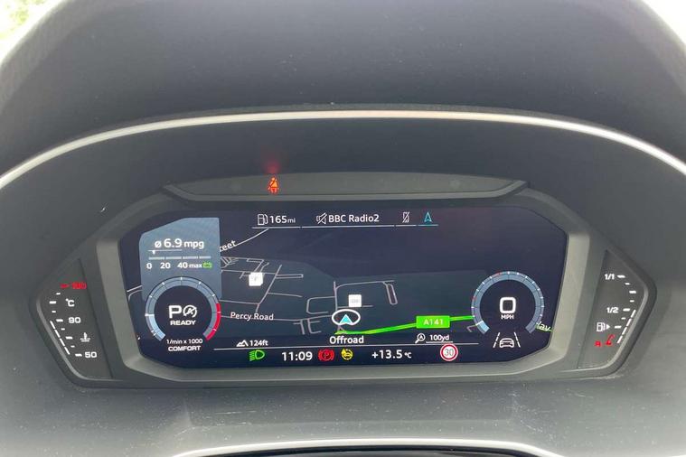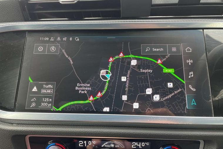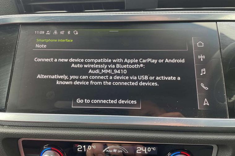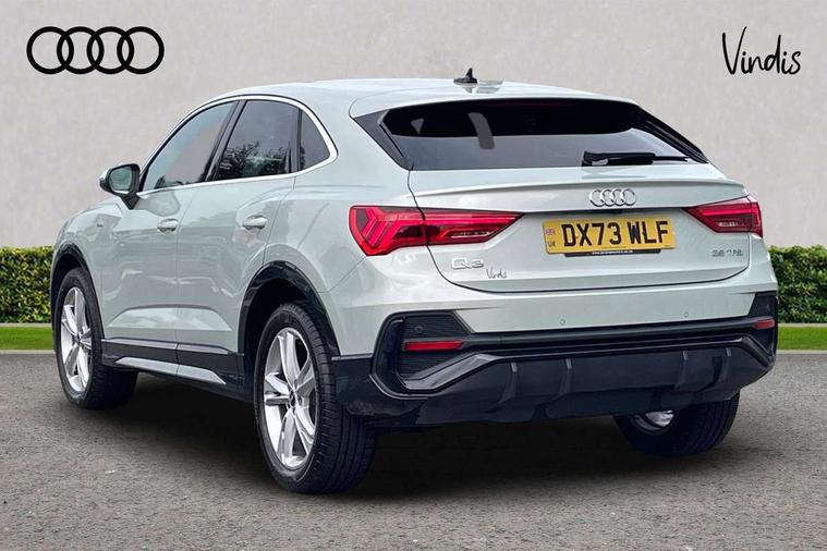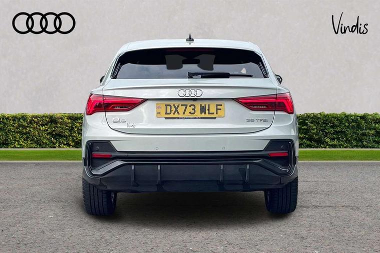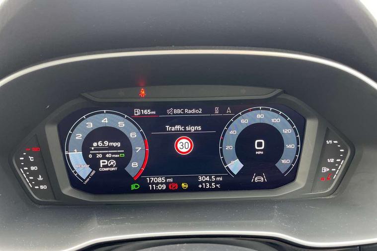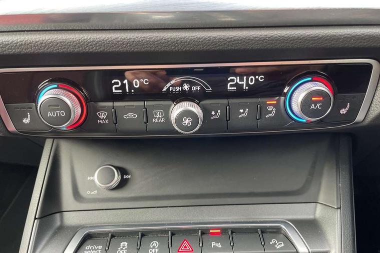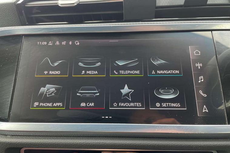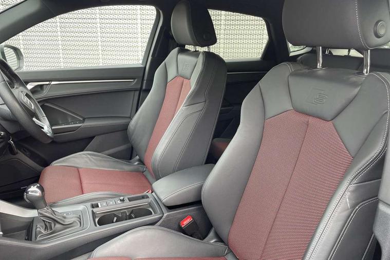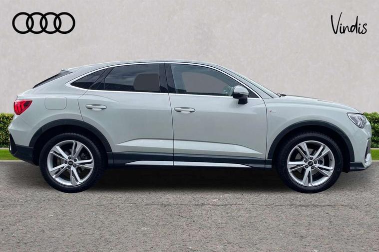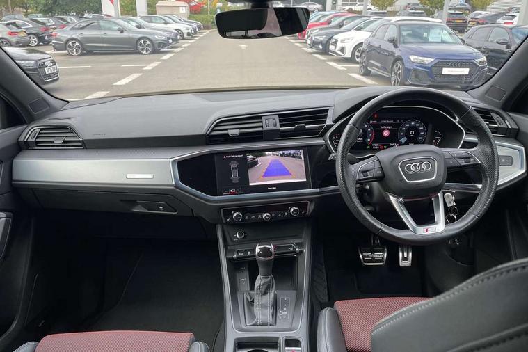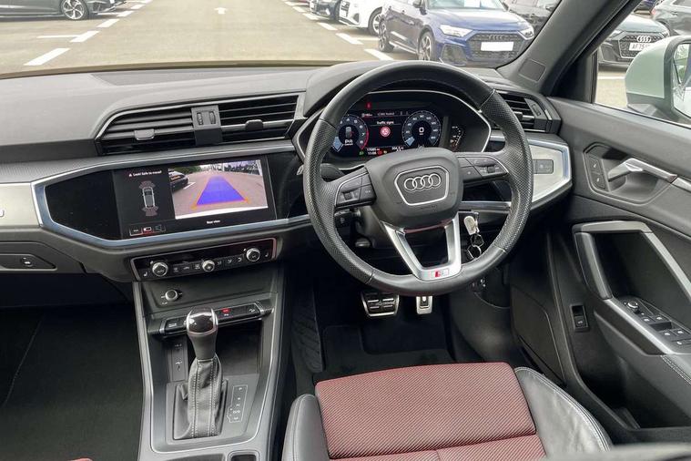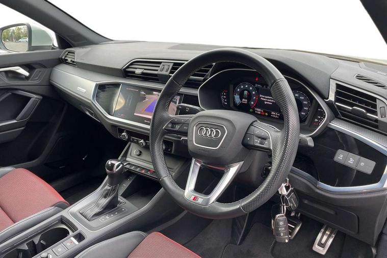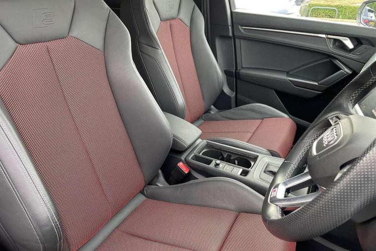 Audi drive select, Audi lane departure warning, Audi Virtual Cockpit - 10.25" display, Bluetooth interface, Camera based traffic sign recognition, Legal emergency call, MMI Navigation Plus with high resolution 10.1 inch touchscreen colour display, Power operated tailgate, Progressive steering, Service interval indicator, Smartphone interface includes wireless Apple carplay/Android Auto, Start stop system with recuperation, Voice control system with natural language interaction, Sports suspension, 2 USB-C ports with charge and data functions, 6 passive loudspeakers, DAB digital radio module, Acoustic windscreen, Aluminium window trim, Auto dimming frameless rear view mirror, Diffuser grille in grained matt black, Diffuser trim in selenite silver, Electrically folding, adjustable and heated door mirrors with integrated LED side indicators and kerb view function for passenger side, Front and rear electric windows, Front fog lights, Front side air inlets in selenite silver, Front underbody protection in manhattan grey paint finish, Grille surround in aluminium silver matt, High gloss black finish B and C pillars, LED Dynamic rear indicators, LED headlights with LED daytime running lights, LED rear lights, LED third brake light, Privacy glass dark tinted rear and rear-side windows (from B-pillar backwards), Radiator grille in anthracite black with inlay in matt aluminium silver, Rain and light sensors, Rear side wing doors, Rear underbody protection in matt black, Rear wiper, S line badges on front wings, S line front and rear bumpers and side skirts in contrasting Manhattan grey paint finish, Side skirt insert in matt Platinium grey, Variable front intermittent wipers, 12V socket in rear centre console, 3 seat bench in 2nd row, 3 spoke leather multifunction steering wheel features S badging and grips in perforated leather with contrast stitching, 40:20:40 folding with manual adjustment for 60:40 forwards/backwards position and backrest angle, Adjustable rear seat bench/backrest with centre armrest and cupholder, Black cloth headlining, Dual zone electronic climate control, Front and rear black floor mats with contrast stitching, Front and rear headrests, Front and rear roof module including reading lights, Front centre armrest, Glove compartment lighting, Height and reach adjustable steering wheel, Illuminated door sill trims with S logo, ISOFIX child seat mounting for front passenger with airbag deactivation and outer rear seat including top tether attachment point for outer rear seats, Luggage compartment light right in white, Luggage compartment sill protection in stainless steel, Manual front seats with height adjustment, Perforated leather gearknob, Single front passenger seat, Stainless steel pedals, Ambient lighting pack - Q3, Non smoking pack - Q3, 3x3 point rear seatbelts, 6 airbags - Driver, front passenger, curtain and side windows, Audi pre-sense front with pedestrain and cyclist recognition, Electrically operated child locks on rear doors, Electromechanical parking brake, Electronic stabilisation control including ABS, ASR and EDL, Front seatbelt reminder, Hill descent control, Hill hold assist, Pre sense basic, Seatbelt monitoring, Tyre pressure warning, Warning triangle and first aid kit, Anti theft alarm, Anti theft wheel bolts, Immobiliser, Remote central locking, Aluminium look interior elements, Black dashboard, Dark matt brushed aluminium inlay, Detail dashboard around MMI touch colour display in glass look, black with surround in aluminium look, Leatherette door armrest,