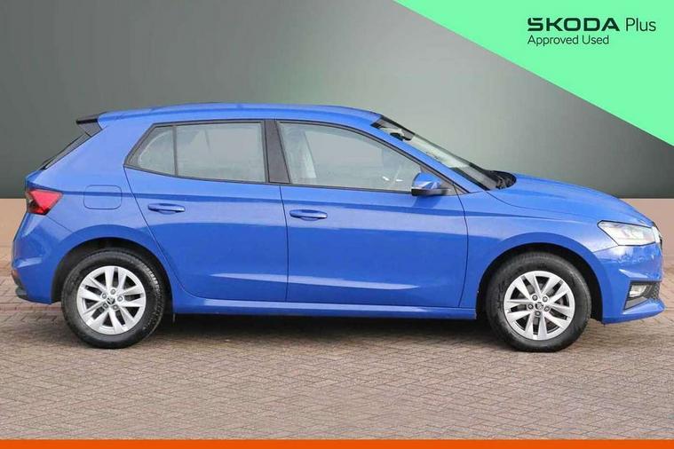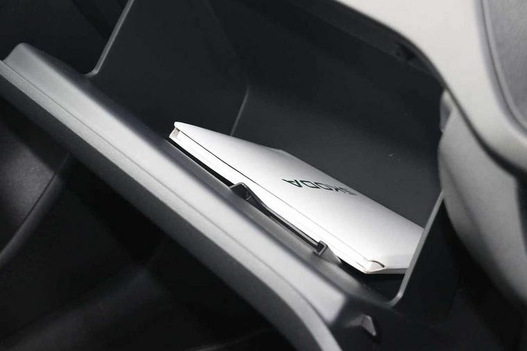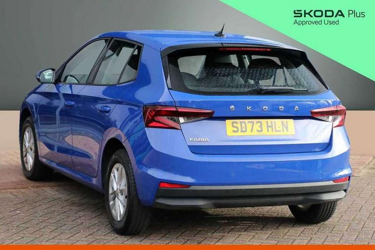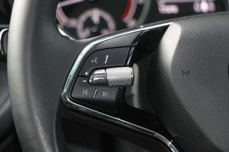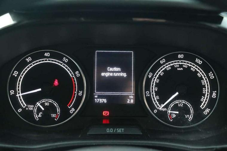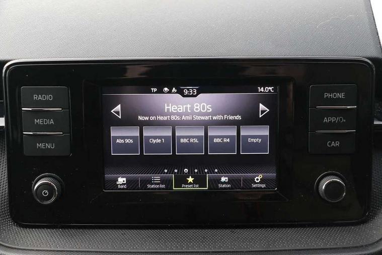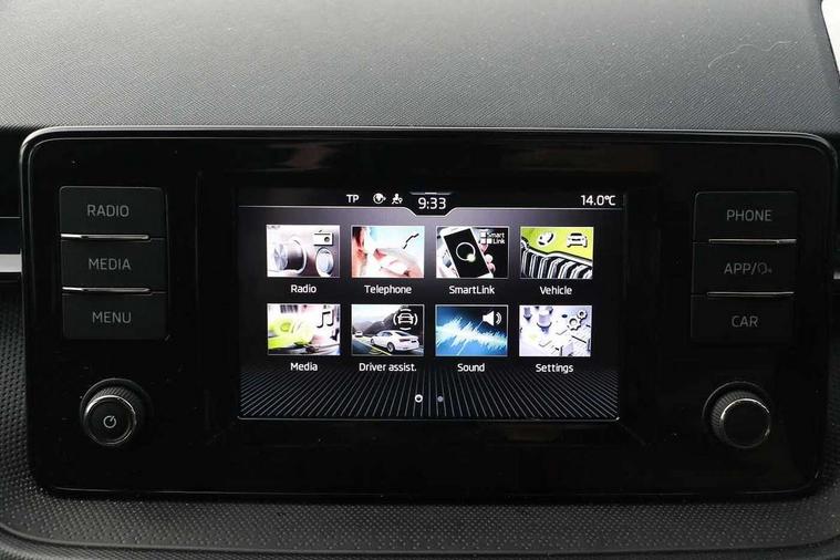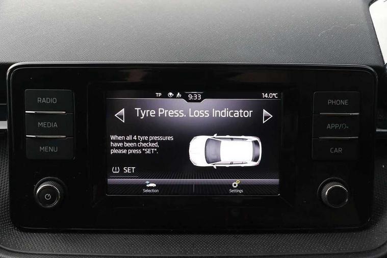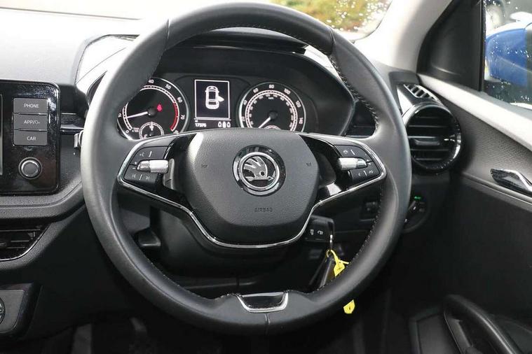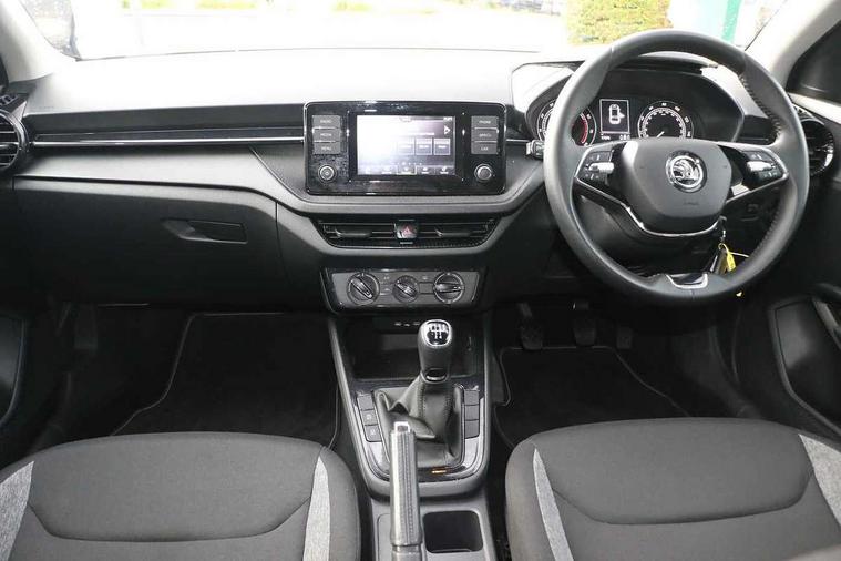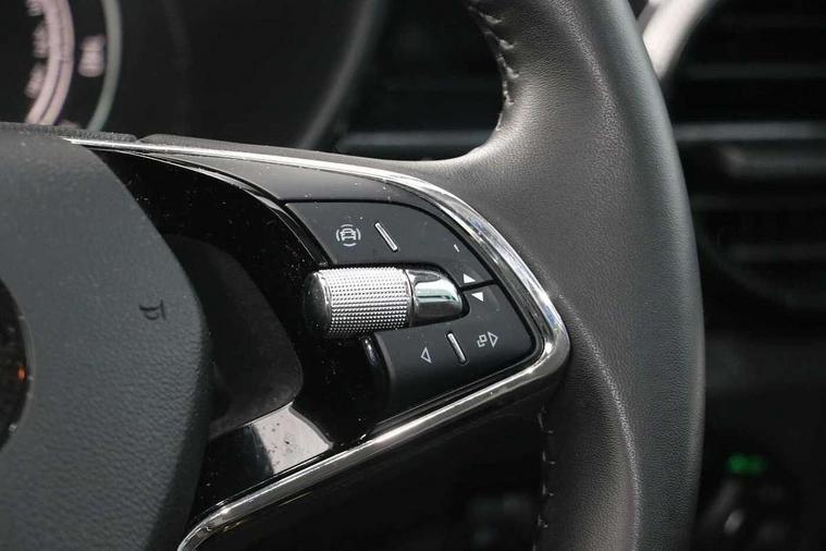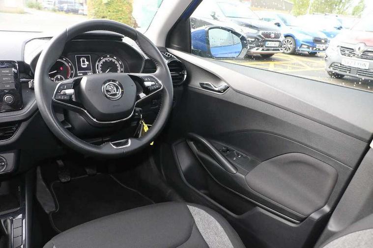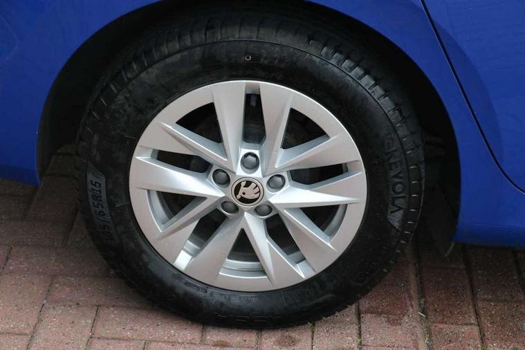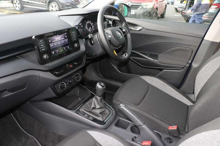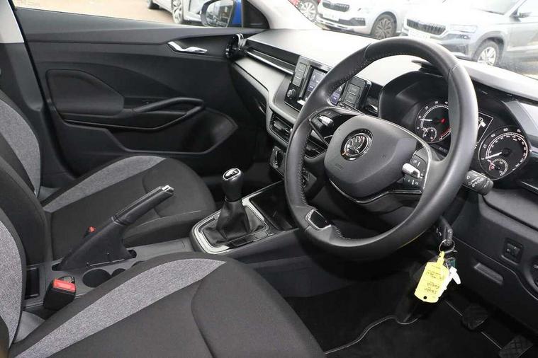 Bluetooth connection, Driver alert system - DAS, Electromechanical power steering, Exterior temperature gauge, Lane assist including road edge detection, Multifunction trip computer in black and white, Service interval indicator, Speed limiter, 2x USB-C in the front (for data transmission and charging), 4 speakers in front, Auxiliary socket for external MP3 player, DAB digital radio reception, Radio Swing with 6.5" colour display, Basic LED Headlights, Body colour door mirrors, Body coloured bumpers, Dimming rear view mirror with black frame, Door mirror integrated indicators, Electrically adjustable and heated door mirrors, Electrically adjustable front windows with function auto up/down, Front fog lights, Front window wiper intermittent control, Headlight range control - Automatic, Ice scraper in fuel cap, LED daytime running lights with coming and leaving home feature, Mechanical adjustable rear windows, Rain sensor, Rear LED fog light, Rear side wing doors, Rear window wiper with washing nozzles, Roof mounted spoiler, SKODA tailgate lettering in chrome, Third brake light, 2 reading lights in front and 2 reading lights in rear, 2 spoke leather multifunction steering wheel, 3 rear headrests, Backrest split and folding, Central console with fixed cup holder and storage box, Chrome handbrake release button, Fabric upholstery, Gearshift knob/handle in leather, Grain satin black interior door handles, Hand brake lever handle in leather, Height adjustable front headrests, Height adjustable front seats, Height adjustable steering wheel, ISOFIX and TopTether anchorage points to the outer rear seats, ISOFIX and TopTether on the front passenger seat, Luggage compartment lighting, Manual air conditioning, Manually adjustable lumbar support in front seats, Pollen filter, Rear seat bench unsplit, Single front passenger seat, Storm grey headlining, Sun visors with mirror and airbag label on passenger side, Ticket holder, 3-point height adjustable front seats belts with pretensioner and force limiter, Automatic warning lights in case of crash, Driver and passengers airbag with switch off function, e-Call+, ESC including ABS, MSR, ASR, EDS, HBA and XDS, Front and rear seat belt warning, FRONT ASSIST (AEB City and AEB Inter Urban), Front side airbags, Head airbags, One tone horn, Pedestrian protection, Three rear 3-points safety seat belts with pretensioner and force limiter including stop function for outer rear seat belts, Tyre pressure monitoring system, Anti-theft alarm system including immobiliser, interior monitoring, backup horn, and towing protection, Central locking with radio remote control, interior controls, SAFE function and 2 foldable keys, Black painted air vents, Glossy black decorative trim, Grain satin black central console cover, Grain satin black lower decorative trim, Satin black door and side trim panel in front, Anti-theft wheel bolts protection, Super-low rolling resistance tyres,