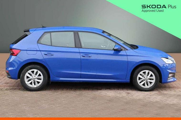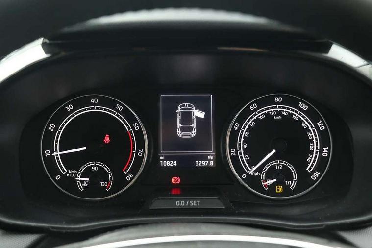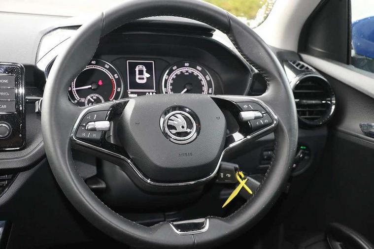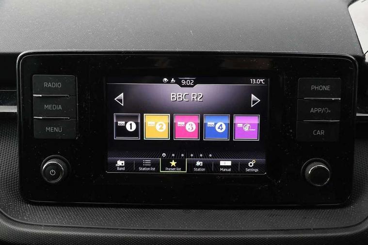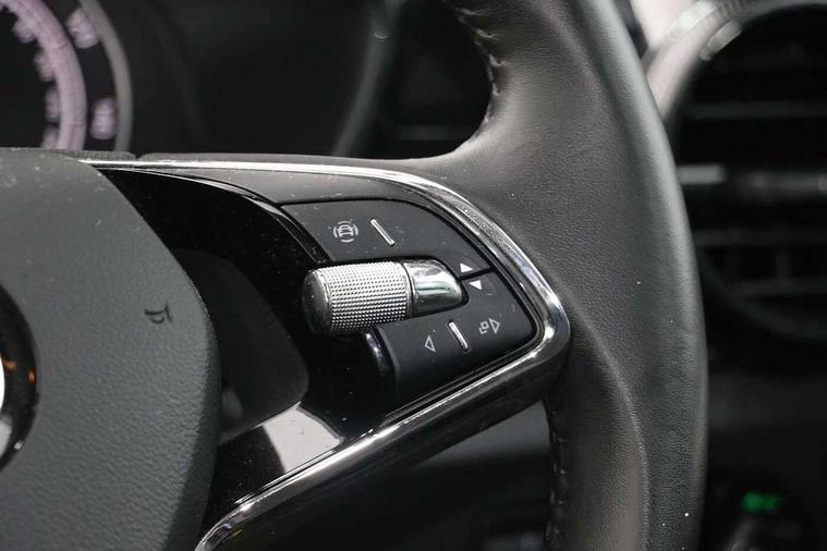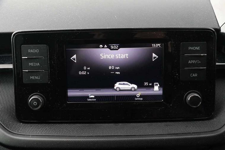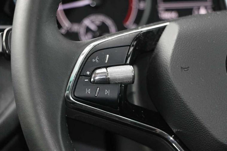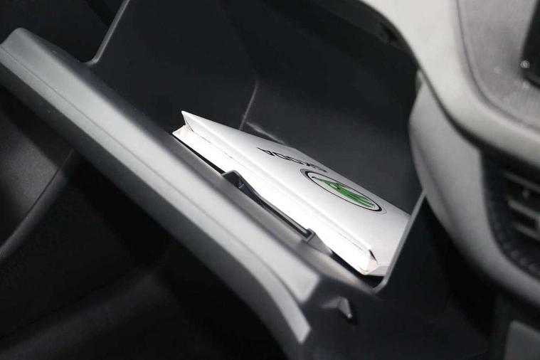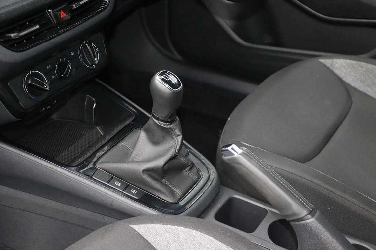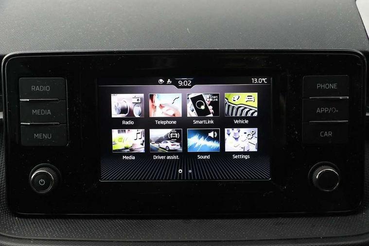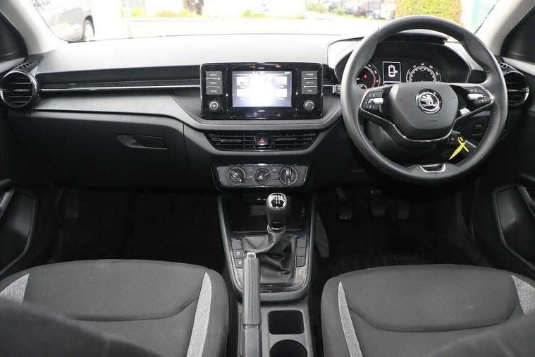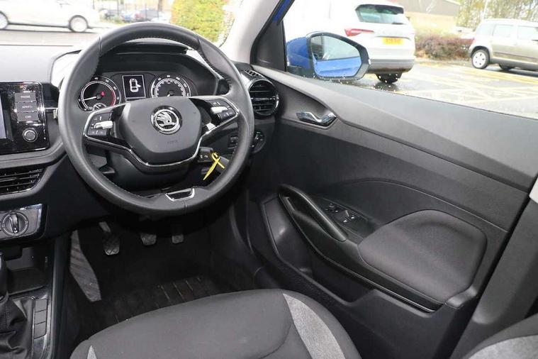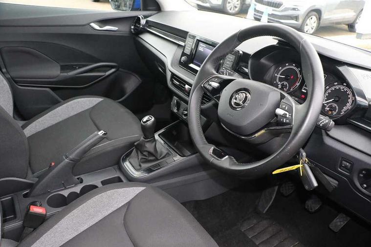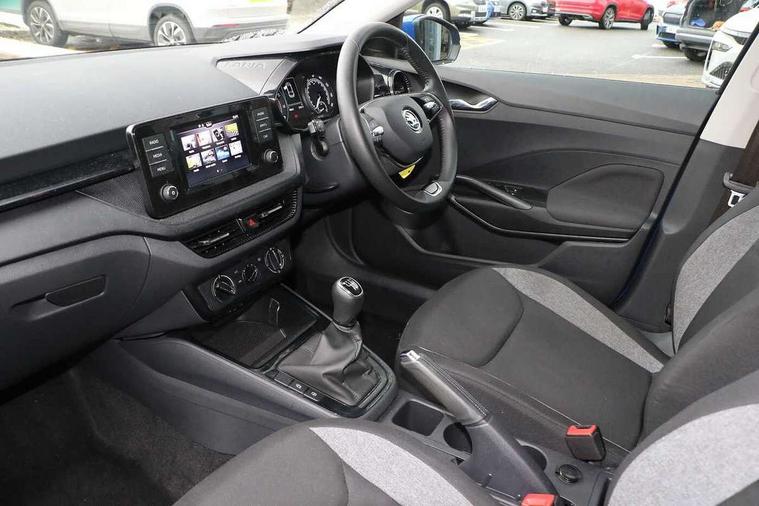 Bluetooth connection, Driver alert system - DAS, Electromechanical power steering, Exterior temperature gauge, Lane assist including road edge detection, Multifunction trip computer in black and white, Service interval indicator, Speed limiter, 2x USB-C in the front (for data transmission and charging), 4 speakers in front, Auxiliary socket for external MP3 player, DAB digital radio reception, Radio Swing with 6.5" colour display, Basic LED Headlights, Basic rear lights, Body colour door mirrors, Body coloured bumpers, Dimming rear view mirror with black frame, Door mirror integrated indicators, Electrically adjustable and heated door mirrors, Electrically adjustable front windows with function auto up/down, Front fog lights, Front window wiper intermittent control, Headlight range control - Automatic, Ice scraper in fuel cap, LED daytime running lights with coming and leaving home feature, Mechanical adjustable rear windows, Rain sensor, Rear LED fog light, Rear side wing doors, Rear window wiper with washing nozzles, Roof mounted spoiler, SKODA tailgate lettering in chrome, Third brake light, 2 reading lights in front and 2 reading lights in rear, 2 spoke leather multifunction steering wheel, 3 rear headrests, Backrest split and folding, Central console with fixed cup holder and storage box, Chrome handbrake release button, Fabric upholstery, Gearshift knob/handle in leather, Grain satin black interior door handles, Hand brake lever handle in leather, Height adjustable front headrests, Height adjustable front seats, Height adjustable steering wheel, ISOFIX and TopTether anchorage points to the outer rear seats, ISOFIX and TopTether on the front passenger seat, Luggage compartment lighting, Manual air conditioning, Manually adjustable lumbar support in front seats, Pollen filter, Rear seat bench unsplit, Single front passenger seat, Storm grey headlining, Sun visors with mirror and airbag label on passenger side, Ticket holder, 3-point height adjustable front seats belts with pretensioner and force limiter, Automatic warning lights in case of crash, Driver and passengers airbag with switch off function, e-Call+, ESC including ABS, MSR, ASR, EDS, HBA and XDS, Front and rear seat belt warning, FRONT ASSIST (AEB City and AEB Inter Urban), Front side airbags, Head airbags, One tone horn, Pedestrian protection, Three rear 3-points safety seat belts with pretensioner and force limiter including stop function for outer rear seat belts, Tyre pressure monitoring system, Anti-theft alarm system including immobiliser, interior monitoring, backup horn, and towing protection, Central locking with radio remote control, interior controls, SAFE function and 2 foldable keys, Black painted air vents, Glossy black decorative trim, Grain satin black central console cover, Grain satin black lower decorative trim, Satin black door and side trim panel in front, Anti-theft wheel bolts protection, Super-low rolling resistance tyres,