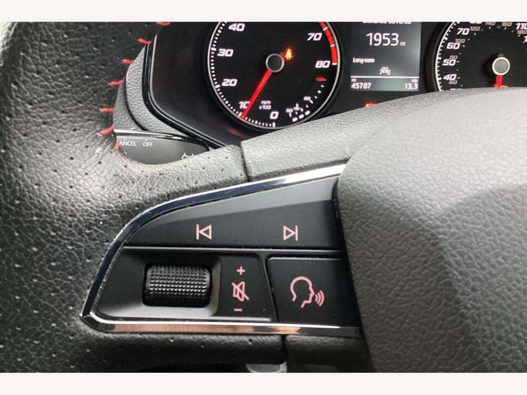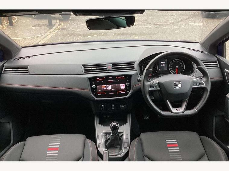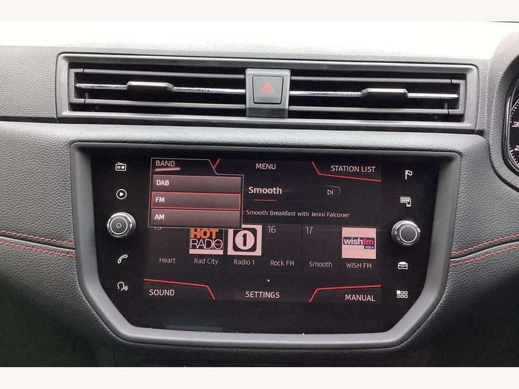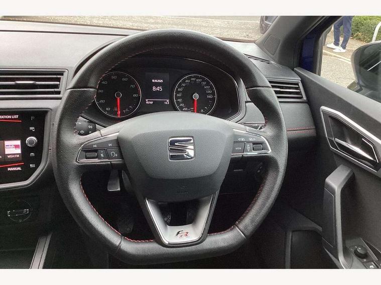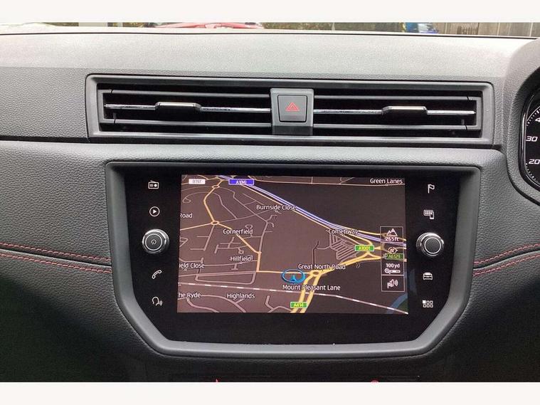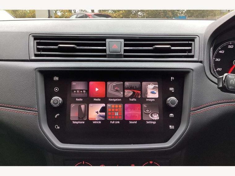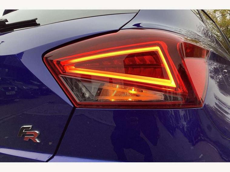 'Lights On' Reminder warning buzzer, Bluetooth Handsfree Phone Connection, Cruise control, Digital clock, Full Link Smartphone Integration with Mirror Link, Apple Car Play, Google Android Auto, Low fuel warning light, Outside temperature gauge, Power Steering, Satellite navigation system with 3D mapping, 8" touch screen, voice control and additional USB port, SEAT Drive profile, SEAT logo boot release, Trip computer, Sports suspension, 6 speakers, Auxiliary input socket, CD player, Digital Audio Broadcast (DAB) Tuner, Radio/MP3 player, SD card slot, SEAT USB media cable, Steering wheel mounted controls, USB port, Anti theft roof antenna, Auto dimming rear view mirror, Automatic headlights, Automatic rain sensing wipers, Body colour bumpers, Body colour door handles, Brilliant black door mirrors, Chrome front grille frame, Chrome grille, Coming/leaving home lighting function, Cornering front fog lights, Dark tinted rear windows, Electric folding door mirrors, Electric front windows, Electric headlight adjustment, Electrically adjustable and heated door mirrors, Exclusive FR rear bumper, Full LED headlights, LED daytime running lights, LED tail lights, Rear fog lights, Twin exhaust pipes, 3 rear headrests, 60/40 split folding rear seat, Air conditioning, Door and steering wheel ice metal decorative inserts, Driver's sunvisor with ticket holder/vanity mirror, Dust/pollen filter, Flat bottomed perforated leather steering wheel with red stitching and FR logo, Front courtesy lights, Front cupholders x 2, Front reading lights, Gear shift indicator, Glovebox, Height adjustable driver's seat, Height adjustable front/rear head restraints, Height adjustable passenger seat, Height/reach adjust steering wheel, Illuminated boot, Instrument lighting with brightness control, Leather dashboard, Leather handbrake, Multi-colour ambient interior lighting, Nora cloth upholstery, Passenger sunvisor, Rear top tether child seat ISOFIX attachment, Sports seats, Full LED headlight pack - Ibiza, 3 point seatbelts on all 3 rear seats, ABS, Active front headrests, Child locks on rear doors, Curtain airbags, Driver/Front Passenger airbags, ESP+EBA, Front assist (AEB), Front passenger airbag deactivation, Front side airbags, Hill hold control, Multi-Collision braking, Seatbelt warning, Tiredness recognition system, Tyre pressure monitoring system, Electronic engine immobiliser, Locking wheel bolts, Remote central locking + deadlocks, Volumetric alarm with back up horn, 17" Dynamic alloy wheels,