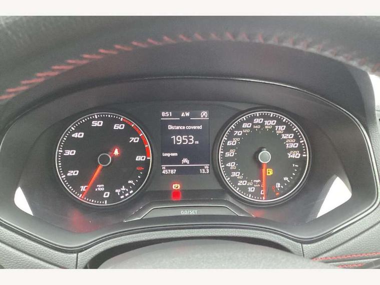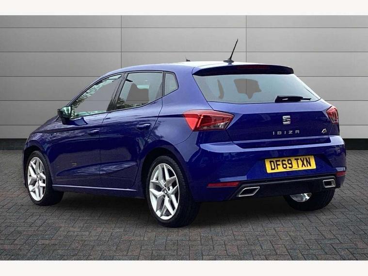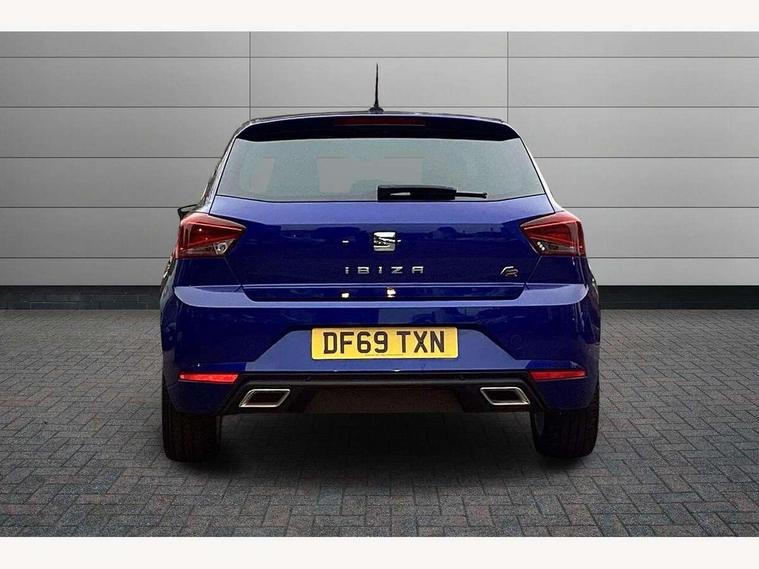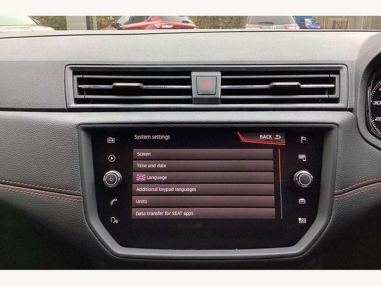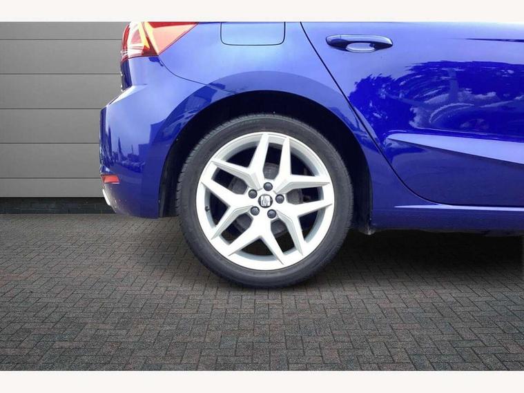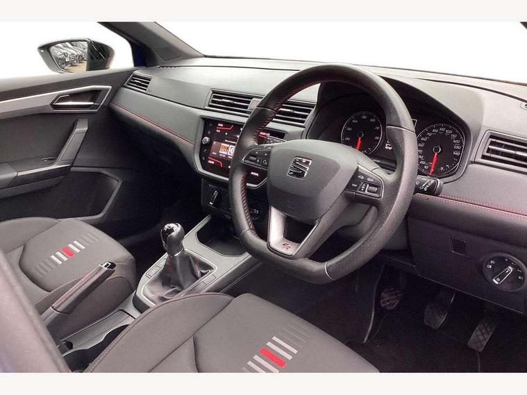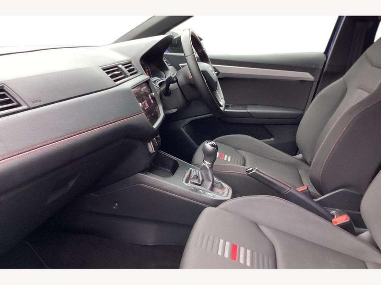 'Lights On' Reminder warning buzzer, Bluetooth Handsfree Phone Connection, Cruise control, Digital clock, Full Link Smartphone Integration with Mirror Link, Apple Car Play, Google Android Auto, Low fuel warning light, Outside temperature gauge, Power Steering, Satellite navigation system with 3D mapping, 8" touch screen, voice control and additional USB port, SEAT Drive profile, SEAT logo boot release, Trip computer, Sports suspension, 6 speakers, Auxiliary input socket, CD player, Digital Audio Broadcast (DAB) Tuner, Radio/MP3 player, SD card slot, SEAT USB media cable, Steering wheel mounted controls, USB port, Anti theft roof antenna, Auto dimming rear view mirror, Automatic headlights, Automatic rain sensing wipers, Body colour bumpers, Body colour door handles, Brilliant black door mirrors, Chrome front grille frame, Chrome grille, Coming/leaving home lighting function, Cornering front fog lights, Dark tinted rear windows, Electric folding door mirrors, Electric front windows, Electric headlight adjustment, Electrically adjustable and heated door mirrors, Exclusive FR rear bumper, Full LED headlights, LED daytime running lights, LED tail lights, Rear fog lights, Twin exhaust pipes, 3 rear headrests, 60/40 split folding rear seat, Air conditioning, Door and steering wheel ice metal decorative inserts, Driver's sunvisor with ticket holder/vanity mirror, Dust/pollen filter, Flat bottomed perforated leather steering wheel with red stitching and FR logo, Front courtesy lights, Front cupholders x 2, Front reading lights, Gear shift indicator, Glovebox, Height adjustable driver's seat, Height adjustable front/rear head restraints, Height adjustable passenger seat, Height/reach adjust steering wheel, Illuminated boot, Instrument lighting with brightness control, Leather dashboard, Leather handbrake, Multi-colour ambient interior lighting, Nora cloth upholstery, Passenger sunvisor, Rear top tether child seat ISOFIX attachment, Sports seats, Full LED headlight pack - Ibiza, 3 point seatbelts on all 3 rear seats, ABS, Active front headrests, Child locks on rear doors, Curtain airbags, Driver/Front Passenger airbags, ESP+EBA, Front assist (AEB), Front passenger airbag deactivation, Front side airbags, Hill hold control, Multi-Collision braking, Seatbelt warning, Tiredness recognition system, Tyre pressure monitoring system, Electronic engine immobiliser, Locking wheel bolts, Remote central locking + deadlocks, Volumetric alarm with back up horn, 17" Dynamic alloy wheels,