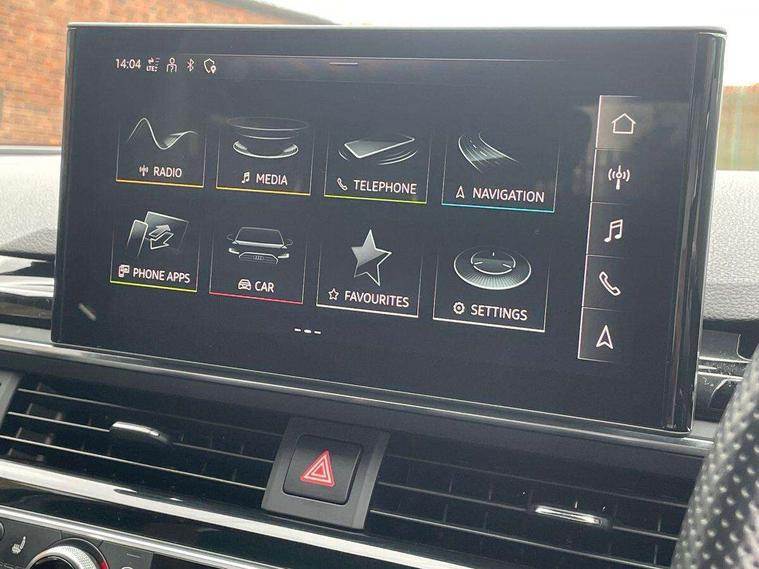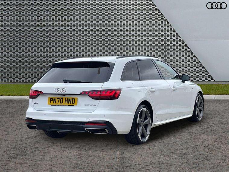 Audi connect safety and service (e-call), Audi drive select, Audi parking system plus with front and rear sensors, Audi smartphone interface, Audi virtual cockpit, Automatic start-stop system with coasting functionality and efficiency programme, Bluetooth interface, Cruise control system with speed limiter, Electromechanical power steering, MMI Navigation plus with MMI touch includes 10.1" high resolution colour MMI display, 3D map, Power operated tailgate, Rear view camera, Voice control system, 54 litre fuel tank, Sports suspension lowered by 23mm, 2 USB charging ports, 8 passive loudspeakers, DAB digital radio reception, Auto dimming rear view mirror, Body colour door handles, Body colour front spoiler lip, Body colour side sill trim, Electrically folding auto dimming/adjustable/heated door mirrors with LED side indicators and kerb view function for passenger side, Grained matt black side air inlets with matt aluminium silver inlay, High beam assistant, LED headlights with LED rear lights + dynamic rear indicators + headlight adjustment and high beam, turning light + LED daytime running lights, Matt aluminium silver tailpipe trim, Rain and light sensors, S Line badges on the front wings, S line front and rear bumpers with side skirts, S Line rear diffuser in matt titanium black with trim strip in matt aluminium silver, S Line roof edge spoiler, Windscreen with acoustic glazing, 3 spoke flat bottomed high multi-function leather sport steering wheel, 4 way electric lumbar support for driver and front passenger, 40/20/40 split folding 3 rear seat bench in 3 parts with rear centre armrest, Black cloth headlining, Black perforated leather gearknob, Contrast stitching on seats, steering wheel and gear lever gaiter, Deluxe 3 zone electronic climate control, Door sill trims with aluminium inlay, Electric load area cover, Front and rear head restraints, Front centre armrest, Heated front seats, Illuminated door sill trims with S logo, ISOFIX child seat mounting and top tether, Manual seat adjustment, Stainless steel pedals and foot rest, Tool kit, LED Interior light pack - A4/S4, Titanium black styling pack - A4 Avant, 3 rear seatbelts, 6 airbags - Driver, front passenger, curtain and side windows, Electronic Stabilisation Control (ESC) including ABS, ASR and EDL, Hill hold assist, Multi collision brake assist, Pop-up bonnet for pedestrian protection, Pre sense city, Seatbelt monitoring, Warning triangle and first aid kit, Anti theft alarm, Anti theft wheel bolts, Keyless Go, Piano black finish inlay, 19" 5 arm rotor design alloy wheels titanium matt look, Tyre repair kit,