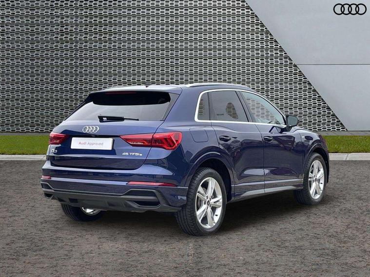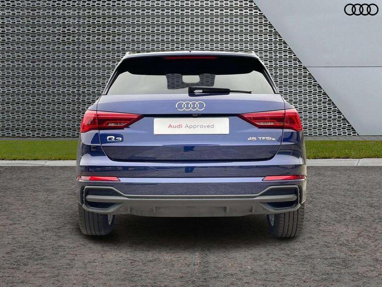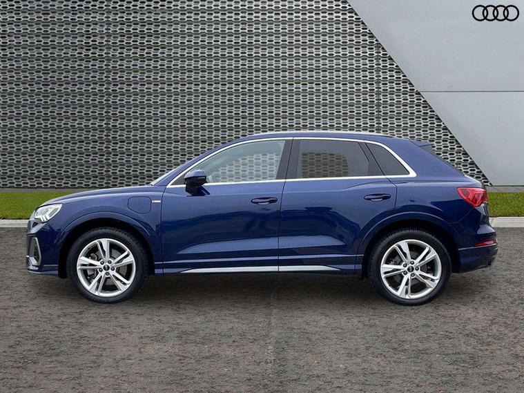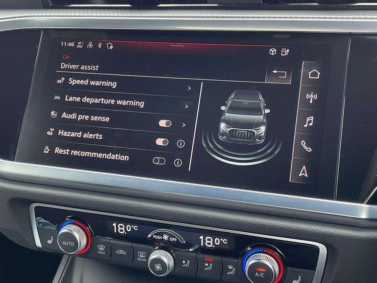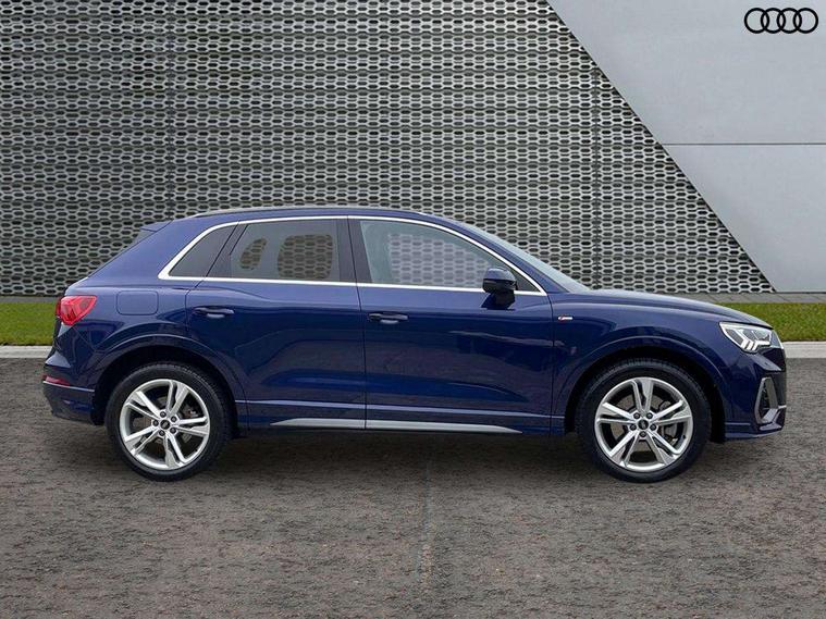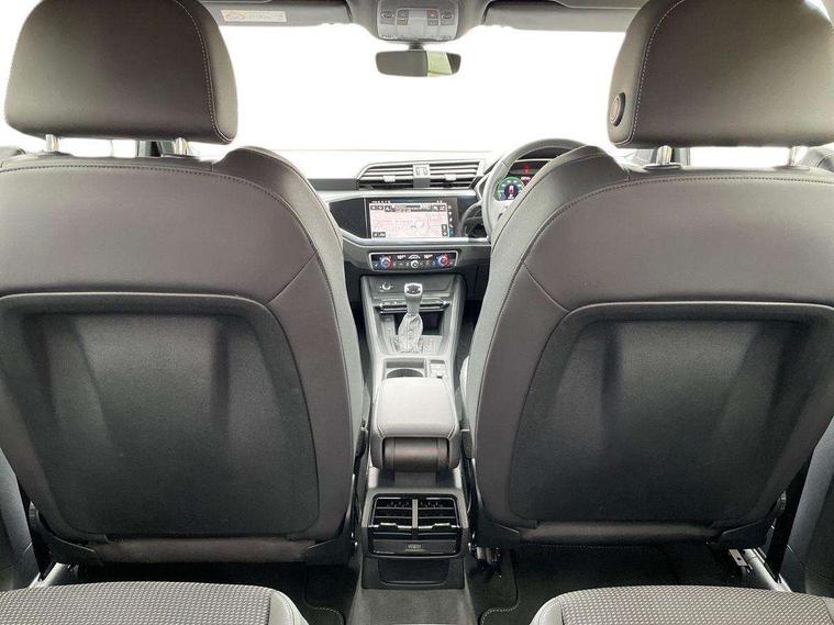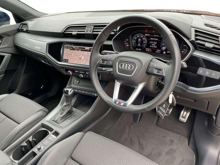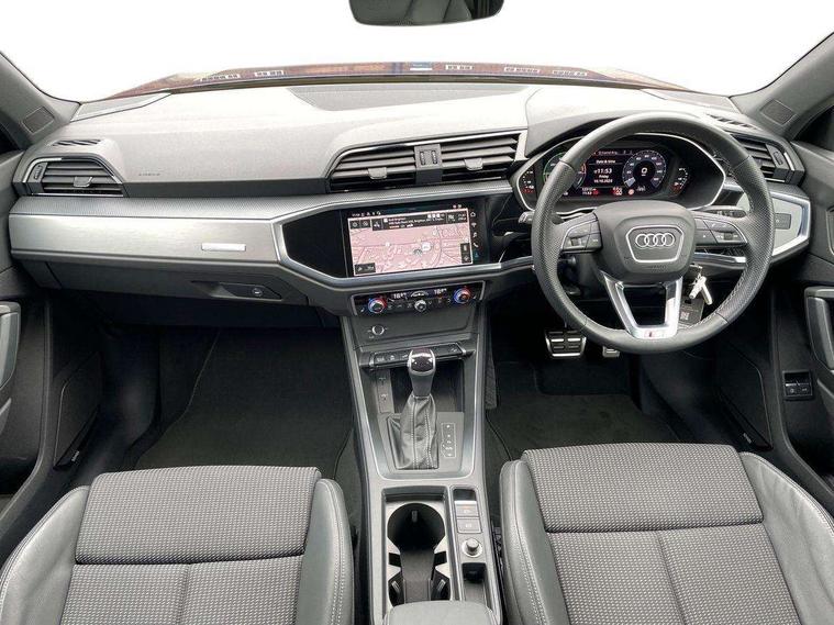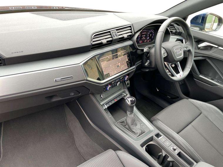Amazon alexa Integration, Audi drive select, Audi lane departure warning, Audi Virtual Cockpit - 10.25" display, Bluetooth interface, Camera based traffic sign recognition, Legal emergency call, MMI Navigation Plus with high resolution 10.1 inch touchscreen colour display, Power operated tailgate, Progressive steering, Service interval indicator, Smartphone interface includes wireless Apple carplay/Android Auto, Start stop system with recuperation, Voice control system with natural language interaction, 3 pin 10 amp domestic charging cable, 3.6 kw On-board charger, Type 2 mode 3 32 amp charging cable, Type 2 socket for AC charging, 2 USB-C ports with charge and data functions, 6 passive loudspeakers, DAB digital radio module, Acoustic windscreen, Aluminium roof rails, Aluminium window trim, Anthracite black radiator grille, Auto dimming frameless rear view mirror, Body colour front spoiler blade, Body coloured bumpers, Electrically folding, adjustable and heated door mirrors with integrated LED side indicators and kerb view function for passenger side, Front and rear electric windows, Front fog lights, Front side air inlets in matt platinum grey, Grille vertical bars in aluminium silver/Matt, High gloss black finish B and C pillars, LED Dynamic rear indicators, LED headlights with LED daytime running lights, LED rear lights, LED third brake light, Privacy glass dark tinted rear and rear-side windows (from B-pillar backwards), Rain and light sensors, Rear diffuser grille in grained matt black, Rear diffuser strip in matt anthracite black, Rear side wing doors, Rear wiper, S line badges on front wings, S Line front and rear bumpers, Side skirt insert in matt Platinium grey, Variable front intermittent wipers, 12V socket in rear centre console, 3 seat bench in 2nd row, 3 spoke leather multifunction steering wheel features S badging and grips in perforated leather with contrast stitching, 40:20:40 folding with manual adjustment for 60:40 forwards/backwards position and backrest angle, Adjustable rear seat bench/backrest with centre armrest and cupholder, Black cloth headlining, Dual zone electronic climate control, Front and rear black floor mats with contrast stitching in rock grey, Front and rear headrests, Front and rear roof module including reading lights, Front centre armrest, Glove compartment lighting, Height and reach adjustable steering wheel, Illuminated door sill trims with S logo, ISOFIX child seat mounting for front passenger with airbag deactivation and outer rear seat including top tether attachment point for outer rear seats, Luggage compartment light, Manual front seats with height adjustment, Perforated leather gearknob, Single front passenger seat, Stainless steel luggage compartment sill finisher, Stainless steel pedals, Ambient lighting pack - Q3, Non smoking pack - Q3, 3x3 point rear seatbelts, 6 airbags - Driver, front passenger, curtain and side windows, Audi pre-sense front with pedestrain and cyclist recognition, Electrically operated child locks on rear doors, Electromechanical parking brake, Electronic stabilisation control including ABS, ASR and EDL, Front seatbelt reminder, Hill descent control, Hill hold assist, Pre sense basic, Seatbelt monitoring, Tyre pressure warning, Warning triangle and first aid kit, Anti theft alarm, Anti theft wheel bolts, Immobiliser, Remote central locking, Aluminium look interior elements, Dark matt brushed aluminium inlay, Detail dashboard around MMI touch colour display in glass look, black with surround in aluminium look, Leatherette door armrest, Tool kit, Tyre repair kit,