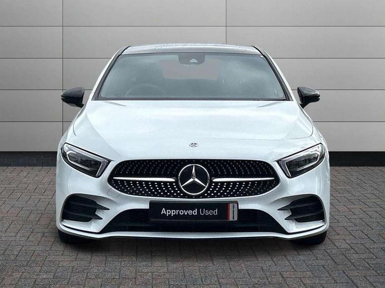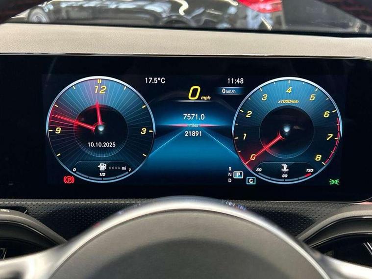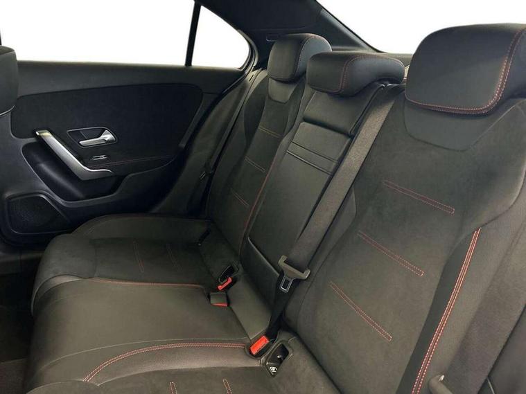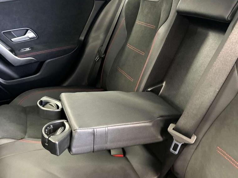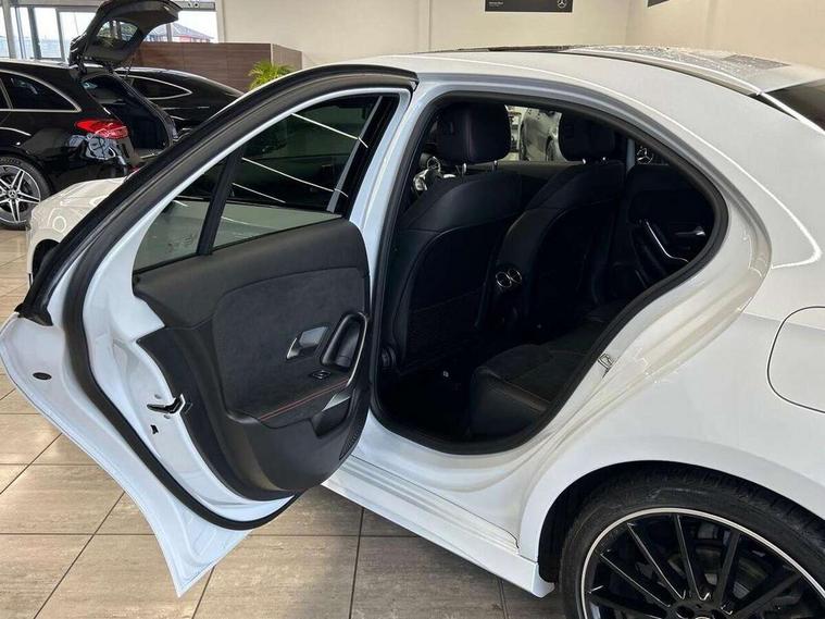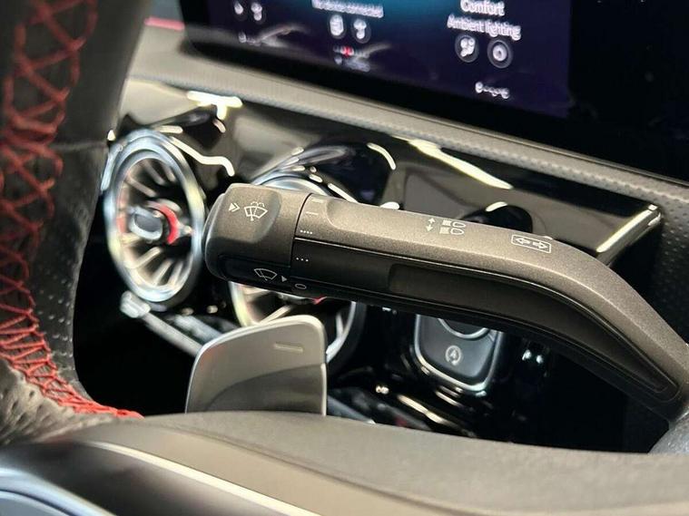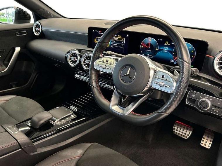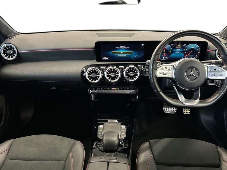 Ultrasonic sensors positioned in the front and rear bumpers, 10.25" Digital instrument cluster display screen, 10.25" media display, 180 degree rear view camera with parking guidelines, Active parking assist with visual and audible warning of detected obstacles, Attention assist, Brake pad wear indicator warning light, Car wash mode, Cruise control + speed limiter, Direct steering, Dual bluetooth interfaces, DYNAMIC SELECT with a choice of driving modes (ECO, Comfort, Sport and Individual), ECO start/stop function, Fluid level warning indicator for fuel, oil, coolant and washer fluid, Hard-disk navigation, Hey Mercedes Voice activation, Lamp failure indicator, Lane keeping system, Mercedes me connect including emergency call system, accident recovery, breakdown management and maintenance, Mercedes me remote services, Outside temperature gauge, Owners manual in English, Pre-installation for car sharing, Preinstallation for Mercedes Benz link, Service indicator (ASSYST), Smartphone integration with Apple CarPlay and Android auto, Speed limit assist, Speed sensitive power steering, Traffic sign assist, Trip computer, Lowered comfort suspension, Rear axle torsion beam, 2 USB ports (type C) in rear stowage compartment and one in front of center console, 6 speakers, DAB Digital radio, MBUX multimedia system with DAB digital radio and touchpad including satellite navigation, Mercedes-Benz sound system - 100W, 4 Electric Front and Rear windows, Adaptive brake lights, AMG bodystyling - Front apron with splitter in chrome, rear apron with chrome trim and chrome visible trim elements in tailpipe, Automatic headlights, Black weather strip, Body colour bumpers, Body colour door handles with chrome inserts, Body colour side skirt, Electric adjustable and heated door mirrors with integrated LED side indicators, Exclusive diamond radiator grille, Exhaust system - Twin visible tailpipes in polished stainless steel, Headlamp assist automatic headlamp activation, Heated glass rear windscreen + timer control, LED daytime running lights, LED tail lamp, Multibeam LED headlights with adaptive highbeam assist plus, Panoramic sliding sunroof, Privacy glass, Radio aerial, Rain sensing windscreen wipers with two sensitivity settings, Rear boot, Rear fog lights, Rear side wing doors, Third brake light featuring LED technology, 3 seat bench in 2nd row, 3 Spoke flat bottom leather multi function steering wheel with perforated leather in grip area, 40:20:40 split folding rear seats, Artico man-made leather/Microfibre Dinamica upholstery with red contrast stitching, Auto Mercedes-Benz child seat recognition sensor, Black air vents with surround in silver chrome, Black roof lining, Brushed stainless steel sports pedals with rubber studs, Controller on centre console with chrome surround, Floor mats with AMG lettering, Front centre armrest with storage compartment, Front seat backs luggage nets, Galvanished gear shift paddles on steering wheel, Heated front seats, Height/reach adjustable steering column, Illuminated Mercedes Benz lettering front door sills with changeable cover, Interior lighting - 64 colour Ambient lighting, Interior mirror with reading lamps in black and frameless, ISOFIX and top tether child seat fixing points in two outer rear seats, Rear armrest with 2 cupholders, Rear head restraints, Seat occupancy sensor for front passenger seat, Single front passenger seat, Sports seats with adjustable head restraints, Stowage compartment in centre console with retractable cover, Sunvisors with illuminated vanity mirrors, Touchpad on center console, Twin front cupholders, Two zone thermotronic luxury automatic climate control, Light and sight pack - A Class, Mirror package - A Class, Night pack - A Class Saloon/Hatchback, Seat comfort pack - A Class, 3 rear 3 point seatbelts, ABS with Brake Assist, Active bonnet, Active brake assist includes forward collision warning system with autonomous braking, Adaptive brake assist with hold function and hill start assist, Black seatbelts, Childproof locks manually operated for rear doors and electrically operated for rear power windows, Crash responsive emergency lighting, Driver and passenger head and side airbags, Drivers knee airbag, Dual stage driver/passenger airbags, Electronic parking brake, ESP curve dynamic assist, ESP with ASR, Front and rear seatbelt reminder, Front brake callipers with Mercedes Benz lettering, Tyre pressure monitoring system, Warning triangle and first aid kit, Window airbags, Alarm system/interior protection/immobiliser, Keyless entry lock/unlock, Keyless Go, Remote central locking and crash sensor with emergency opening function, Urban guard vehicle protection system with immobiliser and interior protection, Matrix look light longitudinal grain aluminium trim element, 19" multi spoke light alloy wheels painted in black with a high sheen rim flange, Summer tyres, Tirefit sealant kit,