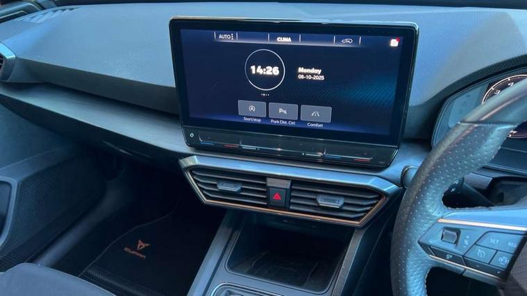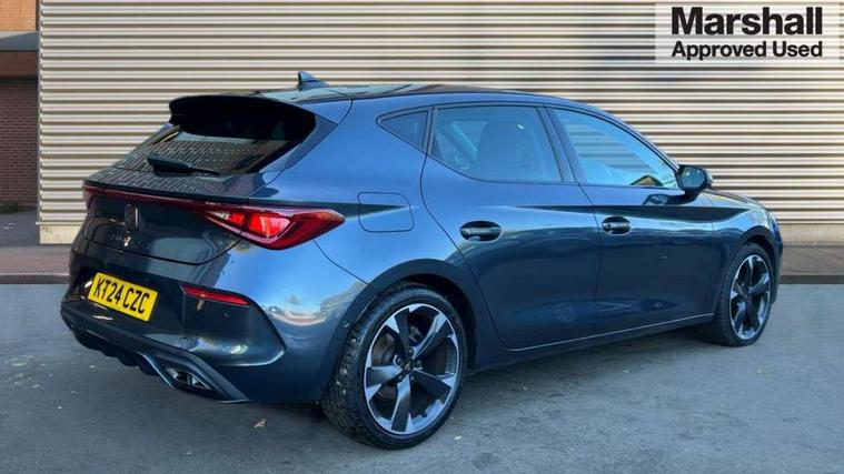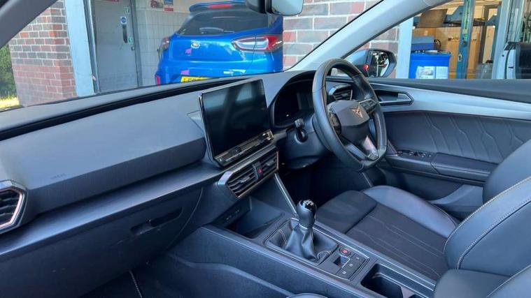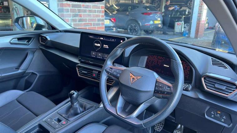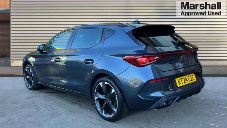 CUPRA drive profile selection with (Comfort/Sport/Individual), throttle response and gearshift mode, Digital cockpit, E-call, Electro mechanical speed sensitive power steering, Four x USB Type C ports (2 in front and 2 in rear), Front assist with forward collision warning braking reaction to vehicles, pedestrians and cyclists, Full link smartphone integration with Mirror Link, wireless Apple CarPlay and wired Google Android Auto, Lane assist, Lockable tailgate, Park assist (inc front/rear parking sensors), Rear view camera, RPM, trip computer, outside temp gauge, instrument light brightness, low fuel warning light, lights on reminder, gearshift indicator, Service interval indicator, Start/stop system with regenerative braking, Wireless phone charger, Sports suspension, Auxiliary input socket, Auto dimming rear view mirror, Body colour door handles, Body coloured bumpers, Cupra sports bumpers, Dark tinted rear windows, Electric front/rear windows, Electrically adjustable, heated and folding door mirrors, LED front fog lamps with cornering function, LED headlights with dynamic turn signals, tail lights, rear fog lights with rear coast to coast lighting, Rain sensing wipers, Rear diffuser with twin exhaust pipe on each side, Rear side wing doors, Rear wash/wipe, Separate daytime running light with automatic headlight control and coming home feature, Third brake light, 12v power supply in centre console, 3 seat bench in 2nd row, 5 headrests, 60/40 split rear bench seat with armrest, Ambient lighting with glovebox, footwell and single monocolour, Cupra Leather flat bottomed, perforated steering wheel, Driver/passenger manual seat height adjustment, Folding boot cover, Front and rear reading lights X 4, Front centre armrest, Front seats manual lumbar adjustment, Grey headlining, Height/reach adjust steering wheel, Illuminated interior front door sills, ISOFIX points in outer rear seats with top tether anchorage points, Jack and tool kit, PVC/Cloth upholstery with copper stitching, Single front passenger seat, Sports seats, Sunvisors with illuminated mirror, Three zone climate control, Media system plus with navigation pack - Leon Cupra, Safety and driving pack (M) - Cupra leon, 3 point seatbelts on all rear seats, ABS, Brake control system - ESC and brake booster, Child proof door locks, Cupra black brake calipers, Driver and front passenger airbags with front passenger airbag de-activation, front side and curtain airbags, Electronic parking brake, Extended safety system - seat belt tensioner, window closure and hazard lights, Hill hold control, Rear disc brakes, Seat belt reminder for front and rear seats, Tiredness recognition system, Tyre pressure monitoring system, Anti theft alarm system with interior monitoring in cab, backup horn and towing protection, KESSY Advanced - Keyless start, keyless entry, Locking wheel bolts, Chrome and copper interior detailing, 18" Machined sport black and silver alloy wheels with 92Y tyres,