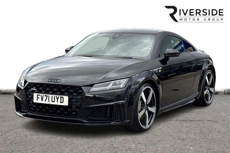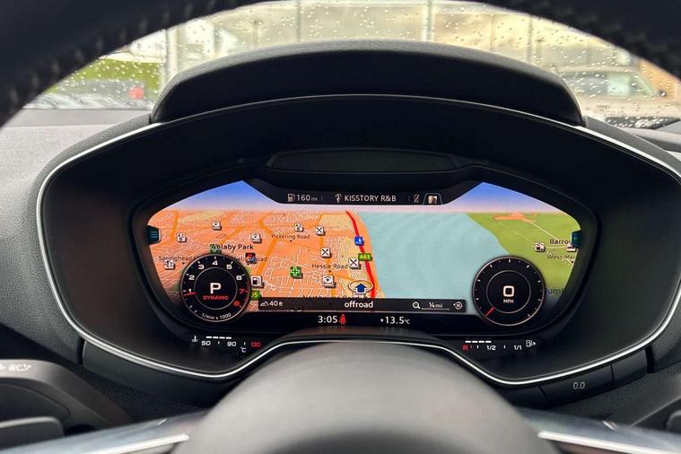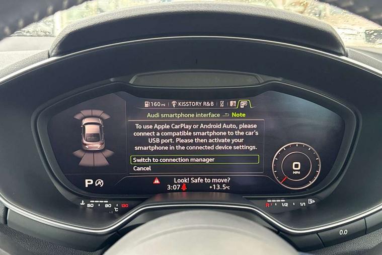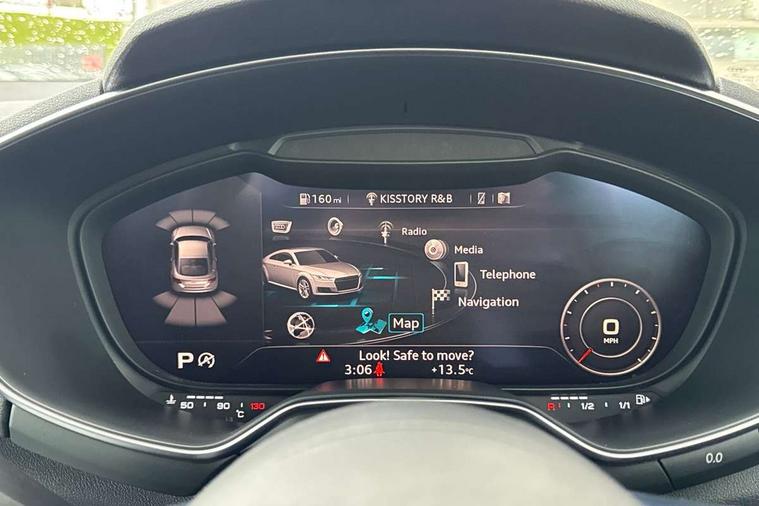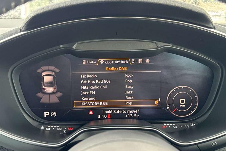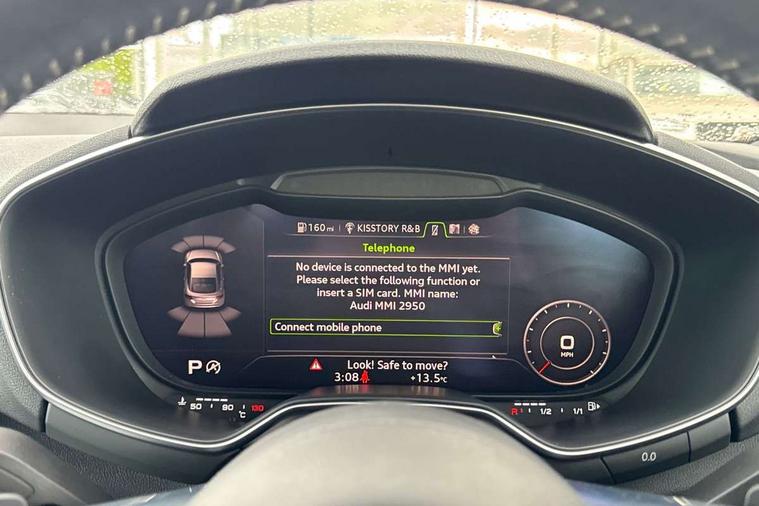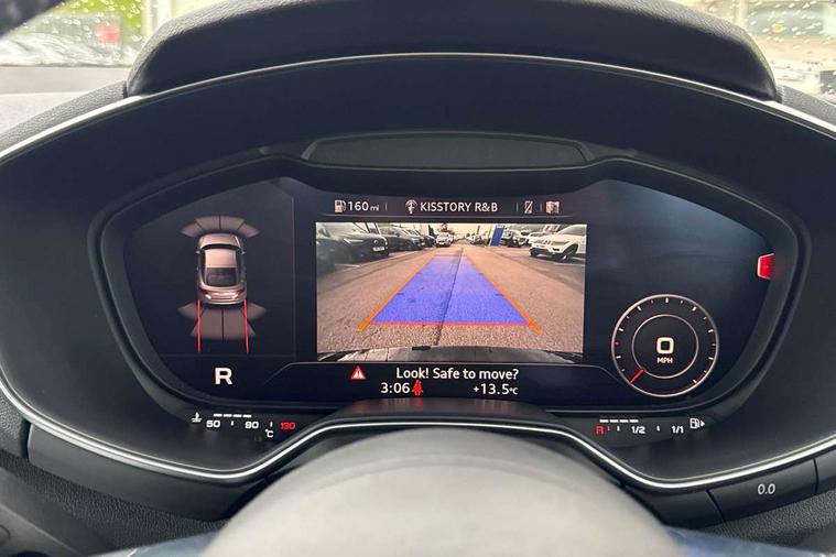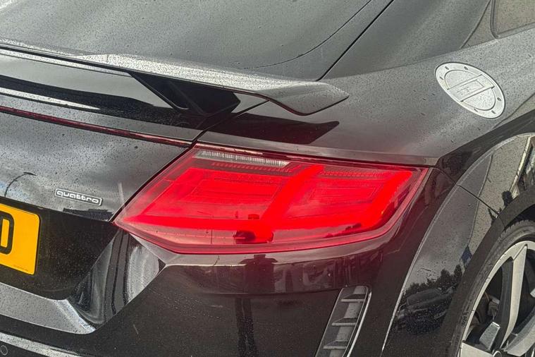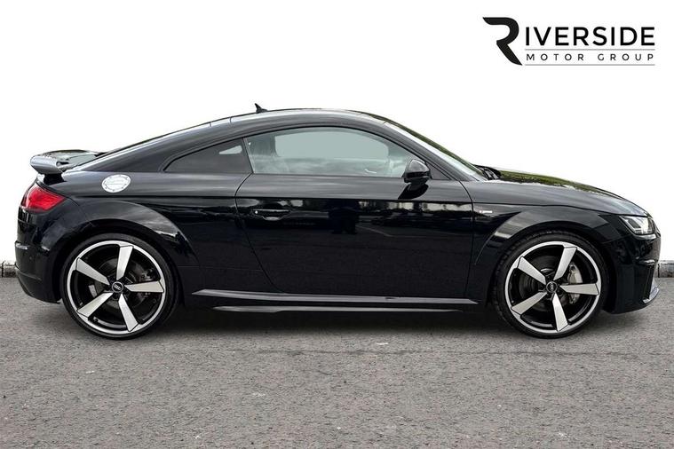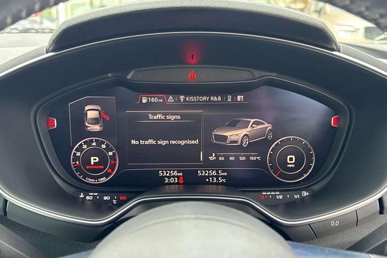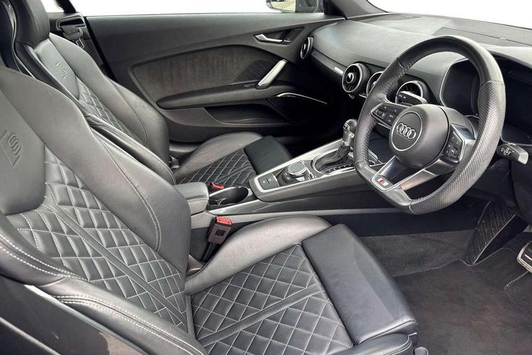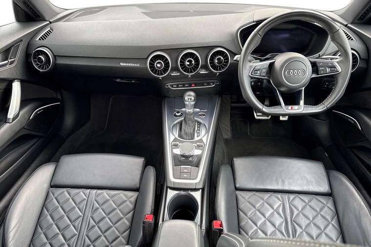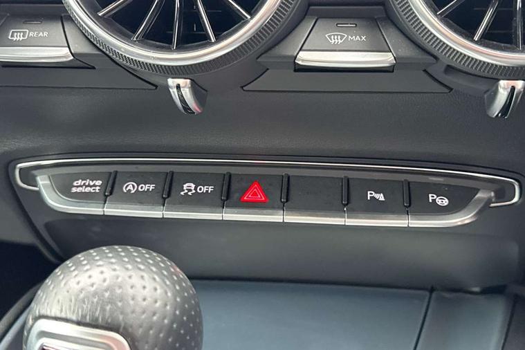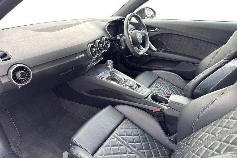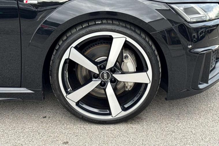 Audi drive select with 4 Pre configured modes, Audi side assist, Audi smartphone interface, Camera based traffic sign recognition, Cruise control + speed limiter, Emergency call service, Mobile phone preparation with bluetooth interface, Progressive power assisted steering, Service interval indicator, Start/Stop system with energy recuperation, TP memo, Sports suspension, AM/FM radio, Bluetooth audio streaming, DAB Digital radio, MMI Radio with CD player and SD/XC card slot, Audi Beam uses LEDs to project the Audi Sport logo, Auto dimming rear view mirror, Black chrome tailpipe, Dark privacy glass from B-pillar backwards, Electric front windows, Electrically adjustable, foldable and heated auto dimming on driver side and automatic kerb view dipping function on the passenger side, Front fog lights, Green tinted heat insulating glass, High beam assist, LED 3rd brake light, LED Dynamic rear indicators, Light and rain sensors, Matrix LED light+LED daytime running light, LED Indicator, Headlightclean, auto dynm headlight range+dynamic cornering light, Motorwaybeam/Manoeuvre light, Rear boot, Sunband for windscreen, 12V socket, 2 rear seats, 3 spoke flat bottomed high multi-function leather sport steering wheel with gearshift paddles, Black headlining, Deluxe auto air conditioning with integrated digital display, Door sill trims, Extended aluminium look with stainless steel pedals, Fine Nappa leather with electrically adjustable 4 way lumbar/Super Sport front seats + "S" embossing, Front centre armrest, Front passenger seat, Heated front seats, Height adjustable front head restraints, Height/reach adjust steering wheel, ISOFIX child seat mounting for front passenger seat with airbag deactivation, Perforated leather gearknob in black, Rear head restraints, Rear top tether child seat ISOFIX attachment, Split folding rear seat, Black styling pack - TT, Comfort and sound pack - TT with park assist, LED interior light pack - TT/TT RS, Non smoking pack - TT/TT RS, Technology pack without Audi phone box - TT, 3 point front seat belts, ABS, ASR traction control, Curtain airbags, Driver and front passenger airbag with front passenger airbag deactivation, EDL traction control, Electromechanical parking brake, ESP, First aid kit, Front side airbags, Head airbags, Hill hold assist, Seatbelt warning, Tyre pressure loss indicator, Warning triangle, Anti theft alarm, Anti theft wheel bolts, Immobiliser, Keyless Go, Remote central locking, Matt brushed aluminium inlays, 20" 5 arm cutter style Audi sport in anthracite black diamond cut alloy wheels, Tool kit, Tyre repair kit,