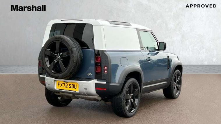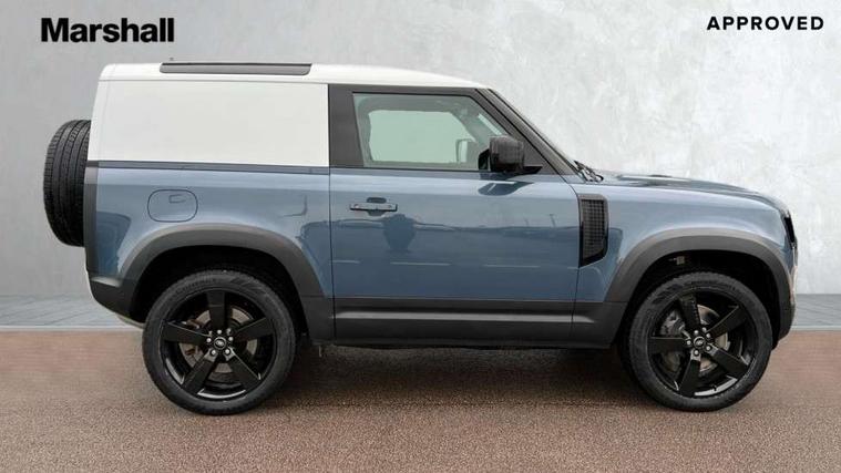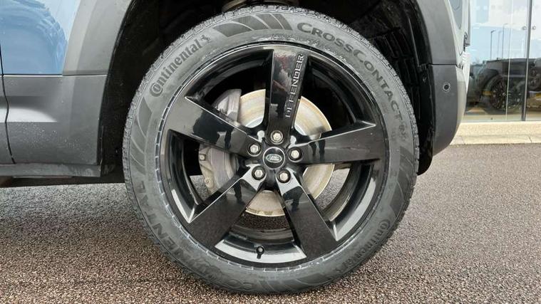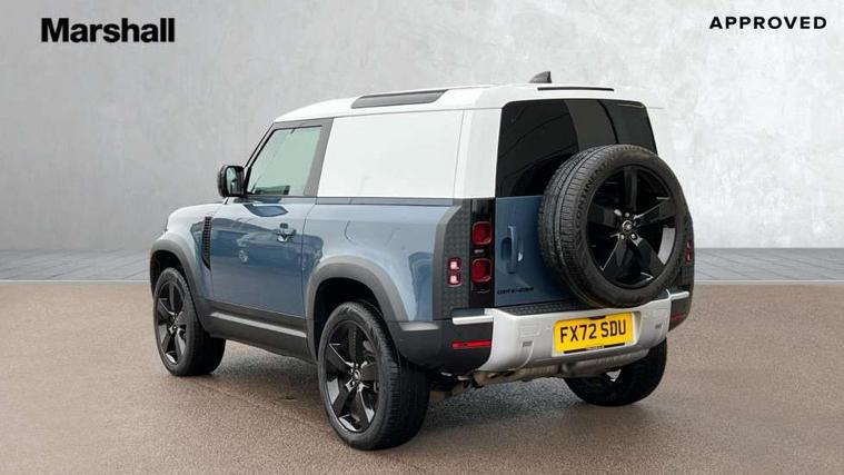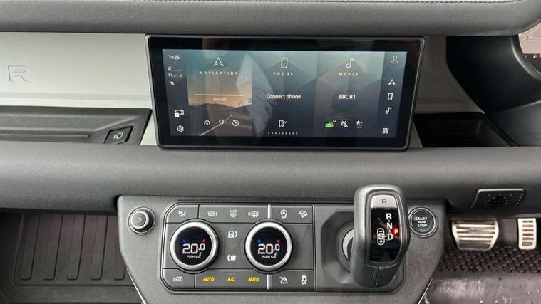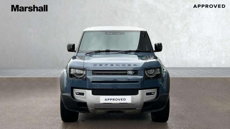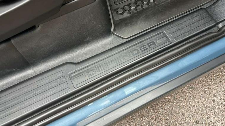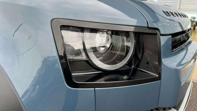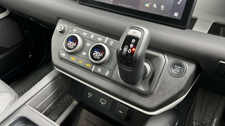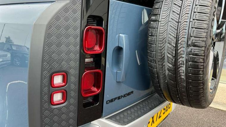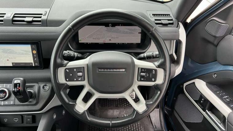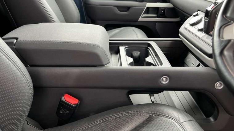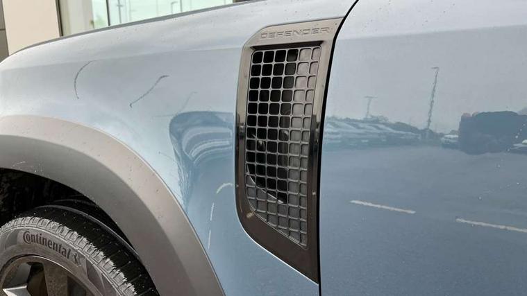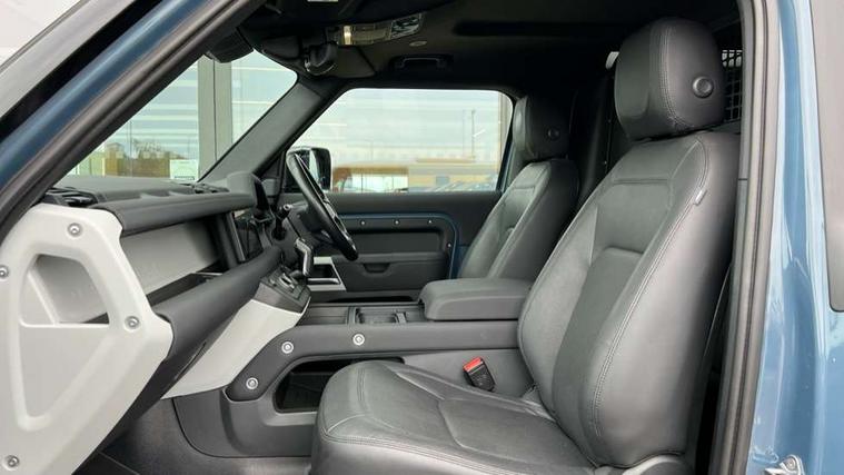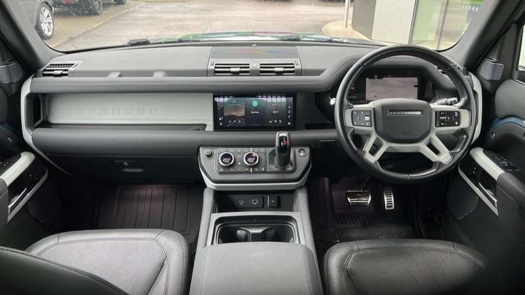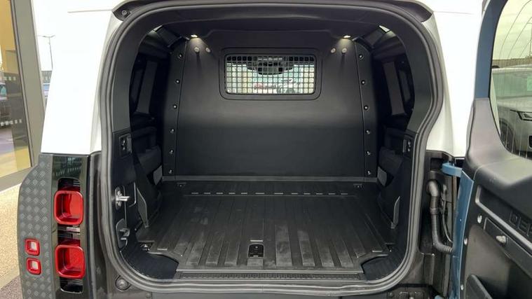 Customer Configurable Autolock, 360 parking aid, 3D Surround Camera with 360 View, 180 Rear View, Front Traffic Detection, Forward Vehicle Guidance, Tow Hitch Assist and clear sight Ground View, Blind spot assist, Brake Hold, Driver condition monitor, Electric power assisted steering (EPAS), Lane keep assist, Low traction launch, Pivi pro connected, Rear traffic monitor, Traffic sign recognition adaptive speed limiter, Trip computer, Tyre pressure monitor, Wade Sensing, Android Auto, Apple CarPlay, DAB Radio (Digital Audio Broadcasting), Meridian 280W sound audio system with 7 speakers with subwoofer, Alpine lights, Assisted tailgate, Auto High Beam Assist, Automatic headlight levelling, Automatic headlights and rain sensitive front wipers, Centre high mounted stop light, Electric heated/power fold door mirrors with approach lights and auto dimming driver side, Electric windows with one touch open/close and anti-trap, Exterior signage panel, Follow me home lighting, Front fog lights, Heated rear window with timer, Heated windscreen, LED tail light, Privacy glass, Puddle lights, Rear fog lights, Rear wash wiper, Side-hinged tailgate, Standard roof, Standard tread plates, Additional lashing points, Dual zone climate control, Durable rubber cabin flooring, Footwell lights, Full height bulkhead behind row 1 seats, Glovebox storage, High sided rubber mats, Loadspace cover, Loadspace hooks, Loadspace rubber mat, Manual adjustable steering column, Overhead stowage for sunglasses, Rear centre headrest, Rear reading light, Standard interior, Standard seating configuration, Sunvisors with illuminated vanity mirrors, Twin front cupholders, Upgraded loadspace LED lighting, Online pack - Defender with data plan, Brake pad wear indicator, Electronic traction control, Emergency braking, Front airbags, with passenger seat occupant detector, Power operated child locks, Remote for (e-Call, Optimised assistance call, InControl app, Climate, beep and flash and door), Seat belt reminder, Intrusion sensor, Keyless entry system, Locking wheel nuts, 8 speed automatic transmission, ABS and EBA, All wheel drive, CBC - (Cornering brake control), Dynamic stability control, Electronic brake force distribution, Electronic park brake, Gradient acceleration control, Hill Descent Control, Hill start assist, Particulate filter (DPF), Push button start, Roll stability control, Trailer stability assist, Twin speed transfer box (high/low range),