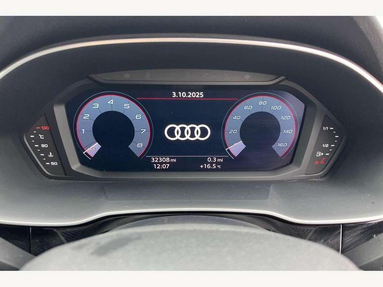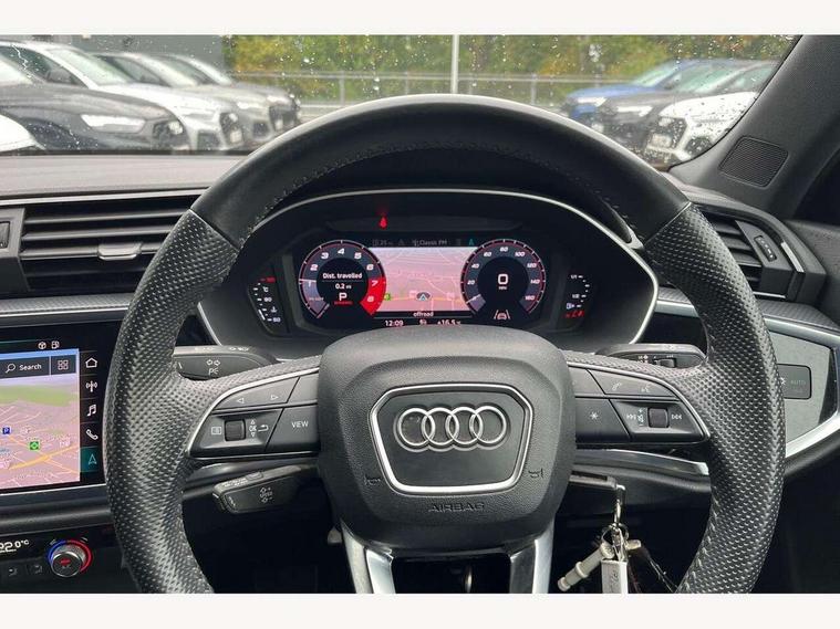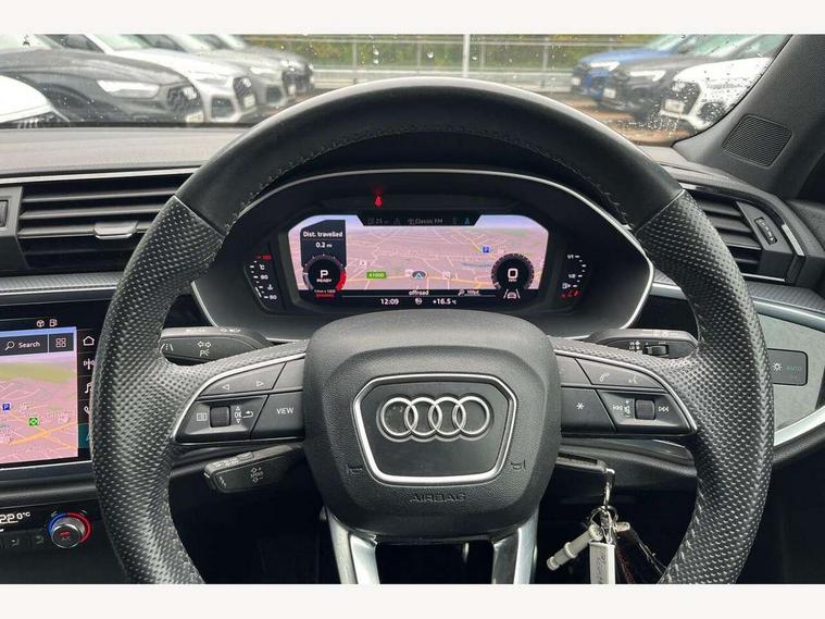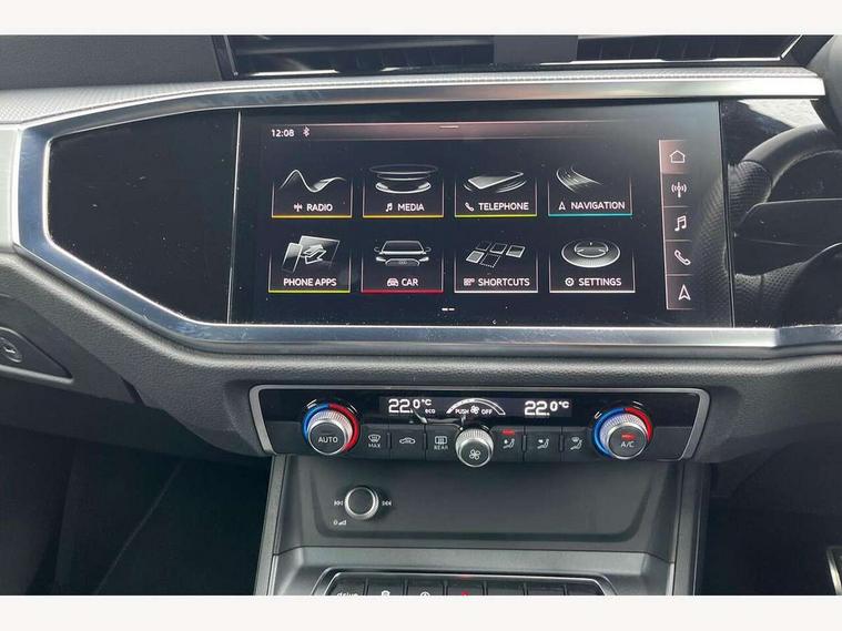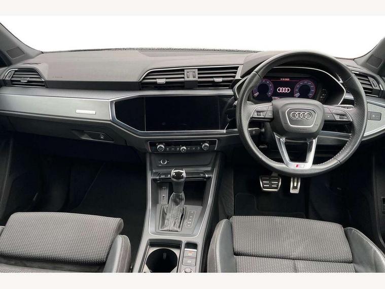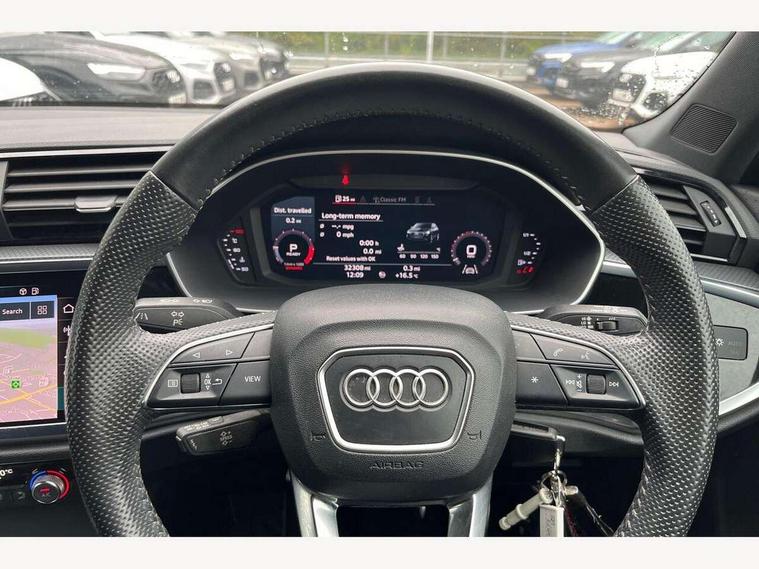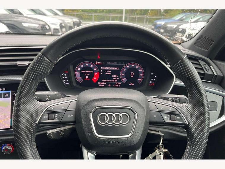 Audi connect safety and service (e-call), Audi drive select, Audi lane departure warning, Audi side assist, Audi smartphone interface, Audi Virtual Cockpit - 10.25" display, Bluetooth interface, Camera based traffic sign recognition, MMI Navigation Plus with high resolution 10.1 inch touchscreen colour display, Power operated tailgate, Progressive steering, Service interval indicator, Start stop system with recuperation, Voice control system with natural language interaction, Sports suspension, 1 x USB type C and 1 USB type A charging points, 6 passive loudspeakers, DAB digital radio module, Acoustic windscreen, Aluminium window trim, Auto dimming frameless rear view mirror, Diffuser grille in grained matt black, Diffuser trim in selenite silver, Electrically folding, adjustable and heated door mirrors with integrated LED side indicators and kerb view function for passenger side, Front and rear electric windows, Front fog lights, Front side air inlets in selenite silver, Front underbody protection in manhattan grey paint finish, Grille surround in aluminium silver matt, High gloss black finish B and C pillars, LED headlights with LED daytime running lights and dynamic rear indicator, LED rear lights, Privacy glass dark tinted rear and rear-side windows (from B-pillar backwards), Radiator grille in titanium black with inlay in matt aluminium silver, Rain and light sensors, Rear underbody protection in matt black, S line badges on front wings, Side skirt insert in matt Platinium grey, 12V socket in rear centre console, 40:20:40 folding with manual adjustment for 60:40 forwards/backwards position and backrest angle, Adjustable rear seat bench/backrest with centre armrest and cupholder, Black cloth headlining, Dual zone climate control, Front and rear black floor mats with contrast stitching, Front and rear headrests, Front and rear roof module including reading lights, Front centre armrest, Glove compartment lighting, Illuminated door sill trims with S logo, ISOFIX child seat mounting and Top Tether with front passenger airbag deactivation, Luggage compartment light, Manual front seats with height adjustment, Perforated leather gearknob, Stainless steel luggage compartment sill finisher, Stainless steel pedals, Non smoking pack - Q3, 3x3 point rear seatbelts, 6 airbags - Driver, front passenger, curtain and side windows, Electrically operated child locks on rear doors, Electromechanical parking brake, Electronic stabilisation control including ABS, ASR and EDL, Hill descent control, Hill hold assist, Pre sense basic, Seatbelt monitoring, Tyre pressure warning, Warning triangle and first aid kit, Anti theft alarm, Anti theft wheel bolts, Audi pre-sense front with pedestrain and cyclist recognition, Remote central locking, Dark matt brushed aluminium inlay, Leatherette door armrest, MMI touch colour display in glass look, black with surround in aluminium look,