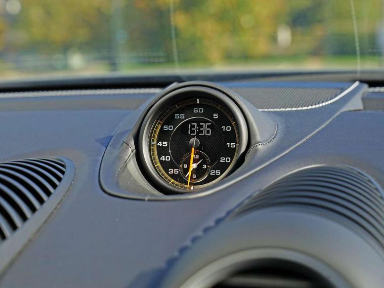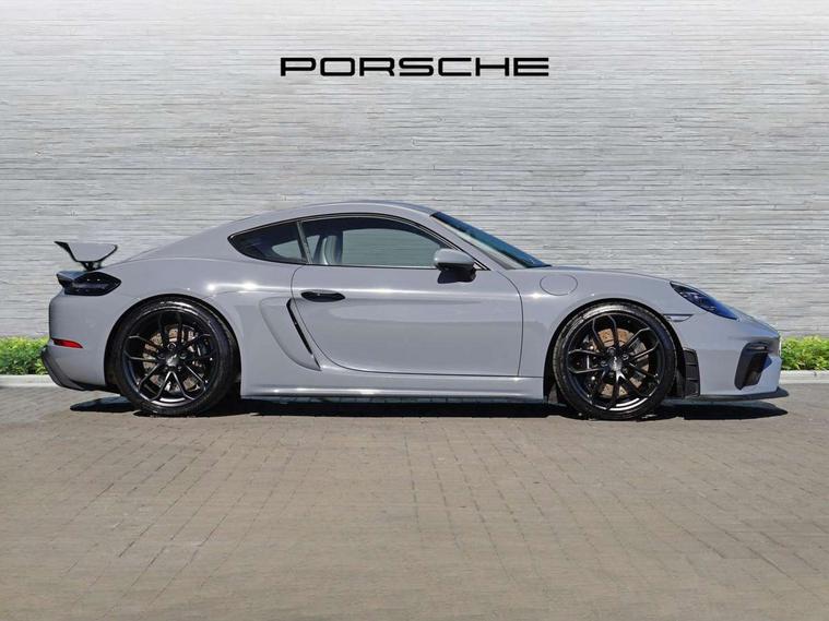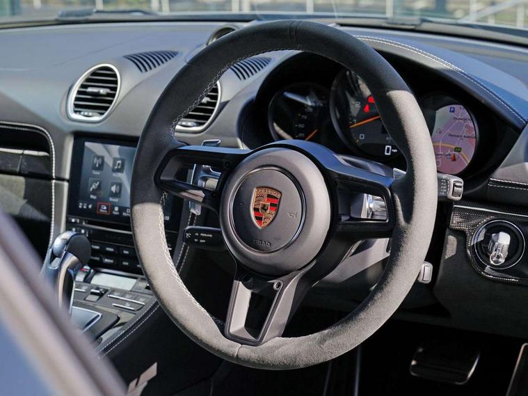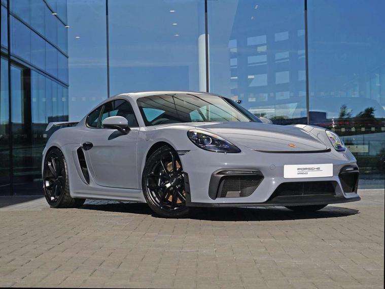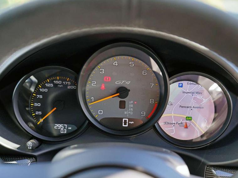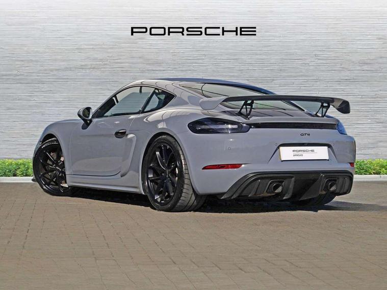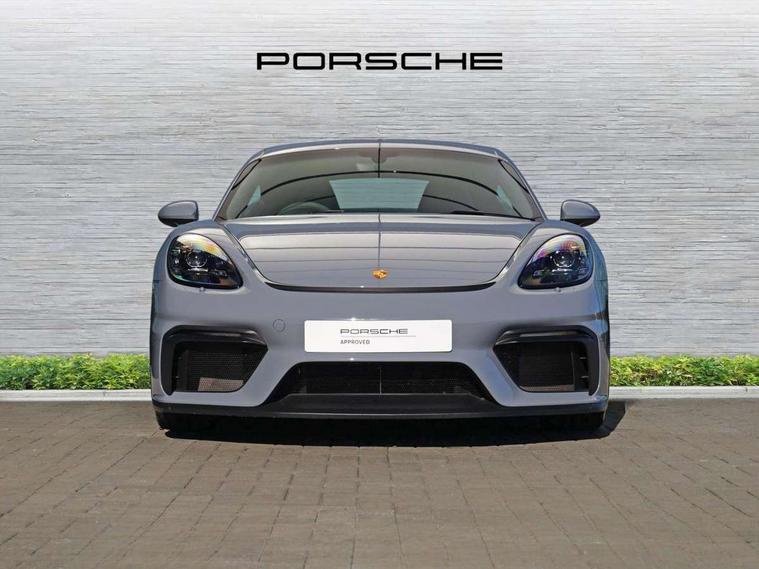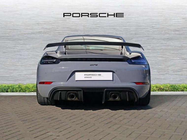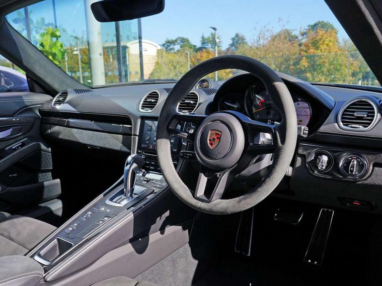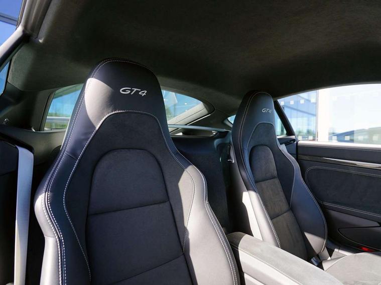 Auto blip button to activate automatic throttle-blipping for downshifts, Auto start and stop system, Cruise control, Digital displays for vehicle speed, chosen gear, odometer, trip odometer and clock, eCall emergency call system, Electromechanical direct steering with variable steering ratio and steering pulse generator, Instrument cluster with central rev counter and high-resolution 4.6 inch colour display, Porsche track precision app, 64 litre fuel tank, Adjustable chassis for race track use (toe, camber, anti-roll bars), Aluminium block and cylinder heads, Central cooler, Direct fuel injection (DFI), Dynamic gearbox mount system, Gasoline particulate filter, Integrated dry-sump lubrication with an on-demand oil pump, Porsche Active Suspension Management (PASM) sport suspension with lowered 30mm ride height, Porsche Doppelkupplung (PDK), Porsche stability management (PSM) including ABS with two switchable stages (ESC OFF and ESC+TC OFF), Porsche TORQUE Vectoring (PTV) with mechanical rear differential lock, Rear wheel drive, Shortened gear lever, Two seater vehicle with mid mounted engine, Two three-way catalytic converters and on-board diagnostics for monitoring emission control system and coated particulate filter, Variable intake manifold with two switchable resonance valves, VarioCam (camshaft control for inlet and exhaust valves) and adaptive cylinder management, Water cooled with thermal management, DAB Digital radio, Integrated 4G/LTE compatible SIM including data for the Porsche Connect Services, Integrated compatible SIM including Porsche Connect Services, Navigation incl porsche + Apple Carplay, connect module, wireless internet access, carfinder, remote vehicle status, remote service and vehicle track, Wifi and music streaming, 3rd brake light, Automatic headlight activation including welcome home lighting, Black side window trim, Body colour bumpers, Body colour door handles, Closed underbody panel with two additional ventilation openings (NACA) for exhaust system, Door opening loops in silver, Electrically adjustable heated exterior mirrors on door waist rails, aspherical on driver's side, Fixed GT4 rear wing in exterior colour with integrated sideplates, wing uprights in black aluminium, Fixed rear spoiler, Front apron with large cooling intakes with grilles and spoiler lip with recessed GT4 logo in black and central air outlet, Green tinted heat insulating glass, Grey top tinted windscreen, Heated rear windscreen, Intelligent lightweight body in Aluminium/Steel composite construction, LED tail lights and integral 4 point brake lights and reversing lights, Power windows with one touch operation and door seal protection, Rain sensor, Rear apron lower part in black with integrated rear diffuser, Rear boot, Separate tinted auxiliary lights in the front end with LED indicators and position lights, Side air intakes with sideblades embossed with 'GT4' logo painted in exterior colour, Twin tract sports exhaust system with two tailpipe in stainless steel high gloss black, Wide opening rear hatch with heated screen, Windscreen washer system with aero wiper blades and washer jets, 12V sockets in passenger footwell and centre console storage compartment, Additional smooth finish leather with door panel armrest and centre console main storage compartment, Adjustable fan with air recirculation and defroster functions, Ascending centre console with uncovered storage compartment and closed storage compartment, Clothes hooks on front seat backrests, Footwell illumination, Front and rear luggage compartments, Front headrests, GT4 logo on gear lever, Heated seats, LED reading lights, orientation, ignition lock, additionally luggage compartment and glove compartment lighting, Lockable glovebox, Performance display in Porsche communication management (PCM), Race-Tex roof lining and A pillar trims, Seat centres in race tex, side bolsters, headrests in leather and headrests embroidered with GT4 logo in silver, Single front passenger seat, Storage compartments in each doors, Two individual cup holders (Passenger side, integrated into dashboard trim strip), 3 point automatic seatbelts, ASR, Electrically controlled parking brake, Front lightweight spring strut axle, Front seatbelt pretensioners + load limiters, Full size driver and passenger airbags, Lightweight spring strut rear axle, helper springs, anti roll bar, suspension mountings partly ball jointed, Passenger airbag deactivate switch, Porsche side impact protection doors with thorax airbag in outer backrest side bolster and head airbag for driver/passenger in door panel, Tyre pressure monitoring system (TPM) with track mode, Alarm system with interior surveillance, Anti-theft wheel bolts, Dashcam prep, Engine immobiliser with in key transponder, central locking and remote control, 20" 718 GT4 alloy wheels in satin platinum in sport tyre, Tyre repair kit,