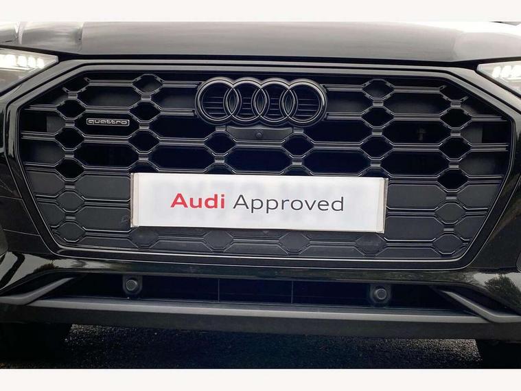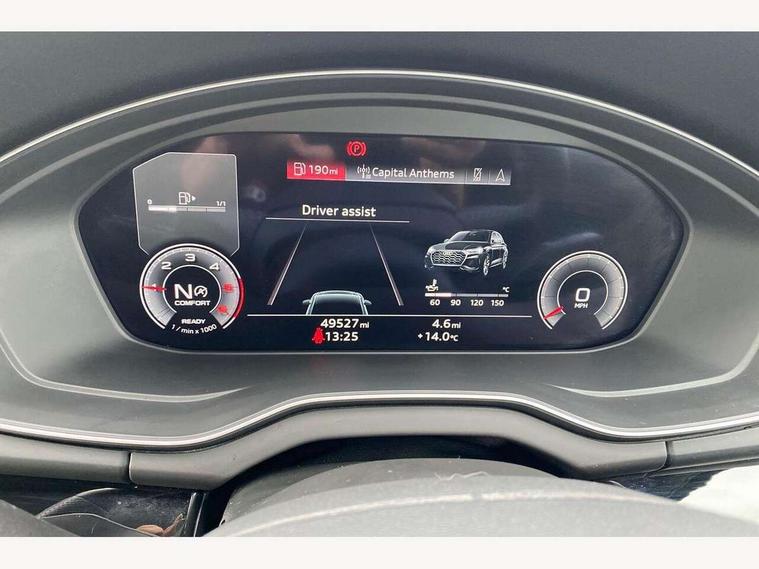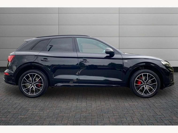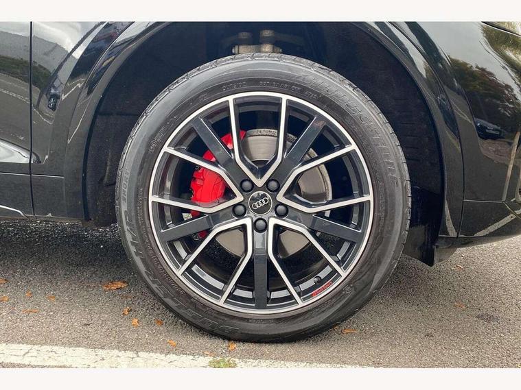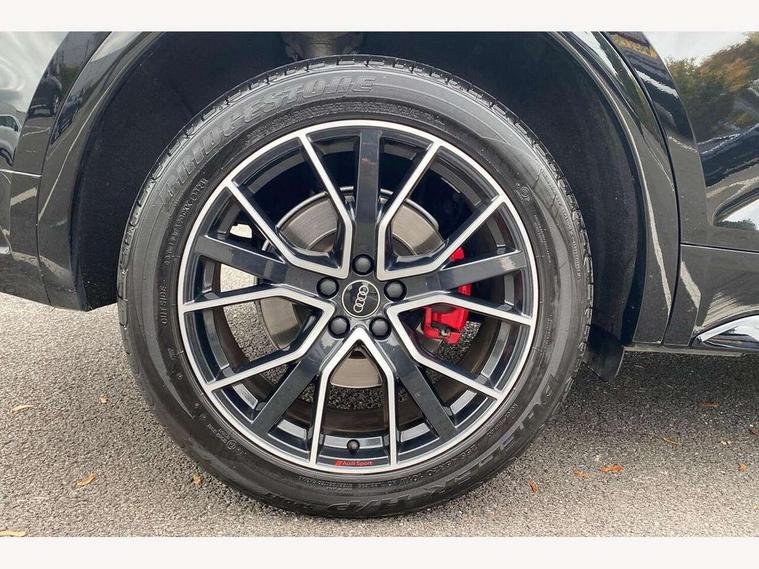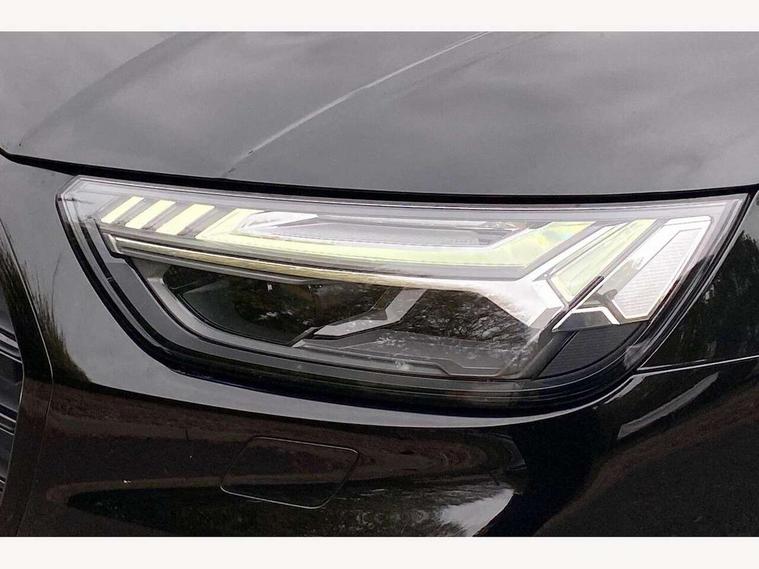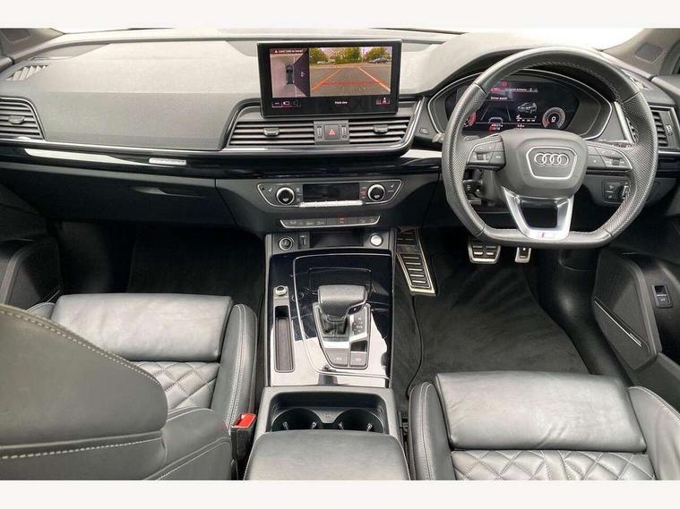 Audi connect safety and service (e-call), Audi connect with Amazon Alexa Integration, Audi drive select, Audi virtual cockpit plus with 12.3" screen and three different layout designs, Audi wireless smartphone interface, Automatic start-stop system with coasting functionality and efficiency programme, Bluetooth interface, Electro - mechanical power assisted steering, MMI navigation plus with 10.1" touch screen, Power tailgate, Reversing camera, Service interval indicator, Voice control system with Audi hotword activation "Hey Audi", Diesel particulate filter, Quattro on demand, S line sports suspension, 2 x USB charging port with aux input socket, DAB Digital radio, Acoustic windscreen, Audi matrix LED headlights with dynamic front and rear indicators, Audi rings at front and rear in black, Audi rings decal on rear doors, Auto dimming door mirrors, Auto dimming rear view mirror, Automatic headlights and windscreen wipers, Black door mirrors, Black roof rails, Body colour bumpers, Body colour underbody protection, Chrome plated exhaust trims, Daytime running lights, Door sills in Selenite silver, Electric adjustable/heated/folding door mirrors, Front air inlet surrounds in titanium black, Front and rear electric windows, Headlight washers, High gloss black B pillar trims and triangular rear door trim, High level LED brake light, Rear chrome trim strip below lights, Rear privacy glass and rear side windows, Rear side wing doors, Rear wiper, Roof bars, S Line rear spoiler, 3 rear headrests, 4 way electric lumbar support for driver and front passenger, 40:20:40 split folding 3 rear bench seat in 2nd row with rear centre armrest, Black cloth headlining, Comfort front centre armrest, Contrast stitching on seats, steering wheel and gear lever gaiter, Deluxe 3 zone electronic climate control, Electrically adjustable front seats, Fine Nappa leather upholstery with diamond pattern contrast stitching + front sport seats with S embossed logo, Front/rear floor mats, Gear lever in black leather, Heated front seats, Height adjustable front head restraints, Height/reach adjustable steering column, Illuminated door sill trims with S logo, ISOFIX child seat mounting and top tether, Rear seat bench plus, Removable luggage compartment floor, Single front passenger seat, Stainless steel pedals, Sunvisors with vanity mirrors, Black styling package - Q5 Edition 1, Extended interior upholstery pack - Q5, Extended LED Interior multi coloured Lighting Pack - Q5, 3 point seatbelts on all seats, 6 airbags - Driver, front passenger, curtain and side airbags, Electrically operated child locks on rear doors, Electromechanical parking brake, Electronic stabilisation control including ABS, ASR and EDL, Front and rear brake calipers painted in red, Front passenger airbag deactivation, Hill descent control, Hill hold assist, Multi collision brake assist, Pop-up bonnet for pedestrian protection, Pre sense city, Seat belt force limiter, Seatbelt monitoring, Tyre pressure warning, Warning triangle and first aid kit, Anti theft alarm, Anti-theft wheel bolts, Keyless Go access/ignition system, Remote central locking, Piano black finish inlay,