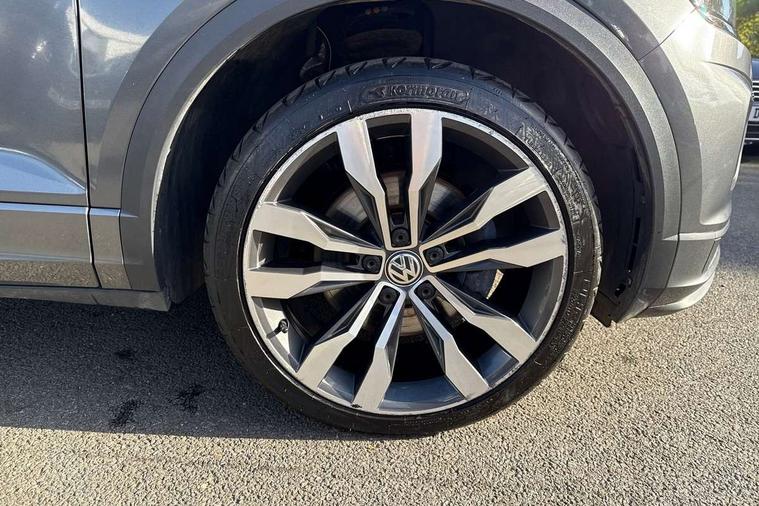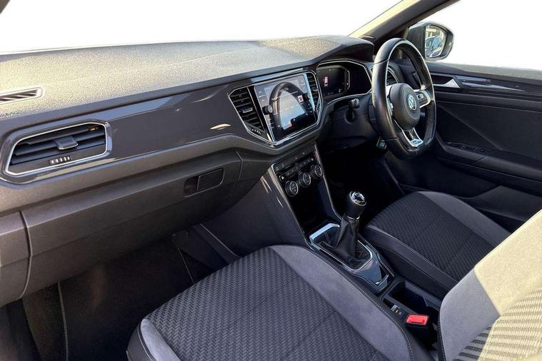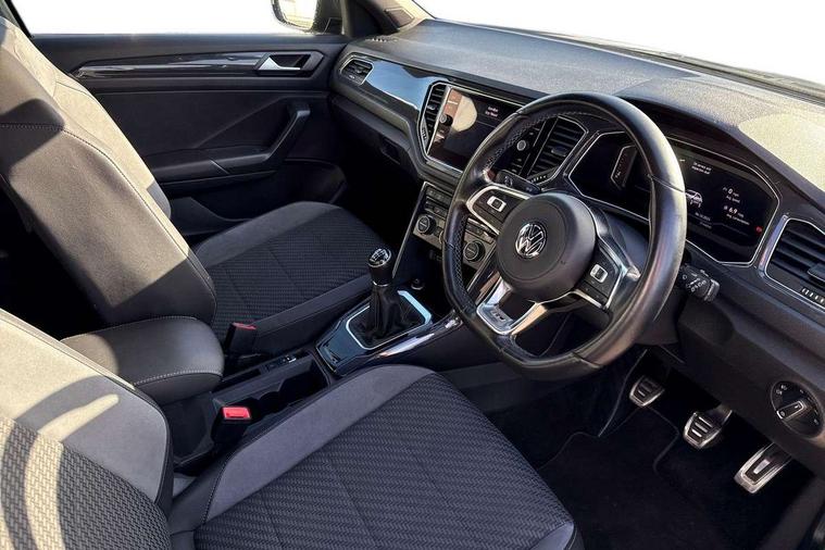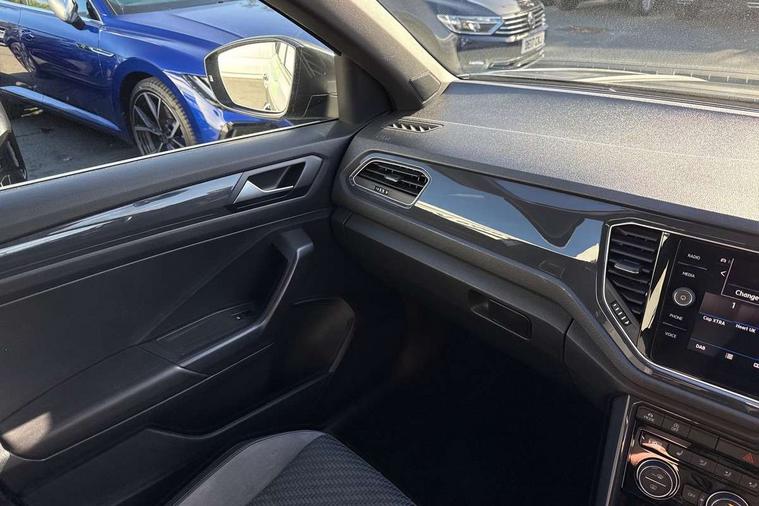 App-Connect, 2 USB connection charging sockets, Active Info Display, 10.3" high resolution TFT dash display screen with customised information, Adaptive cruise control, Automatic start/stop system, Bluetooth telephone and audio connection for compatible devices, Car information display, Car-Net Security and Service, Discover navigation, 8" touch screen navigation/infotainment system with Car-Net, European map, CD/radio, 2D/3D map and speed limiter, Driver alert system with audible and visual fatigue detection system, Driver profile selection, Dusk sensor, Front assist, radar sensor controlled distance monitor, city emergency braking + predictive pedestrian protection, Lane assist, Multifunction computer with visual gear change recommendation for fuel consumption, Progressive power assisted steering, Service interval indicator, Think blue trainer driver tips and journey analysis, Voice activation, Warning sound and light for doors and tailgate open, Warning sound and light for front seatbelts unfastened, Battery regeneration during braking, Bluetooth - Simultaneous pairing of 2 compatible mobile devices, DAB Digital radio, Dynamic navigation based on TMC+, Multi device interface (MDI) with USB connection, Music playback - MP3, WMA and AAC files, Premium USB cable in choice of either Apple or Android smartphone compatibility, SD card slot, SMS functionality - read, compose and send SMS messages using touch-screen display, Three route options - Fast, Short, Eco, Title and cover art display, Auto dimming interior rear view mirror, Automatic hazard lights activation under emergency braking, Black grained lower door protectors, Black grained wheel arches, Body colour door handles, Body colour rear roof spoiler, Chrome effect left and right trapezoid exhaust tailpipe fascia surround, Chrome trim on upper and lower radiator grille, Door mirror integrated indicators, Electrically foldable, adjustable and heated door mirrors with puddle lights and reverse activated kerb-view adjustment on passenger's door mirror, Front and rear electric windows, Front fog lights with static cornering function, Front windscreen wiper with intermittent wipe and 4 position delay, Fully galvanised body, Heated rear window, High level 3rd brake light, LED darkened rear light clusters, LED dipped and main beam headlights with automatic range adjustment including signature LED daytime running lights, LED rear number plate lights, Manual coming/automatic leaving home lighting function, Rain sensor, Rear tinted glass from B-pillar backwards approx 65% tinted, Rear windscreen washer and wiper with interval delay, 12V socket in centre console storage area, 2 LED front and rear reading lights, 3 rear head restraints, 4 load lashing points in luggage compartment, Aluminium pedals, Ambient lighting in front footwell and light strips below trim in front doors, Black roof lining and sun visors, Carbon flag cloth upholstery, Climate control - 2 zone electronic air conditioning with automatic air recirculation and allergy filter, Drawer under drivers seat, Front + rear carpet mats, Front centre armrest with storage compartment, longitudinal and height adjustable and two rear air vents, Front cupholders x 2, Front footwell illumination, Front seat back storage pockets, Front sport seats, Glovebox, Height adjustable front seats, Height/reach adjust steering wheel, Illuminated vanity mirrors, Instrument lighting, white adjustable panel illumination, Interior light delay, Isofix easy fit child seat preparation for 2 outer rear seats, Load through provision with single cup holder when folded down, Luggage compartment cover, removable, Luggage compartment lighting, R Line badge, Split folding rear seat backrests with centre armrest, Storage compartment in left and right luggage area, Storage compartment in rear doors, Storage compartments in driver and front passenger doors, Three spoke multi-function leather trimmed steering wheel and gearknob, Unique R Line door sill protectors, R line styling pack - T-Roc, Winter pack - T-Roc, 3 rear three point seatbelts, ABS, Driver and front passenger safety-optimised head restraints, Electronic parking brake with auto hold, ESC with EDL, ASR, EDTC and trailer stabilisation function, Front and rear curtain airbags, driver and front passenger airbags with passenger deactivation switch and front side impact airbags, Rigid safety cell with front and rear crumple zones, Three point height adjust front seatbelts + pretensioners, Tyre pressure loss indicator, Ventilated front and rear disc brakes, Volkswagen roadside assistance, Alarm with remote central locking and interior protection, Electronic engine immobiliser, Remote central locking with 2 remote folding keys, Caribou grey decorative inserts in dash and door panel, 19" Suzuka alloy wheels with low rolling resistance tyres and anti wheel bolts, Steel space saver spare wheel,