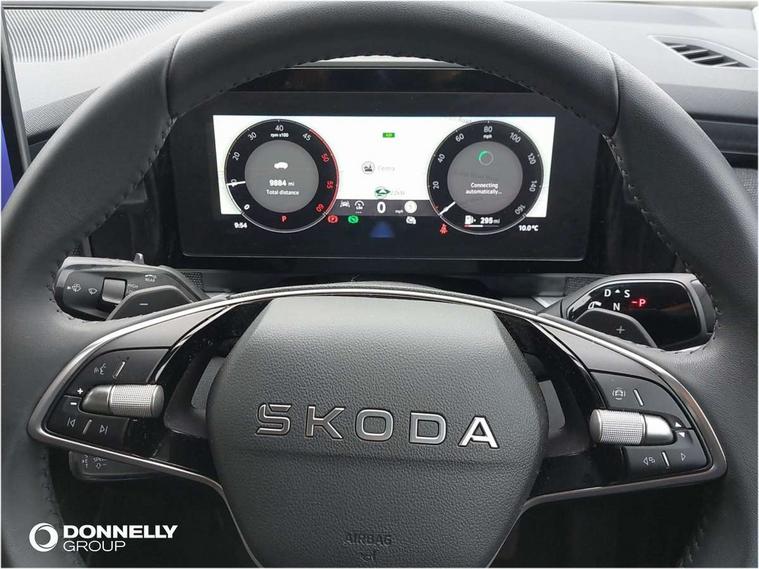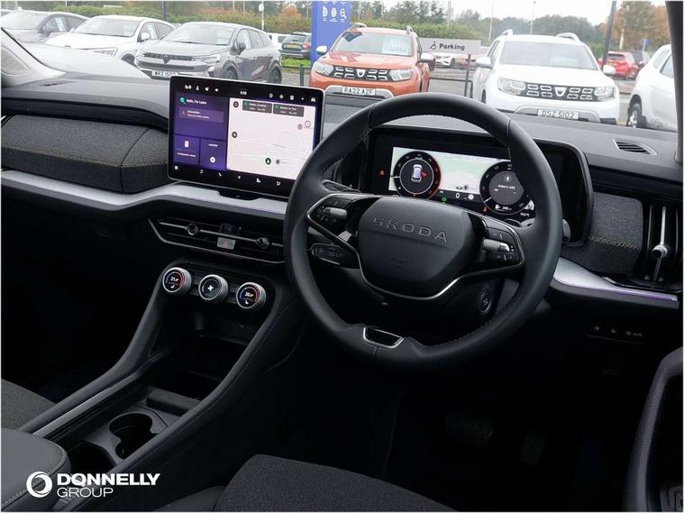 13" satellite navigation touchscreen display, Blind spot detection with door exit warning, Bluetooth system, ChatGPT functionality, Driver alert - Fatigue and drowsiness monitor, Dry display cleaner, Emergency call, Front and rear parking sensors, Front cross traffic assist, Lane assist, PAS, Rear traffic assist, Rear view camera, Tailgate unlocking from outside, Traffic sign recognition, USB C Port x 2 in front centre console, Virtual Cockpit - 10.25" digital display, Voice control system, Wireless charging for two smartphones (15W) with cooling function, Wireless SmartLink for Apple CarPlay and Android Auto, Stop/start function, 2x USB-C in the rear, 8 Speakers, DAB Digital radio, Aero front windscreen wipers with intermittent function, All weather light, Auto dimming rear view mirror, Black wheel arch surrounds, Body colour bumpers, Body colour door mirrors and handles, Cornering light and poor weather light, Electric folding /adjustable/separted heated/folding door mirrors, auto dimming with boarding sports and memory function, Electric front and rear windows, Exterior black decorative trims, Heat insulating glass in windshield, Heated rear window, Ice scraper in fuel tank cap, Invisible tailpipe, LED daytime running lights, LED front fog lamps, LED Headlights, LED rear fog light, LED rear lights, LED third brake light in rear spoiler, Light assistant with automatic headlight control and coming home feature, Logo projection in door mirrors, Rear roof spoiler, Rear side wing doors, Rear window wiper, Safety reflectors on front and rear doors, Unique dark chrome design logo on alloy wheels, Window control switches with black trim, Windscreen wipers with rain sensor, Without engine designation, 1.5l bottle holder points in all door, 1x centre rear reading light, 2 seat bench in 3rd row, 3 configurable smart dials with 32mm coloured display, 3 seat bench in 2nd row, 4 foldable roof handles with rear coat hooks, Ambient interior lighting - Dashboard, front-door stowage compartments, front and rear door panels and footwell lighting, Automatic gear selector on steering column, Chrome interior door handles, Driver/front passenger reading lights, Fabric headlining, Fixed bench 40:60:40 split folding backrests, Front and rear floor mats, Front centre armrest with jumbo box storage compartment, cup holder and 12V socket, Height adjustable front headrests, Isofix child seat fittings in outer middle row rear seats and front passenger with top tether, Manual height adjustment for front passenger seats and thigh support extender, Manual lumbar support for front passenger seat, Manually adjustable steering column, Pollen filter, Rear centre armrest with cupholders, Rear seat boot backrest release, Single front passenger seat, Skoda lettering on steering wheel, Storage pocket including mobile phone pockets on the backs of the front seats, Sunvisors with illuminated vanity mirrors, Three rear height adjustable headrests, Ticket holder on A Pillar, Tri zone climate control, Umbrella in door panel x1 made from sustainable materials, Upper and lower glovebox with card holder and coin compartment, USB C port by rear view mirror for charging only (15W), Variable boot floor, Auto door release and activation of warning lights in the event of an accident, Driver and front passenger airbag with knee airbag and front passenger airbag deactivation, Electric child locks, Electronic parking brake, ESC (incl. ABS+EMD+MSR+ASR+EDL+HBA+DSR+RBS+ESBS+MCB+TSA+XDS), Front assist with braking reaction to vehicles, pedestrians and cyclists, Front disc brakes, Fuel cut off safety device, Height adjustable front 3 point seatbelts + pretensioners, Hill hold assist, Junction assist with automatic emergency braking, Rear disc brakes, Safety vest holder in door, Seat belt reminder for all seats, Three point rear seat belts, Two tone horn, Tyre pressure monitor, Alarm with interior monitoring and tilt sensor with safe function, Anti-theft wheel bolts, Immobiliser, Remote central locking with 2 keys, Breakdown kit, Tool kit,