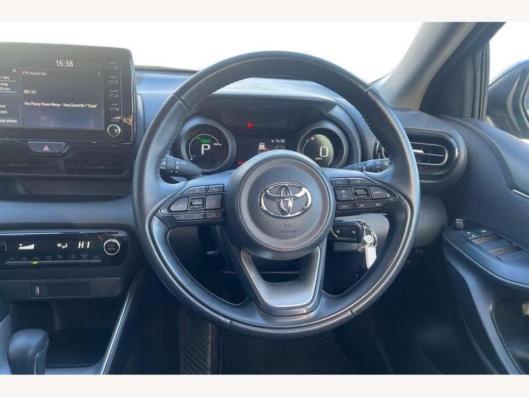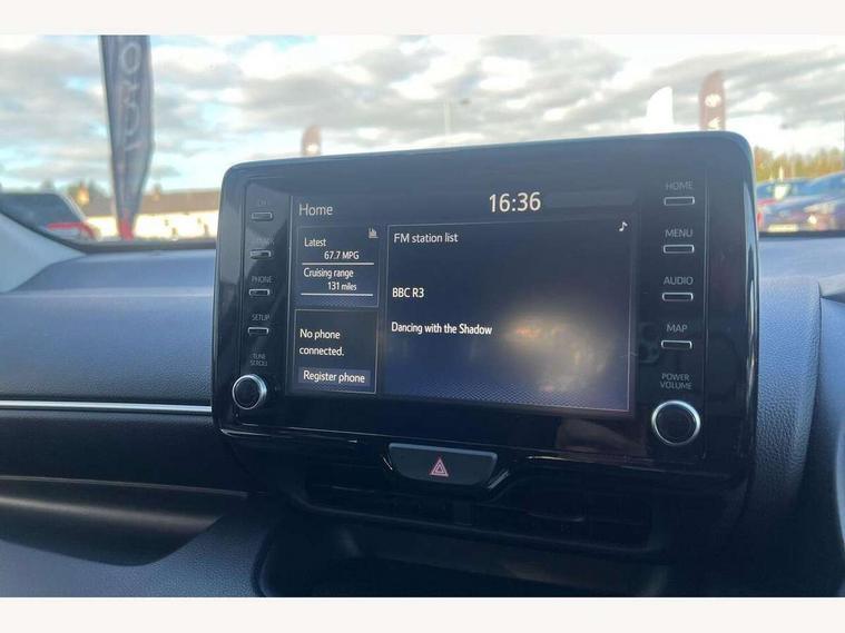 Adaptive cruise control, Adjustable speed limit with speed warning, Bluetooth connectivity, Colour binocular inspired displays with digital speedometer, E-call, Electric power steering, Hybrid energy display, Multi information display switches on steering wheel, Reversing camera, Smartphone integration with Apple CarPlay and Android auto, Tailgate, Voice recognition, Vehicle Stability Control (VSC), 4 speakers, 8" Multimedia display touch screen, USB connection, Acoustic windscreen glass, Auto windscreen wipers, Automatic headlights, Body coloured door mirrors, Electric adjustable heated door mirrors, Follow me home headlights, Front auto power windows with anti jam protection, Full LED rear lights, LED daytime running lights, LED front fog lights, LED front light guide, LED Headlights, LED High mounted stop lamp, LED Indicators, LED rear light guide, Manual headlight levelling, Painted chequered front grille, Rain sensor, Rear auto power windows with anti jam protection, Rear privacy glass, Rear side wing doors, Rear spoiler, Rear wiper, Shark fin antenna, Turning signal integrated indicators in door mirrors, Variable front intermittent wipers, 3 adjustable rear headrests, 3 spoke leather steering wheel, 60/40 split folding rear seat, Active headrests, Adjustable boot height, Auto air conditioning, Coat hooks in rear grab handles, Cup holders (2 front & door), Data Communication Module (DCM) connected services, Fabric upholstery, Front armrest, Glovebox, Grey roof lining, Height adjustable driver's seat, Isofix seat fixing, Leather gearshift, Pollen filter, Shopping bag hooks, Single front passenger seat, Tilt/telescopic steering column, 3 point seatbelts on all rear seats, ABS+EBD+Brake assist, Electronic parking brake, Emergency brake light system (EBS), Front passenger airbag on/off switch, Front seatbelt reminder, Hill start assist control (HAC), Rear child proof door locks, Rear seat belt reminder, Supplemental Restraint System (SRS) 8 airbags: Driver & passenger's airbags, dual side curtain airbags, side impact airbags, front centre airbag, Toyota Safety Sense 2, Precollison + Night time Pedestrian & Cyclist Detection, Lane Trace Assist, Auto High Beam, Intelligent ACC & Road Sign Assist, Tyre pressure warning system, 2x Master key, Alarm/immobiliser, Remote powered central double locking doors, Soft touch instrument panel, Space saver spare wheel,