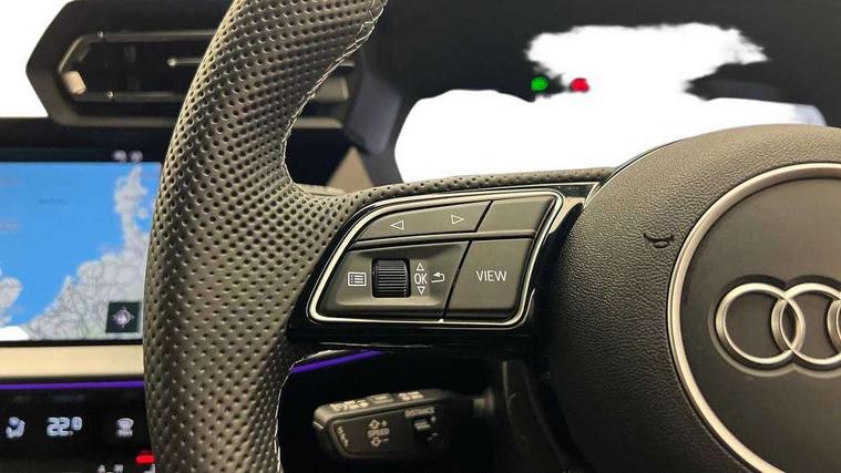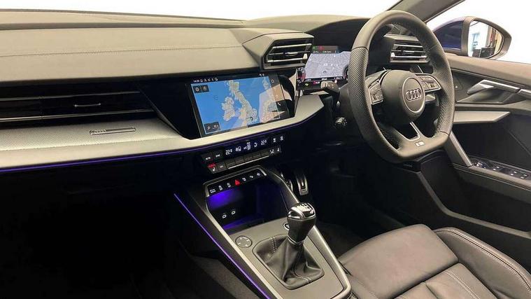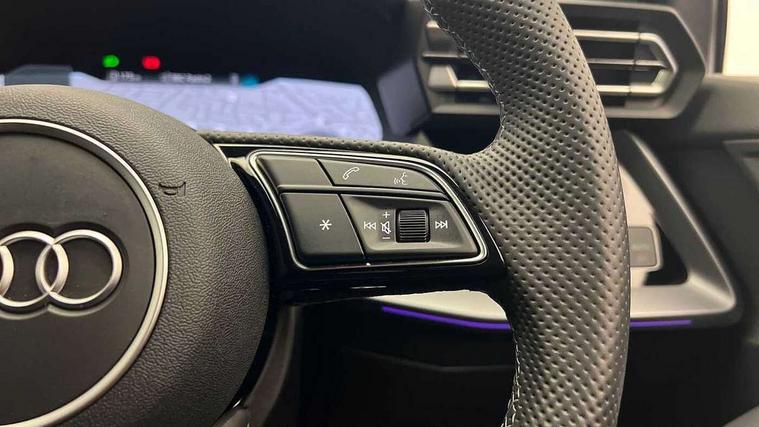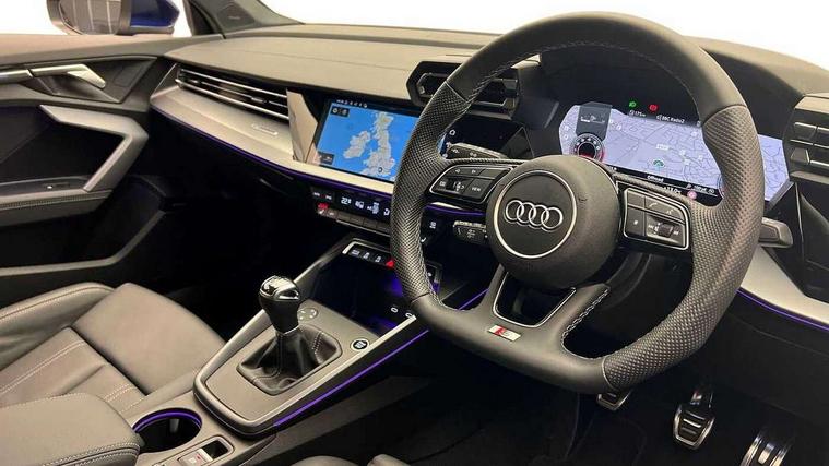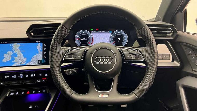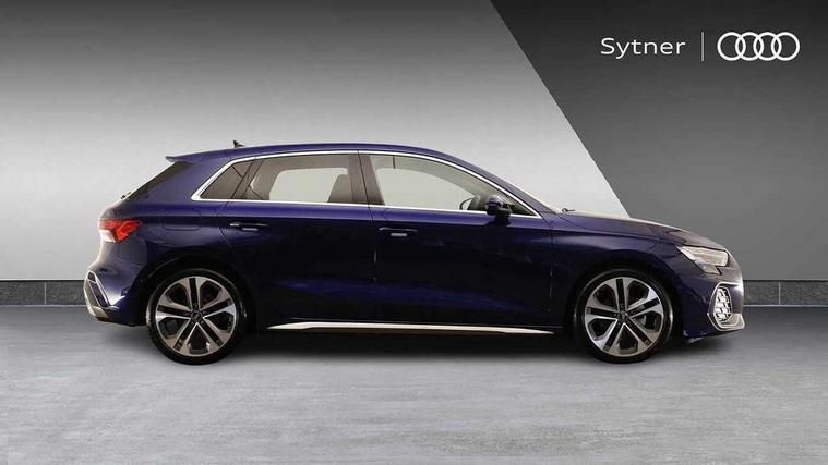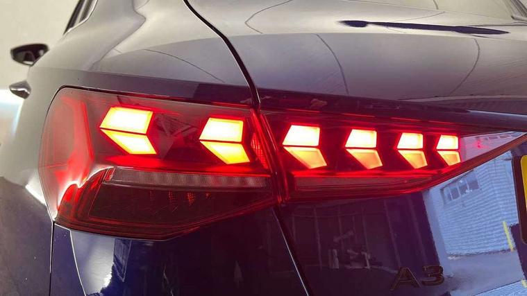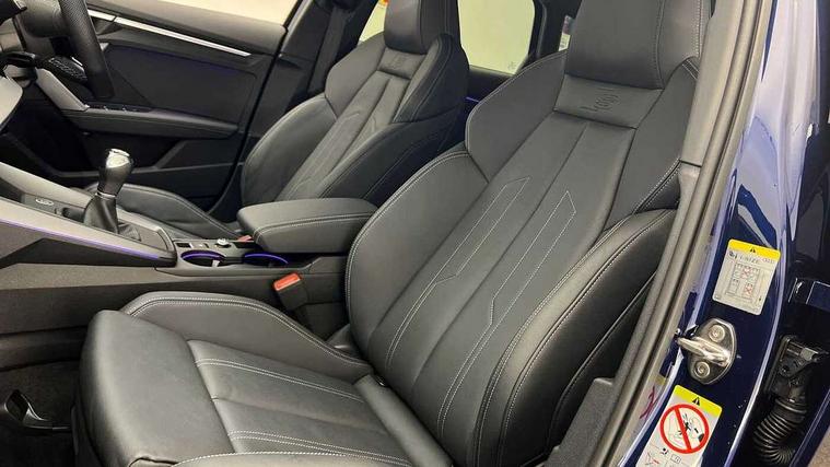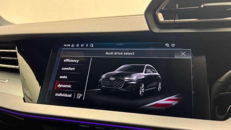 Adjustable speed limiter, Audi drive select, Audi smartphone interface with app store includes wireless Apple carplay, Android auto and Amazon alexa integration, Audi virtual cockpit plus - 12.3" full HD resolution dynamic digital instrument cluster, Automatic start/stop system with recuperation, Bluetooth interface, Camera based traffic sign recognition, Collision avoidance assistant, Cruise control, Distraction and Fatigue warning, e-Call (emergency call), Electromechanical power speed sensitive steering, Lane departure warning system, MMI Navigation Plus with high resolution 10.1" colour touch screen display, Park Assist with parking system Plus, Service indicator, Tailgate, Trip computer, Voice control system with natural language interaction, Sports suspension, Audi Phonebox light with wireless charging, Audi sound system - 10 loudspeakers including centre loudspeaker and subwoofer, DAB Digital radio, USB ports with charging function in the rear, Acoustic glass windscreen, Aluminium window trim, Auto dimming frameless rear view mirror, Body colour exterior mirrors, Chrome exhaust tailpipes, Electrically adjustable/heated/folding/auto dimming door mirrors with integrated LED indications + kerb view function for passenger side, Exterior model badging, Front and rear side air inlets in grained matt black with dark liquid chrome frame, Front electric windows, Front radiator grill in high gloss dark chrome, Heat insulating glass windscreen, Illuminated door sills with aluminium inserts at the front with S logo, LED 3rd brake light, LED daytime running lights, LED headlights with LED rear lights and dynamic rear indicators, Light and rain sensors, Privacy glass - dark tinted rear window, rear door and side windows, Rear diffuser and grill in grained matt black with inlay in dark liquid chrome, Rear electric windows, Rear side wing doors, Rear wiper, S line bumpers, S roof spoiler, Side S line emblems on front wings, Side sill trim in dark liquid chrome, 12V socket and storage compartment in front centre console, 3 seat bench in 2nd row, 3 spoke flat bottomed multi-function leather sport steering wheel, 3-zone deluxe automatic air conditioning, 4 way electrically adjustable lumbar support for driver and front passenger, 40/20/40 split folding rear seat bench, Black cloth headlining, Front and rear centre armrest in artificial leather, Front and rear headrests, Front/rear floor mats, Heated front seats, Height and reach adjustable steering wheel, Manual boot compartment lid, Manually adjustable front seats, Rear cup holders, S badging on the steering wheel, Seat side bolsters, Single front passenger seat, Stainless steel pedals and front footrest in black, Twin leather upholstery with front sports seats S embossed logo, Aluminium interior elements pack - A3 Sportback, Multi-coloured LED interior lighting package - A3, 3x3 point rear seat belts, Driver and front passenger airbag with passenger airbag deactivation, Electronic Stabilisation Control (ESC) including ABS, ASR and EDL, First aid kit with warning triangle and 2 safety vests, Front side airbags with head airbags and interaction airbag, Hill hold assist, Pre-sense front with pedestrian and cyclist detection, Seatbelt monitoring, Tyre pressure loss indicator, Anti theft alarm, Anti-theft wheel bolts, Electronically operated child locks, Immobiliser, Remote central locking with safelock, Dash & door Inlay in dark aluminium Spectrum,