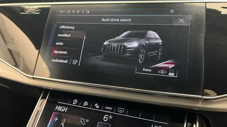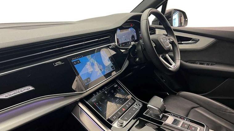 Audi connect safety and service (e-call), Audi connect with Amazon Alexa Integration, Audi drive select (Auto, Comfort, Dynamic, Efficiency, Individual, Off-road and All road), Bluetooth interface, Camera based traffic sign recognition, Electromechanical steering, MMI navigation plus with MMI touch screens includes 10.1" and 8.6" screens with haptic feedback, Natural voice recognition, Parking system plus with 360 degree display (front, rear and side sensors) - acoustic and visual park assist system, Power operated tailgate, Rear view camera, Smartphone interface includes wireless Apple carplay/Android Auto, Start/stop system, 48V Mild hybrid technology, 85 litre fuel tank, Adaptive air suspension, Quattro all wheel drive with self locking centre differential, Audi music interface - front 2 USB-C ports with charger and data functions, Audi sound system with 6 channel amplifier, 180 watt amplifying capacity and 10 loudspeakers including subwoofer, DAB digital radio module, 3rd brake light, Aluminium roof rails, Aluminium window trim, Audi matrix LED headlights with dynamic front and rear indicators, Auto dimming frameless rear view mirror, Body coloured door mirrors, Electrically adj heated/folding + automatically dimming exterior mirrors with memory + automatic kerb side function for passenger side exterior mirror, Heat insulating glass in windshield, Integrated LED indications in door mirrors, LED daytime running lights, LED rear tail lights, Privacy glass - dark tinted rear and rear side windows from B-pillar backwards, Rear side wing doors, Rear wiper, S Line badge on wings, S line bumpers in full body colour paint finish, S line roof spoiler, S line styling side ventilation grilles and side skirts, 2 seat bench in 3rd row, 2 zone automatic climate control, 3 seat bench in 2nd row, 7 seat layout with ISOFIX points for the front passenger seat and rear passenger seat, Black cloth headlining, Comfort front centre armrest, Electric adjustable front seat with 4 way lumbar support, driver memory functionality, Folding rear seats, Front head restraints, Front/rear floor mats, Heated front seats, Illuminated door sill trims with S logo, LED interior ambient lighting, Luggage compartment cover, Luggage compartment sill protection in stainless steel, Rear head restraints, Single front passenger seat, Stainless steel pedals, Sunvisors with illuminated vanity mirrors, 3 point seatbelts on all rear seats, Audi pre sense front, Child locks on rear doors, Driver and front passenger, front side and curtain airbags, Electromechanical parking brake, Electronic Stabilisation Control (ESC) including ABS, ASR and EDL, Extended pedestrian protection measures, Hill hold assist, Seatbelt monitoring, Tyre pressure loss indicator, Warning triangle and first aid kit, Anti theft alarm, Anti-theft wheel bolts and wheel loosening detection, Keyless Go, Remote central locking, Darkened matt brushed aluminium inlays, Tool kit, Tyre repair kit,