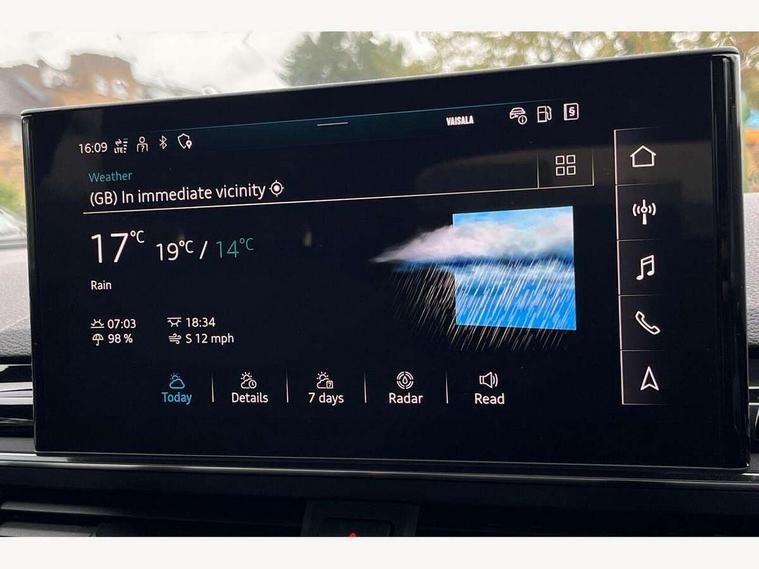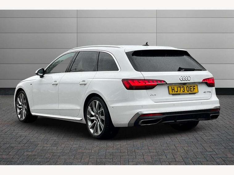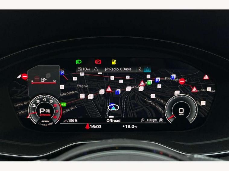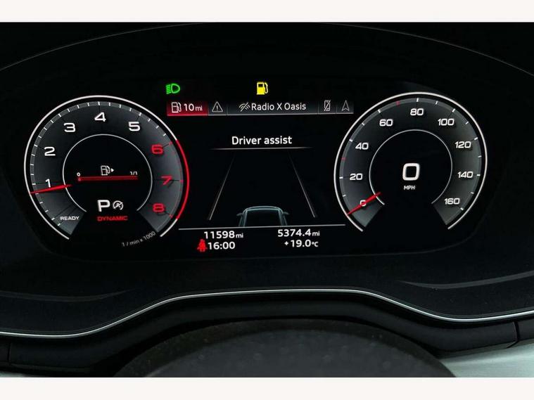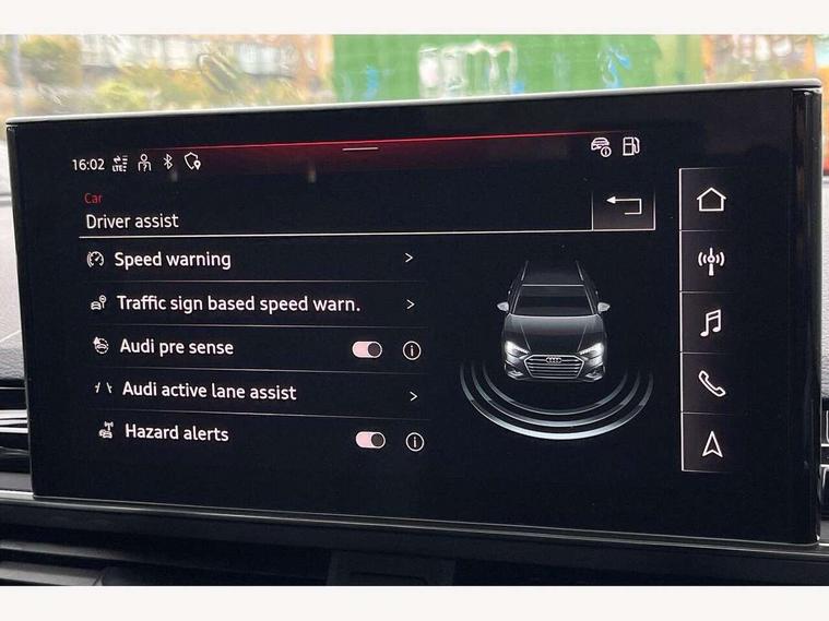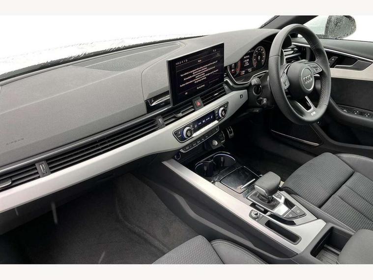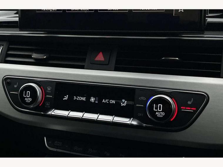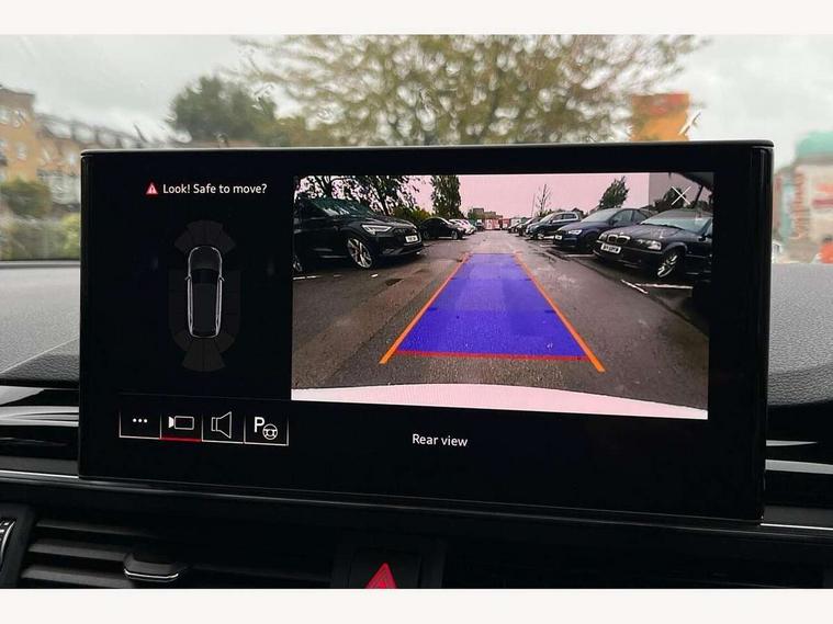 Audi connect safety and service (e-call), Audi drive select, Audi smartphone interface, Audi virtual cockpit, Automatic start-stop system with coasting functionality and efficiency programme, Bluetooth interface, Camera based traffic sign recognition, Electromechanical power steering, Email, calendar and text messages displayed via MMI, Front and rear parking sensors, Lane departure warning, MMI Navigation plus with MMI touch includes 10.1" high resolution colour MMI display, 3D map, Power operated tailgate, Rear view camera, Voice control system, 54 litre fuel tank, Sports suspension lowered by 23mm, 2 USB charging ports, 8 passive loudspeakers, DAB digital radio reception, Aluminium roof rails, Auto dimming rear view mirror, Body colour door handles, Body colour front spoiler lip, Body colour side sill trim, Body coloured door mirrors, Electric adjustable/heated/folding door mirrors with auto dimming, Grained matt black side air inlets with matt aluminium silver inlay, High beam assistant, Honeycomb structure radiator grille in grained matt black, LED headlights with LED rear lights + dynamic rear indicators + headlight adjustment and high beam, turning light + LED daytime running lights, LED third brake light, Matt aluminium silver tailpipe trim, Privacy glass, Rain and light sensors, Rear side wing doors, Rear wiper, S Line badges on the front wings, S line front and rear bumpers with side skirts, S Line rear diffuser in matt anthracite black with trim strip in matt aluminium silver, S Line roof edge spoiler, Variable intermittent front wash/wipe, Windscreen with acoustic glazing, 3 spoke high multi-function sports leather steering wheel grips in perforated leather with S badging including paddle shift, 4 way electric lumbar support for driver and front passenger, 40/20/40 split folding 3 rear seat bench in 3 parts with rear centre armrest, Black carpets, Black cloth headlining, Black perforated leather gearknob, Contrast stitching on seats, steering wheel and gear lever gaiter, Deluxe 3 zone electronic climate control, Electric load area cover, Front and rear head restraints, Front centre armrest, Heated front seats, Illuminated door sill trims with S logo, ISOFIX child seat mounting and top tether, Manual seat adjustment, Single front passenger seat, Stainless steel pedals and foot rest, High gloss package - A4, LED Interior light pack - A4/S4, 3 rear seatbelts, 6 airbags - Driver, front passenger, curtain and side windows, Attention and drowsiness assist, Electronic Stabilisation Control (ESC) including ABS, ASR and EDL, Hill hold assist, Multi collision brake assist, Pop-up bonnet for pedestrian protection, Pre sense city, Rear door child safety locks, Seatbelt monitoring, Warning triangle and first aid kit, Anti theft alarm, Anti theft wheel bolts, Central locking, Keyless Go, Matt brushed aluminium inlays, Tool kit, Tyre repair kit,