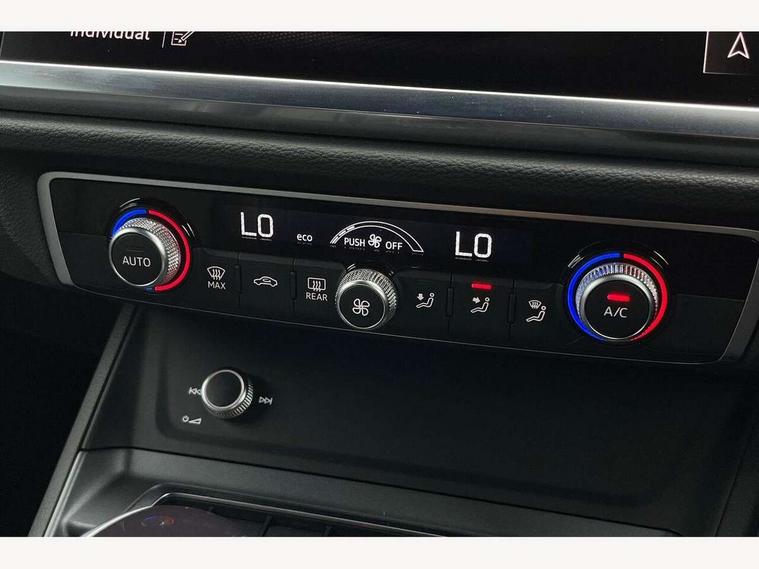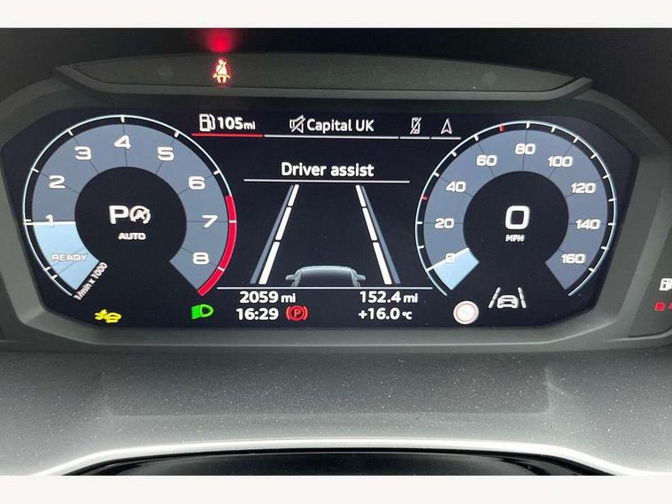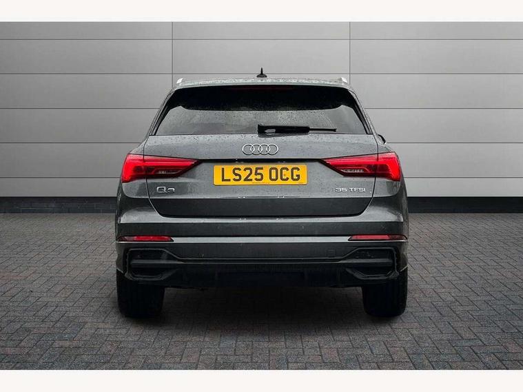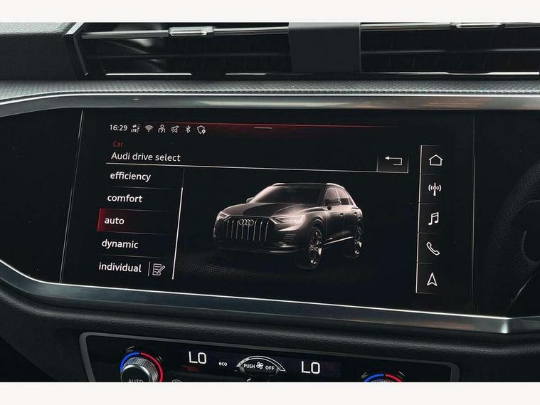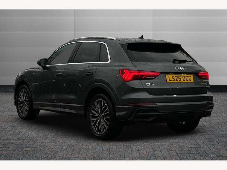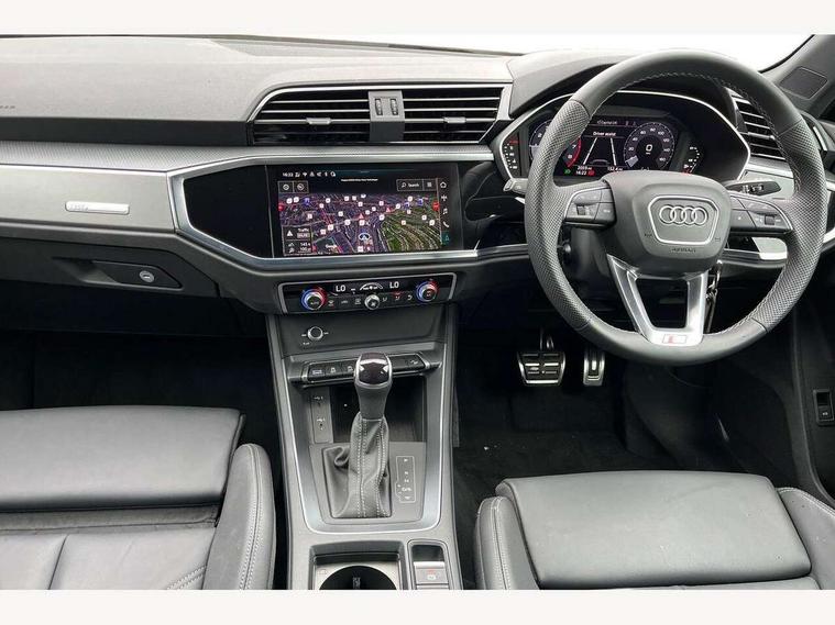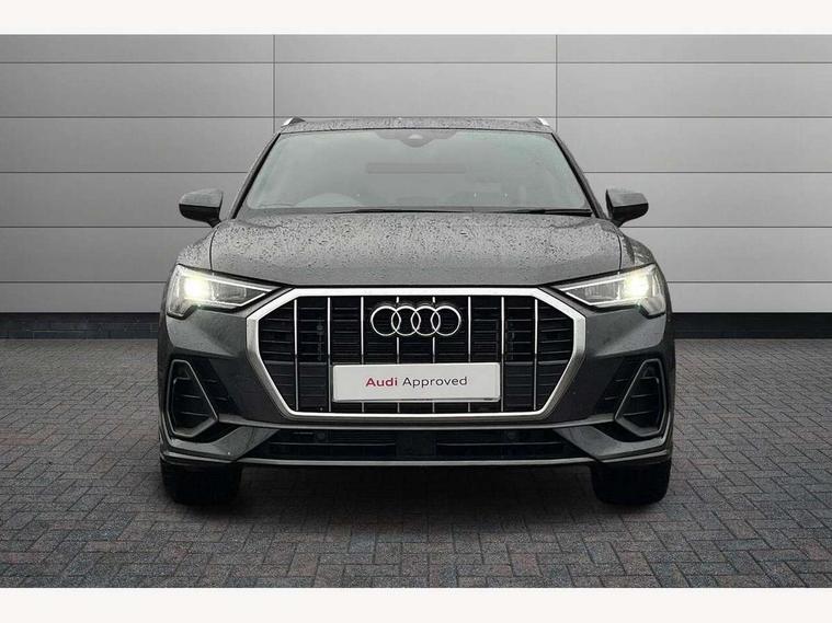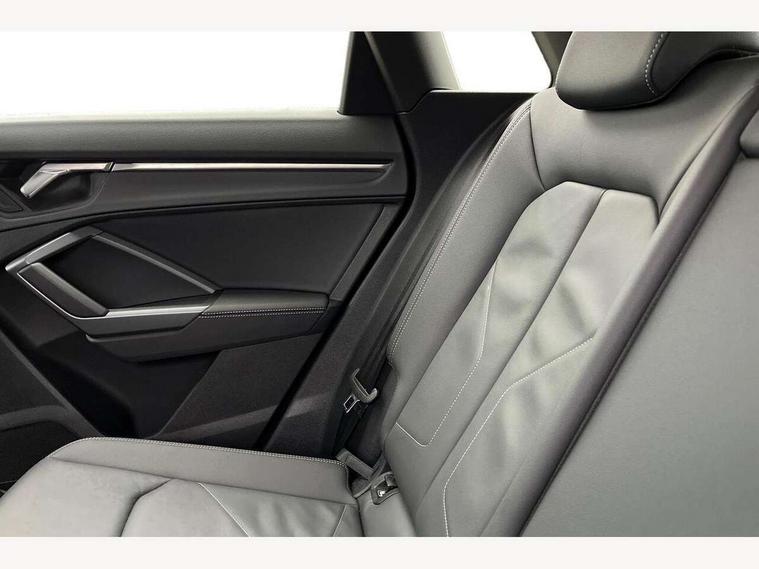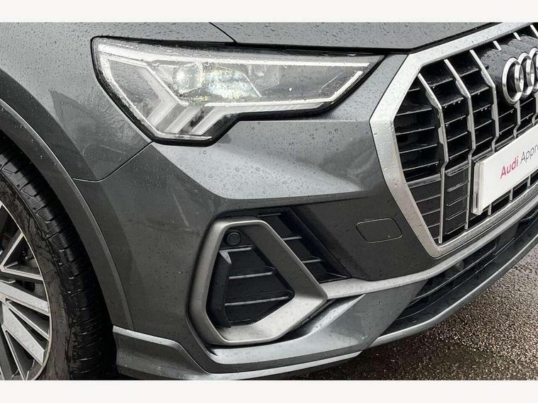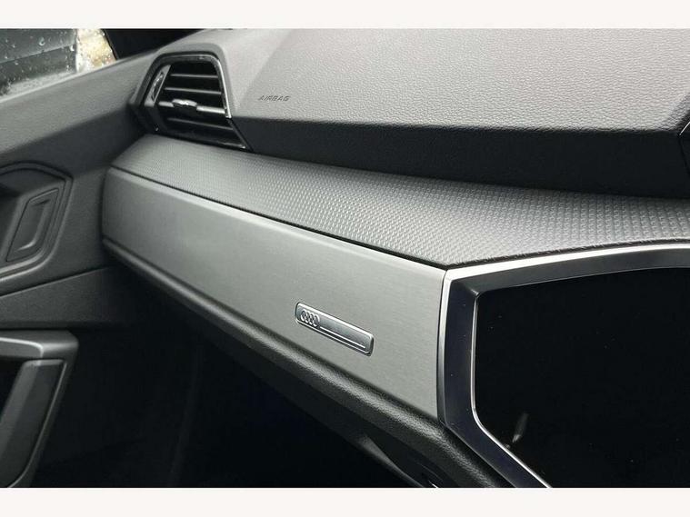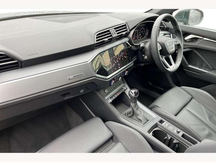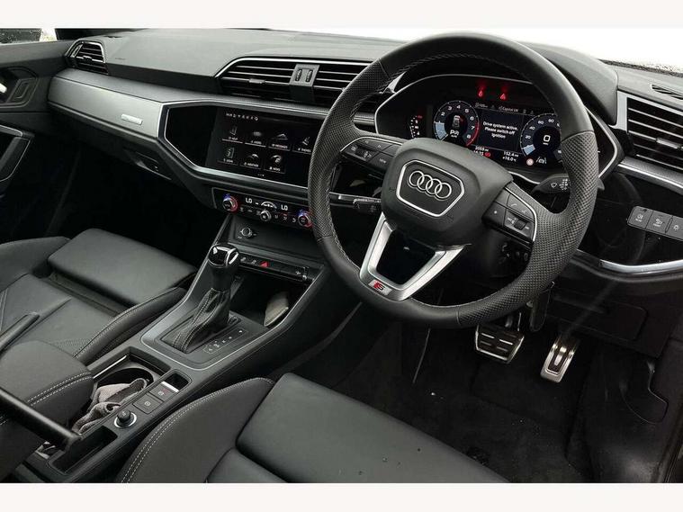 Amazon alexa Integration, Audi connect safety and service, Audi drive select, Audi lane departure warning, Audi Virtual Cockpit - 10.25" display, Bluetooth interface, Camera based traffic sign recognition, Distraction and Fatigue warning, Legal emergency call, MMI Navigation Plus with high resolution 10.1 inch touchscreen colour display, Power operated tailgate, Progressive steering, Service interval indicator, Smartphone interface includes wireless Apple carplay/Android Auto, Start stop system with recuperation, Voice control system with natural language interaction, Sports suspension, 2 USB-C ports with charge and data functions, 6 passive loudspeakers, DAB digital radio module, Acoustic windscreen, Aluminium roof rails, Aluminium window trim, Anthracite black radiator grille, Auto dimming door mirrors, Auto dimming frameless rear view mirror, Body colour front spoiler blade, Electrically folding, adjustable and heated door mirrors with integrated LED side indicators and kerb view function for passenger side, Front and rear electric windows, Front fog lights, Front side air inlets in matt platinum grey, Grille vertical bars in aluminium silver/Matt, High gloss black finish B and C pillars, LED Dynamic rear indicators, LED headlights with LED daytime running lights, LED rear lights, LED third brake light, Privacy glass dark tinted rear and rear-side windows (from B-pillar backwards), Rain and light sensors, Rear diffuser grille in grained matt black, Rear diffuser strip in matt anthracite black, Rear side wing doors, Rear wiper, S line badges on front wings, S line front and rear bumpers and side skirts in contrasting Manhattan grey paint finish, Side skirt insert in matt Platinium grey, Variable front intermittent wipers, 12V socket in rear centre console, 3 seat bench in 2nd row, 3 spoke leather multifunction steering wheel features S badging and grips in perforated leather with contrast stitching, 40:20:40 folding with manual adjustment for 60:40 forwards/backwards position and backrest angle, Adjustable rear seat bench/backrest with centre armrest and cupholder, Black cloth headlining, Dual zone electronic climate control, Electric lumbar support, Front and rear black floor mats with contrast stitching in rock grey, Front and rear headrests, Front centre armrest, Height and reach adjustable steering wheel, Illuminated door sill trims with S logo, ISOFIX child seat mounting for front passenger with airbag deactivation and outer rear seat including top tether attachment point for outer rear seats, Manual front seats with height adjustment, Perforated leather gearknob, Single front passenger seat, Stainless steel luggage compartment sill finisher, Stainless steel pedals, Twin leather upholstery with front sport seats + S embossing, Non smoking pack - Q3, 3x3 point rear seatbelts, 6 airbags - Driver, front passenger, curtain and side windows, Audi pre-sense front with pedestrain and cyclist recognition, Electrically operated child locks on rear doors, Electromechanical parking brake, Electronic stabilisation control including ABS, ASR and EDL, Front seatbelt reminder, Hill descent control, Hill hold assist, Pre sense basic, Seatbelt monitoring, Tyre pressure warning, Warning triangle and first aid kit, Anti theft wheel bolts, Immobiliser, Remote central locking, Thatcham approved category 1 anti theft alarm, Aluminium look interior elements, Dark matt brushed aluminium inlay, Detail dashboard around MMI touch colour display in glass look, black with surround in aluminium look, Leatherette door armrest,