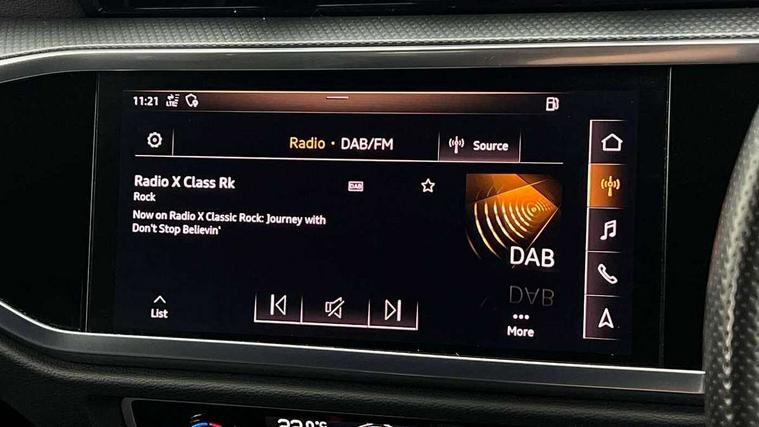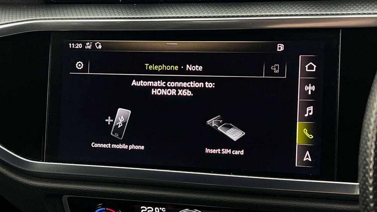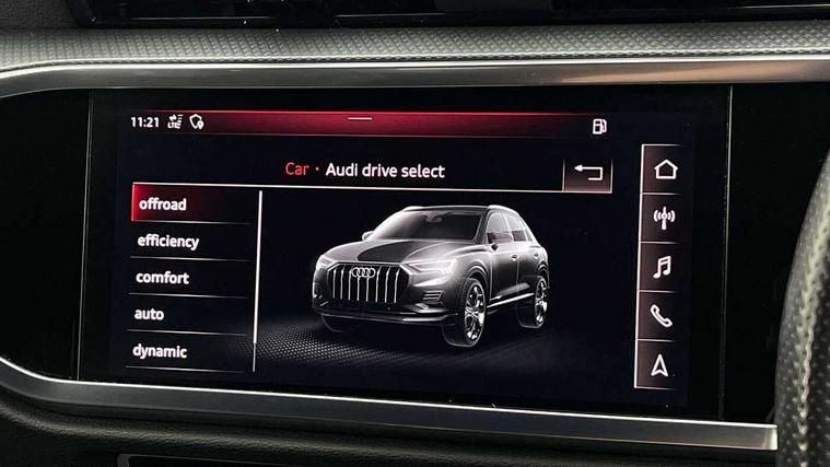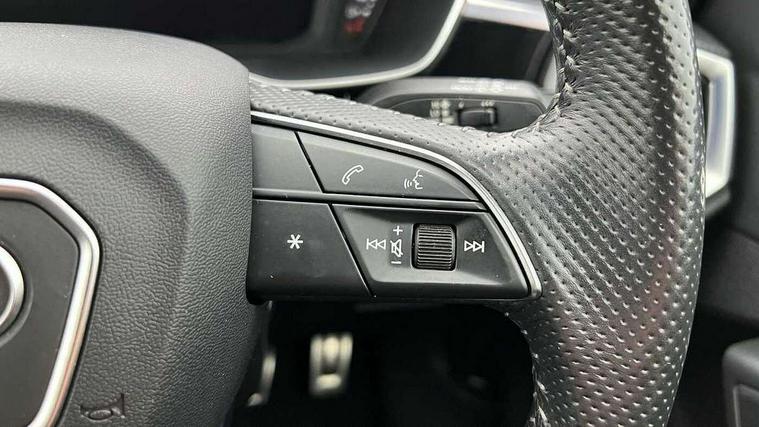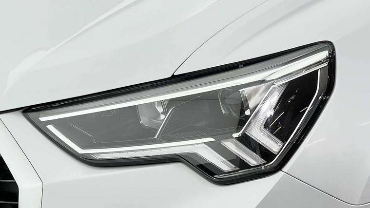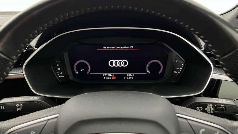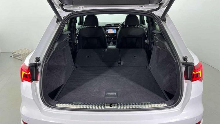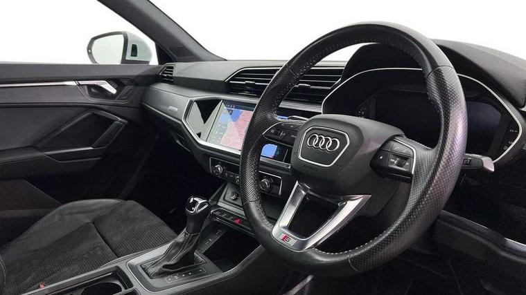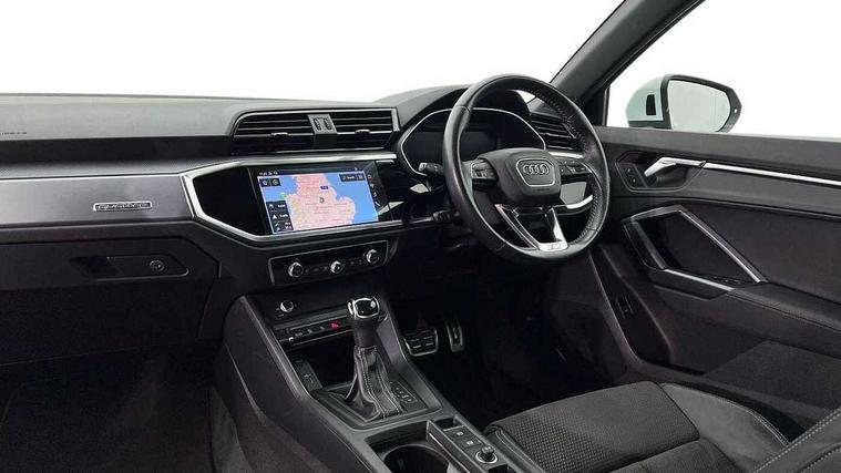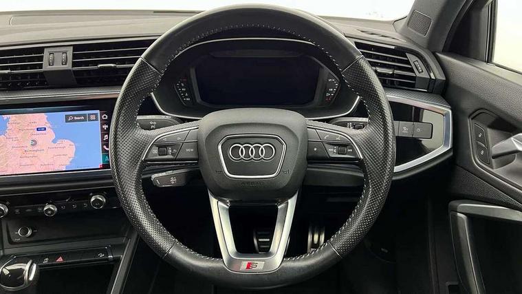 Audi connect safety and service (e-call), Audi drive select, Audi lane departure warning, Audi side assist, Audi Virtual Cockpit - 10.25" display, Bluetooth interface, Camera based traffic sign recognition, MMI Navigation Plus with high resolution 10.1 inch touchscreen colour display, Power operated tailgate, Progressive steering, Service interval indicator, Smartphone interface includes wireless Apple carplay/Android Auto, Start stop system with recuperation, Voice control system with natural language interaction, Sports suspension, 1 x USB type C and 1 USB type A charging points, 6 passive loudspeakers, DAB digital radio module, Acoustic windscreen, Aluminium roof rails, Aluminium window trim, Auto dimming frameless rear view mirror, Body coloured bumpers, Electrically folding, adjustable and heated door mirrors with integrated LED side indicators and kerb view function for passenger side, Front and rear electric windows, Front fog lights, Front side air inlets in matt platinum grey, Front spoiler blade in matt platinum grey, Grille vertical bars in aluminium silver/Matt, High gloss black finish B and C pillars, LED headlights with LED daytime running lights and dynamic rear indicator, LED rear lights, Privacy glass dark tinted rear and rear-side windows (from B-pillar backwards), Rain and light sensors, Rear diffuser strip in matt titanium black, S line badges on front wings, S Line front and rear bumpers, Side skirt insert in matt Platinium grey, Silver chrome grille surround, Titanium black radiator grille, 12V socket in rear centre console, 40:20:40 folding with manual adjustment for 60:40 forwards/backwards position and backrest angle, Adjustable rear seat bench/backrest with centre armrest and cupholder, Black cloth headlining, Dual zone electronic climate control, Front and rear black floor mats with contrast stitching in rock grey, Front and rear headrests, Front and rear roof module including reading lights, Front centre armrest, Glove compartment lighting, Height and reach adjustable steering wheel, Illuminated door sill trims with S logo, ISOFIX child seat mounting for front passenger with airbag deactivation and outer rear seat including top tether attachment point for outer rear seats, Luggage compartment light, Manual front seats with height adjustment, Perforated leather gearknob, Stainless steel luggage compartment sill finisher, Stainless steel pedals, Non smoking pack - Q3, 3x3 point rear seatbelts, 6 airbags - Driver, front passenger, curtain and side windows, Audi pre-sense front with pedestrain and cyclist recognition, Electrically operated child locks on rear doors, Electromechanical parking brake, Electronic stabilisation control including ABS, ASR and EDL, Hill descent control, Hill hold assist, Pre sense basic, Seatbelt monitoring, Tyre pressure warning, Warning triangle and first aid kit, Anti theft alarm, Anti theft wheel bolts, Remote central locking, Dark matt brushed aluminium inlay, Detail dashboard around MMI touch colour display in glass look, black with surround in aluminium look, Leatherette door armrest,