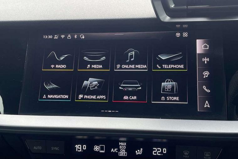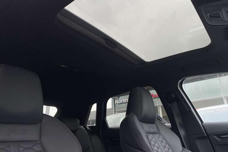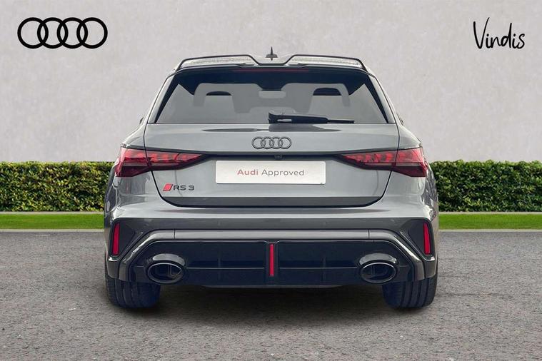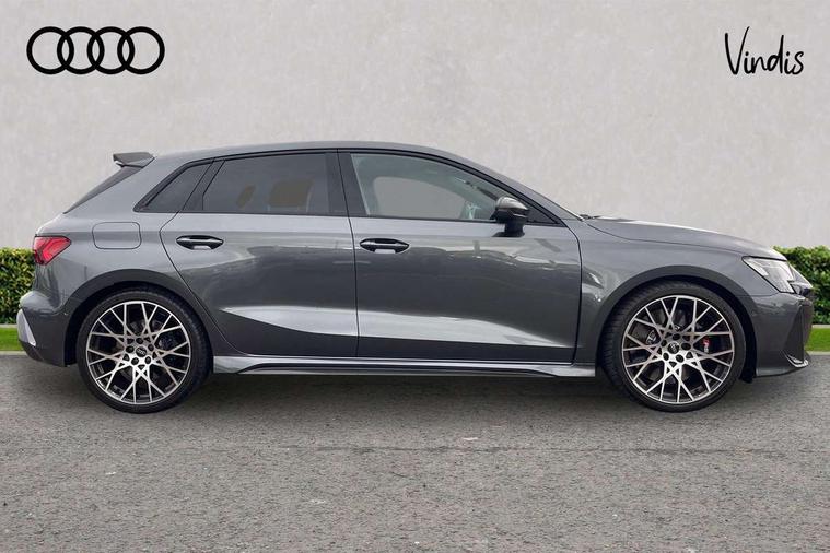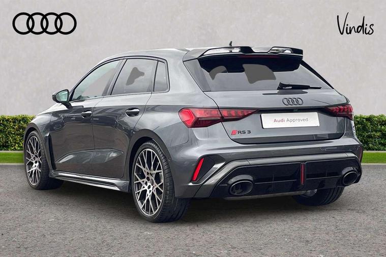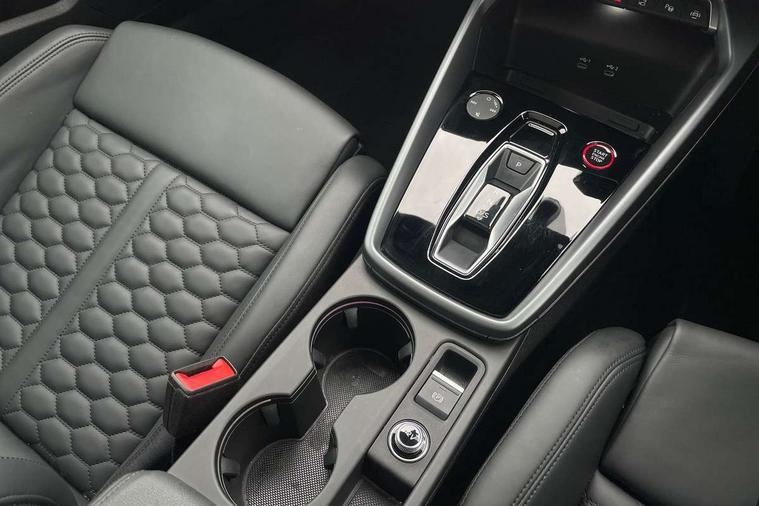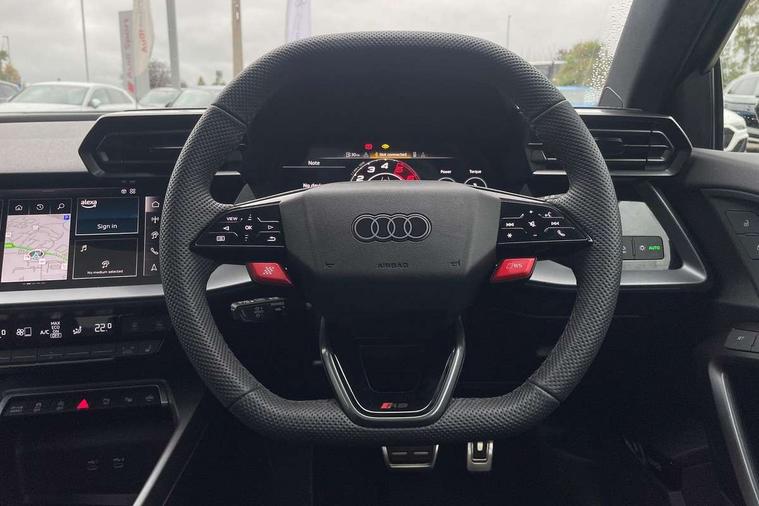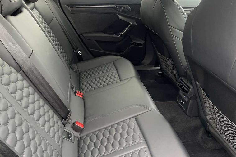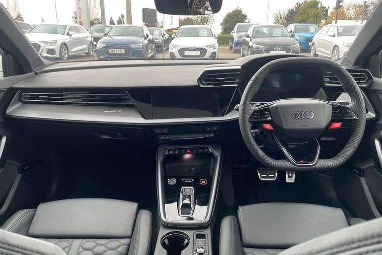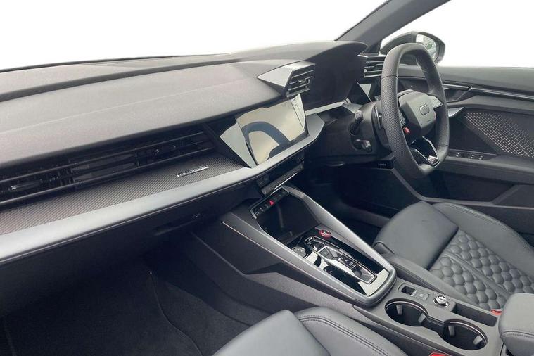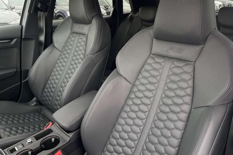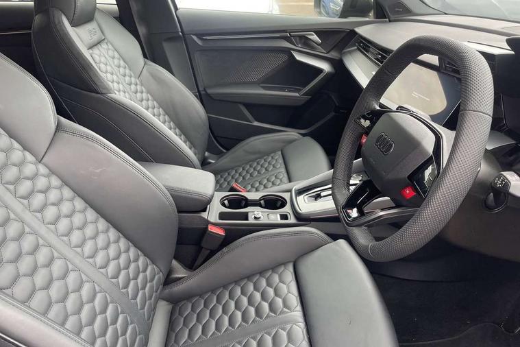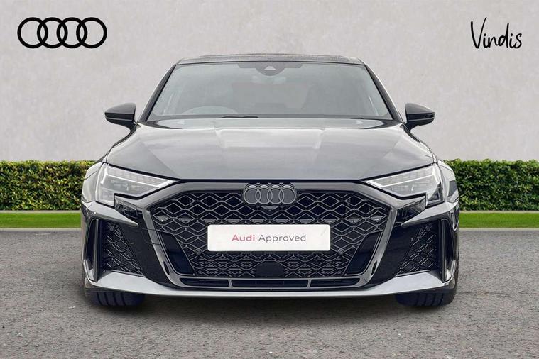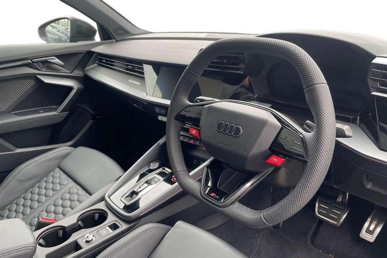 Adjustable speed limiter, Audi drive select comfort, auto, dynamic and efficiency, Audi smartphone interface with app store includes wireless Apple carplay, Android auto and Amazon alexa integration, Audi virtual cockpit plus with RS specific design and 12.3" display with additional graphic display options, Automatic start/stop system with recuperation, Bluetooth interface, Camera based traffic sign recognition, Collision avoidance assistant, Distraction and Fatigue warning, e-Call (emergency call), Lane departure warning system, MMI Navigation Plus with high resolution 10.1" colour touch screen display, Park Assist with parking system Plus, Progressive steering, RS specific driving modes - RS Individual, RS Performance and RS Torque rear, Voice control system with natural language interaction, Adaptive suspension with audi drive select, Increase of top speed to 174 mph, Quattro permanent four wheel drive, Audi Phonebox light with wireless charging, DAB Digital radio, USB ports with charging function in the rear, Audi beam LED projection of RS logo on ground as you exit, Auto dimming frameless rear view mirror, Automatic dynamic range control, Carbon door mirror housings, Carbon fibre engine cover, Dipped beam, main beam, position light and turning light, Electrically adjustable/heated/folding/auto dimming door mirrors with integrated LED indications + kerb view function for passenger side, Exterior model badging, Front electric windows, Heat insulating glass windscreen, LED 3rd brake light, LED brake lights, LED daytime running x3, LED rear number plate lights, LED reverse light, LED tail lights, Light and rain sensors, Privacy glass - dark tinted rear window, rear door and side windows, Rear electric windows, Rear side wing doors, Rear wiper, Roof edge spoiler in carbon, RS dual branch exhaust system with two chrome plated oval tailpipe trims, 12V socket and storage compartment in front centre console, 3 seat bench in 2nd row, 3 Spoke flat top and bottomed black leather multi function steering and gear shift paddles, 3-zone deluxe automatic air conditioning, 40/20/40 split folding rear seat bench, Black cloth headlining, Front and rear headrests, Front centre armrest, Front door sill trims with RS 3 logo, Front sports seats RS embossed logo, Front/rear floor mats, Heated front seats, Height and reach adjustable steering wheel, Manual boot compartment lid, Rear centre armrest with cupholder, Seat side bolsters, Single front passenger seat, Stainless steel pedals and front footrest in black, Vanadium look - Interior door handles, Door trim, power latching, Air vents, window controls, mirror adjust, rear door lock, Selector lever in centre console, Black Styling plus package - RS3, Extended ambient lighting package Pro with Multi-coloured contour lighting of instrument panel - RS3, RS exterior features pack in carbon and gloss black - RS3, RS sport suspension pack - RS3, Storage package - RS3 Sportback, 3x3 point rear seat belts, Driver and front passenger airbag with passenger airbag deactivation, Electronic Stabilisation Control (ESC) including ABS, ASR and EDL, First aid kit with warning triangle and 2 safety vests, Hill hold assist, Pre-sense front with pedestrian and cyclist detection, RS steel brakes, Seatbelt monitoring, Tyre pressure loss indicator, Anti theft alarm, Anti-theft wheel bolts, Electronically operated child locks, Inlays in carbon atlas structure, Tyre repair kit,