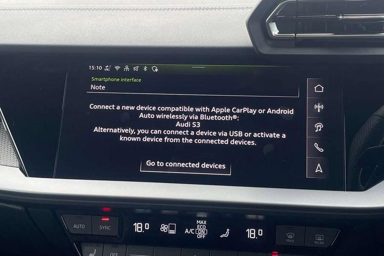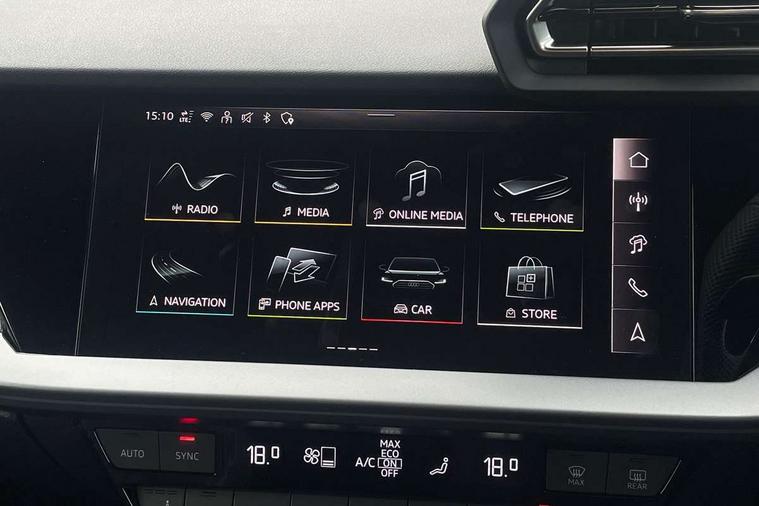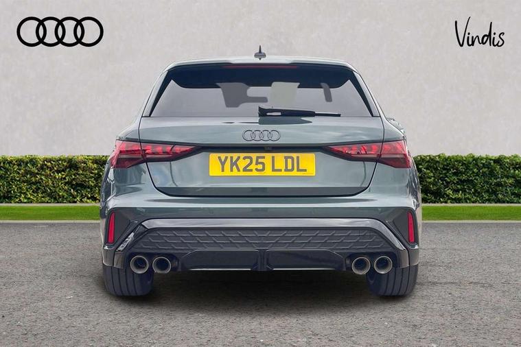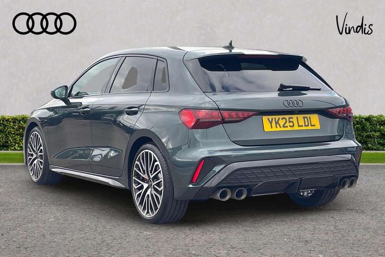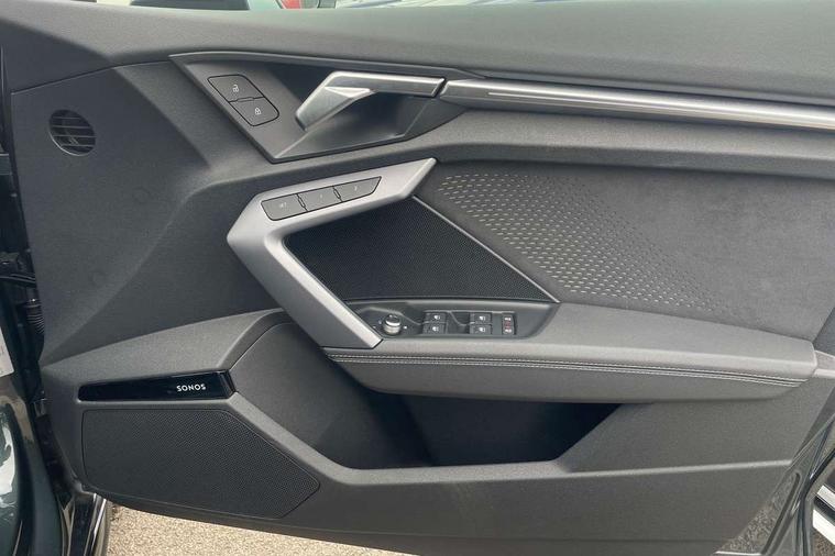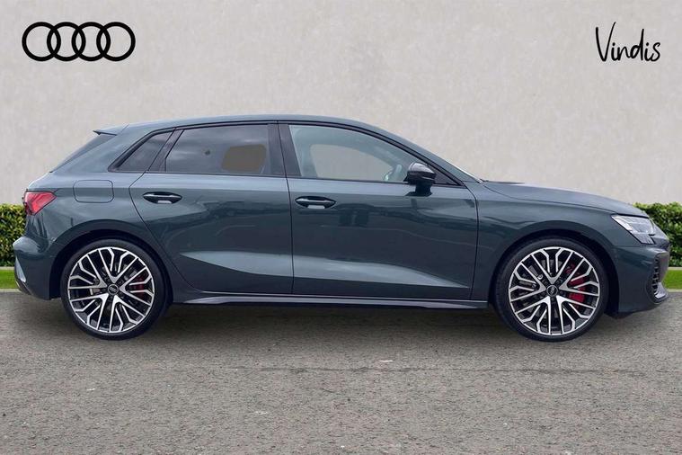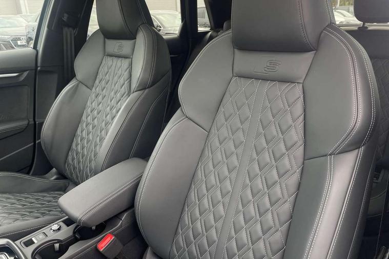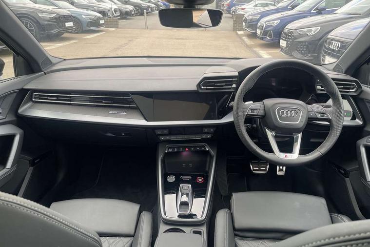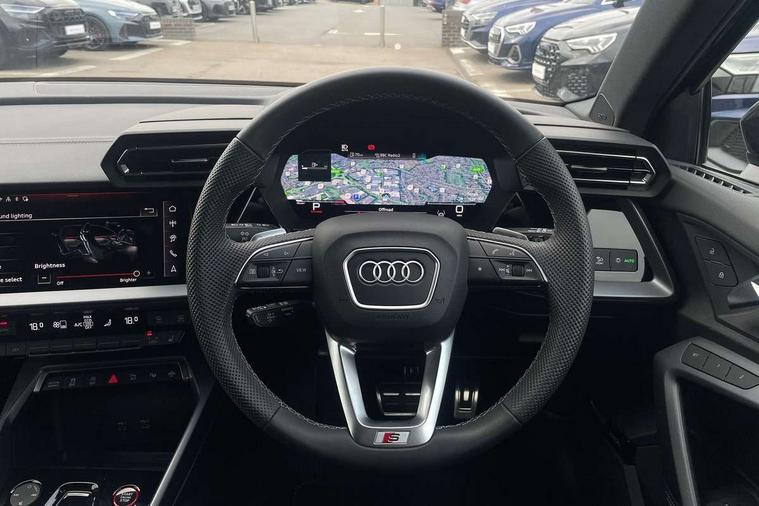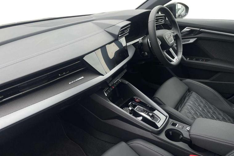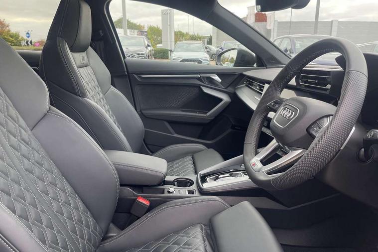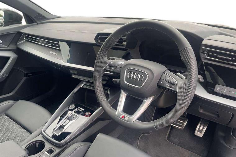 Adjustable speed limiter, Audi drive select, Audi smartphone interface with app store includes wireless Apple carplay, Android auto and Amazon alexa integration, Audi virtual cockpit plus - 12.3" full HD resolution dynamic digital instrument cluster, Automatic start/stop system with recuperation, Bluetooth interface, Camera based traffic sign recognition, Collision avoidance assistant, Distraction and Fatigue warning, e-Call (emergency call), Lane departure warning system, MMI Navigation Plus with high resolution 10.1" colour touch screen display, Park Assist with parking system Plus, Progressive steering, Service indicator, Tailgate, Trip computer, Voice control system with natural language interaction, quattro permanent all-wheel drive with torque splitter, S suspension with damper control, Audi Phonebox light with wireless charging, DAB Digital radio, USB ports with charging function in the rear, 3rd brake light, Anthracite grey Audi rings (front and rear), Audi Beam uses LEDs to project Vorsprung onto the ground as you exit your S3, Auto dimming frameless rear view mirror, Black accents front and rear bumpers including air inlets, Black accents in front grille and frame, Black accents window trims strips, Carbon door mirror housings, Electrically adjustable/heated/folding/auto dimming door mirrors with integrated LED indications + kerb view function for passenger side, Exterior model badging, Front electric windows, Headlight washers, Heat insulating glass windscreen, Illuminated door sills with aluminium inserts at the front with S logo, LED daytime running lights, Light and rain sensors, Privacy glass - dark tinted rear window, rear door and side windows, Rear electric windows, Rear side wing doors, Rear wiper, S grille, S3 front bumper with S specific air intake grilles, S3 roof spoiler, 12V socket and storage compartment in front centre console, 3 seat bench in 2nd row, 3 spoke leather multifunction steering wheel with gear shift paddles, 3-zone deluxe automatic air conditioning, 4 way electrically adjustable lumbar support for driver and front passenger, 40/20/40 split folding rear seat bench, Black cloth headlining, Fine Nappa leather upholstery with front sports seats S embossed logo, Front and rear centre armrest in artificial leather, Front and rear centre armrest in artificial leather with contrasting stitching on armrests and instrument panel, Front and rear headrests, Front/rear floor mats, Heated front seats, Height and reach adjustable steering wheel, Manual boot compartment lid, Rear cup holders, S badging on the steering wheel, Seat side bolsters, Single front passenger seat, Stainless steel pedals and front footrest in black, Aluminium interior elements pack - A3 Sportback, Extended ambient lighting package Pro - S3, Storage package - A3, Technology package pro - A3 S Tronic, 3x3 point rear seat belts, Driver and front passenger airbag with passenger airbag deactivation, Electronic Stabilisation Control (ESC) including ABS, ASR and EDL, First aid kit with warning triangle and 2 safety vests, Front side airbags with head airbags and interaction airbag, Hill hold assist, Pre-sense front with pedestrian and cyclist detection, Seatbelt monitoring, Tyre pressure loss indicator, Anti theft alarm, Anti-theft wheel bolts, Electronically operated child locks, Immobiliser, Remote central locking with safelock, Dash & door inlays in carbon atlas structure, Tyre repair kit,