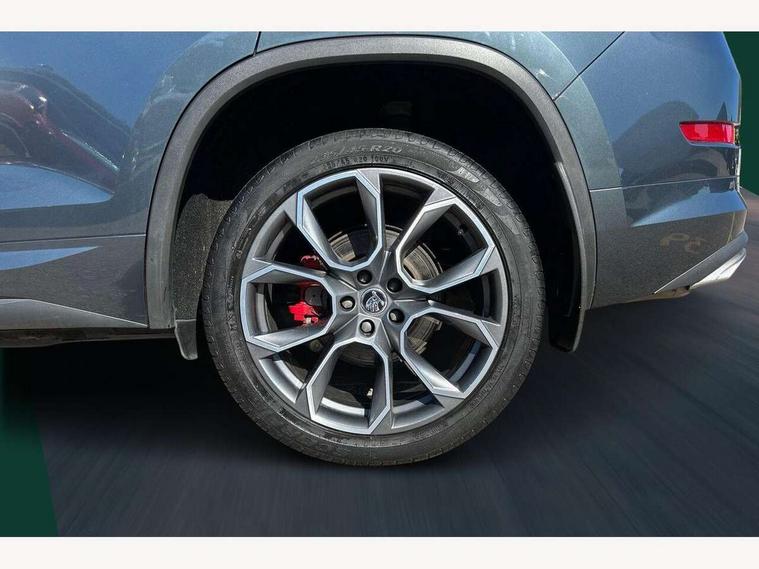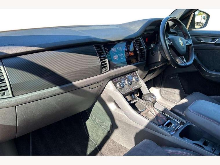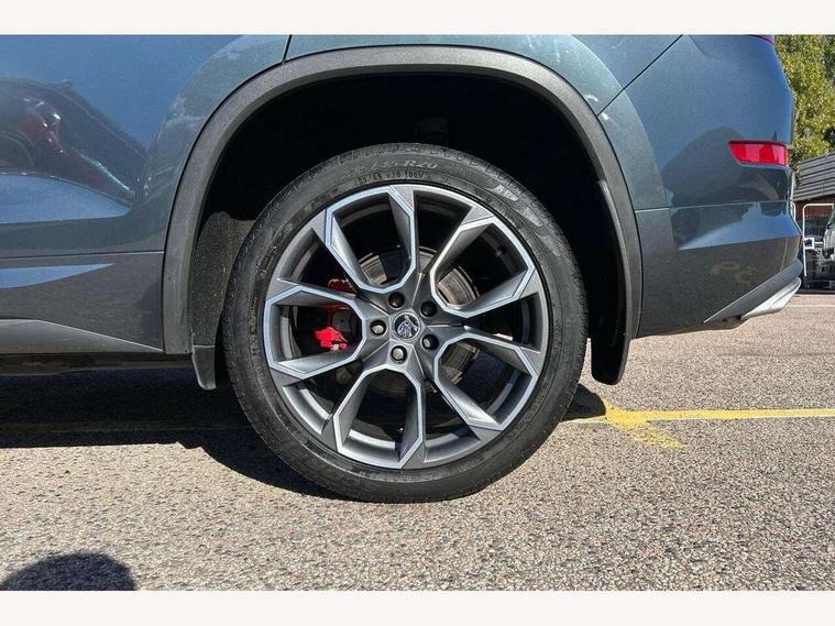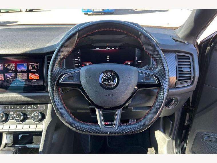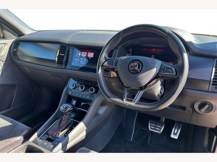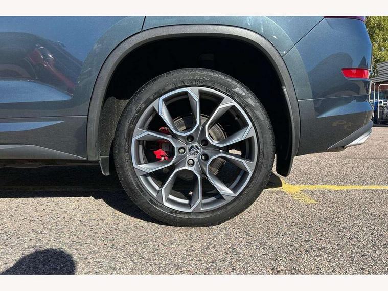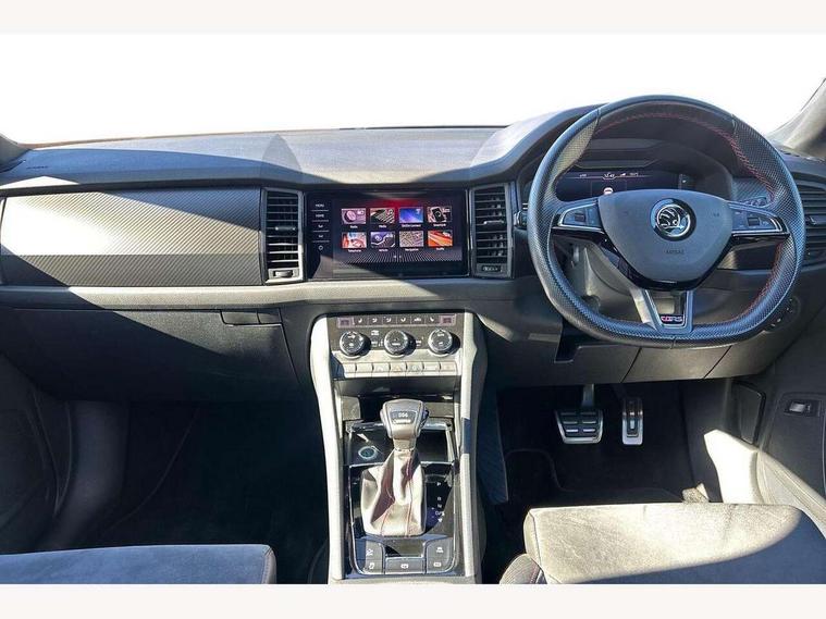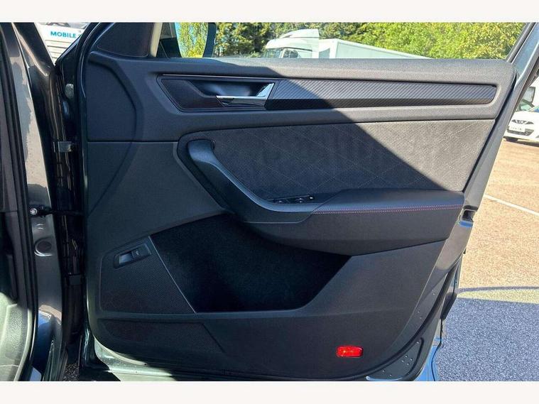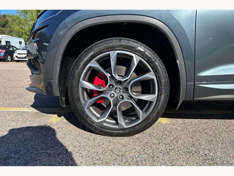 Bluetooth system, Colour multifunction trip computer, Columbus satellite navigation with 9.2" touch screen and integrated Wi-Fi + WLAN, Digital voice enhancement, Drive mode selector, ECO Stop/start function, Exterior temperature indicator, Progressive power assisted steering, SmartLink plus, Speed limiter, Sports dials, Tailgate unlocking from outside, Virtual Cockpit - 10.25" digital display, Dynamic Chassis Control including off-road function, Bolero Radio, DAB Digital radio, DVD System, Dynamic sound booster, USB and SD card connectivity, Aero front windscreen wipers with intermittent function, Aero rear window wiper, Auto dimming rear view mirror, Automatic activation of hazard warning lights, Black door mirrors, Black roof rails, Black wheel arch surrounds, Black window surrounds, Body colour door handles, Dual chrome exhaust tailpipe, Electric front and rear windows, Electrically adjustable/heated/foldable and auto dimming door mirrors with memory function, Front and Rear door steps, Full LED Headlights with adaptive front light system and LED daytime running lights, Gloss black front grille, Headlight washers, Heated rear window, High beam assist, LED front fog lights with static cornering light function, LED rear fog light, LED third brake light in rear spoiler, Light assistant (coming home/tunnel light), Rain and light sensors, Rear diffuser, Safety reflectors on front and rear doors, Sunset privacy glass, Tinted windows, vRS badging on front grille and boot lid, vRS front and rear bumpers, 12V socket in boot, 2 rails with 2 hooks including 4 hooks for net programme, 4 foldable roof handles with rear coat hooks, 4 lashing points on luggage floor, 60:40 foldable rear seat with sliding adjustment and backrest angle adjustment, Alcantara door panels, Alcantara upholstery with Sports seats, Aluminium pedals, Black roof headlining, Bottle holders in door panel in the 1.5 litre front and 1 litre rear, Cargo storage compartments, Centre console with open storage box, cup holder and 12V socket, Chrome headlight control button, Chrome interior door handles, Coat hooks on B pillar, Covered storage compartment on driver side, Door sill panels with KODIAQ logo, Front centre armrest with storage compartment, Front/rear courtesy lights, Gear shift lever with chrome frame and black gloss insert, Height adjustable front headrests, Illuminated and cooled glovebox, Illuminated luggage compartment, Isofix system on outer rear seats, LED ambient lighting, Manually adjustable steering column, Net programme in boot (1x horizontal Net, 2x vertical Nets), Overhead glasses storage compartment, Passenger side net compartment on centre console, Pollen filter, Rear centre armrest with cupholders, Removable lamp in luggage compartment, Roll up luggage compartment cover with intermediate position, Small Bags on the inner sides of the front backrests, Small pockets on the inner side of the front backrests, Storage compartment in lower middle Instrument panel, illuminated with closing, Sunvisors with illuminated vanity mirrors, Textile floor mats, Three rear height adjustable headrests, Ticket holder on A Pillar, Umbrella in door panel, Variable boot floor, vRS stitching in door panels, LED Interior Light pack - Kodiaq Scout/Sport Line/VRS/Laurin + Klement, Auto door release and activation of warning lights in the event of an accident, Driver and passenger airbags, Electronic parking brake with hill hold control, Emergency rear braking signal, ESC (incl. ABS+MSR+ASR+EDS+HBA+DSR+RBS+MKB), Front and rear three point safety belt on all seats, Front assist includes AEB city/urban, Front side airbags, Fuel cut off safety device, Head and knee airbags, Passenger airbag deactivate switch, Rear disc brakes, Red brake calipers, Safety vest holder in door, Seat belt reminder for all seats, Two tone horn, Tyre pressure monitor, Warning lights in front doors, Alarm with interior monitoring and tilt sensor with safe function, Immobiliser, Keyless entry and start system (KESSY), Remote central locking, Carbon finish dashboard and door inserts, 20" Xtreme alloy wheels with anti-theft wheel bolts, Tyre repair kit with compressor,