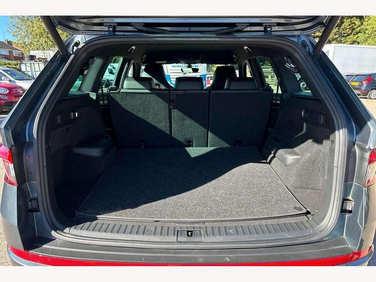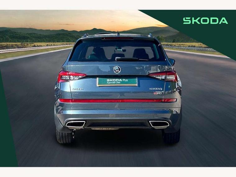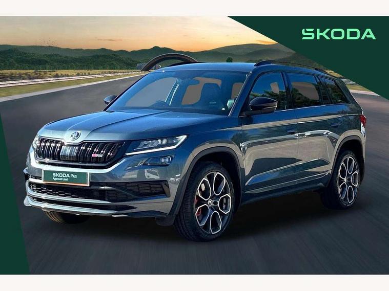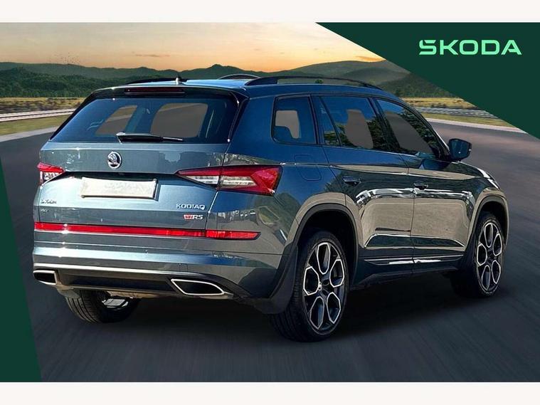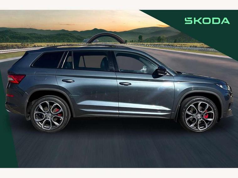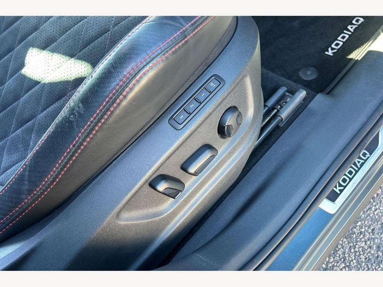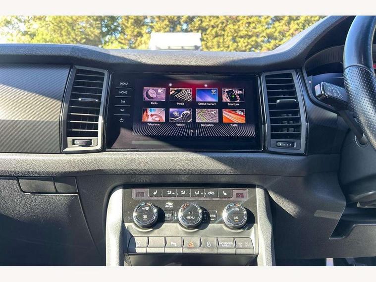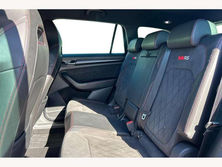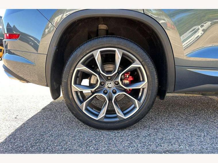 Bluetooth system, Colour multifunction trip computer, Columbus satellite navigation with 9.2" touch screen and integrated Wi-Fi + WLAN, Digital voice enhancement, Drive mode selector, ECO Stop/start function, Exterior temperature indicator, Progressive power assisted steering, SmartLink plus, Speed limiter, Sports dials, Tailgate unlocking from outside, Virtual Cockpit - 10.25" digital display, Dynamic Chassis Control including off-road function, Bolero Radio, DAB Digital radio, DVD System, Dynamic sound booster, USB and SD card connectivity, Aero front windscreen wipers with intermittent function, Aero rear window wiper, Auto dimming rear view mirror, Automatic activation of hazard warning lights, Black door mirrors, Black roof rails, Black wheel arch surrounds, Black window surrounds, Body colour door handles, Dual chrome exhaust tailpipe, Electric front and rear windows, Electrically adjustable/heated/foldable and auto dimming door mirrors with memory function, Front and Rear door steps, Full LED Headlights with adaptive front light system and LED daytime running lights, Gloss black front grille, Headlight washers, Heated rear window, High beam assist, LED front fog lights with static cornering light function, LED rear fog light, LED third brake light in rear spoiler, Light assistant (coming home/tunnel light), Rain and light sensors, Rear diffuser, Safety reflectors on front and rear doors, Sunset privacy glass, Tinted windows, vRS badging on front grille and boot lid, vRS front and rear bumpers, 12V socket in boot, 2 rails with 2 hooks including 4 hooks for net programme, 4 foldable roof handles with rear coat hooks, 4 lashing points on luggage floor, 60:40 foldable rear seat with sliding adjustment and backrest angle adjustment, Alcantara door panels, Alcantara upholstery with Sports seats, Aluminium pedals, Black roof headlining, Bottle holders in door panel in the 1.5 litre front and 1 litre rear, Cargo storage compartments, Centre console with open storage box, cup holder and 12V socket, Chrome headlight control button, Chrome interior door handles, Coat hooks on B pillar, Covered storage compartment on driver side, Door sill panels with KODIAQ logo, Front centre armrest with storage compartment, Front/rear courtesy lights, Gear shift lever with chrome frame and black gloss insert, Height adjustable front headrests, Illuminated and cooled glovebox, Illuminated luggage compartment, Isofix system on outer rear seats, LED ambient lighting, Manually adjustable steering column, Net programme in boot (1x horizontal Net, 2x vertical Nets), Overhead glasses storage compartment, Passenger side net compartment on centre console, Pollen filter, Rear centre armrest with cupholders, Removable lamp in luggage compartment, Roll up luggage compartment cover with intermediate position, Small Bags on the inner sides of the front backrests, Small pockets on the inner side of the front backrests, Storage compartment in lower middle Instrument panel, illuminated with closing, Sunvisors with illuminated vanity mirrors, Textile floor mats, Three rear height adjustable headrests, Ticket holder on A Pillar, Umbrella in door panel, Variable boot floor, vRS stitching in door panels, LED Interior Light pack - Kodiaq Scout/Sport Line/VRS/Laurin + Klement, Auto door release and activation of warning lights in the event of an accident, Driver and passenger airbags, Electronic parking brake with hill hold control, Emergency rear braking signal, ESC (incl. ABS+MSR+ASR+EDS+HBA+DSR+RBS+MKB), Front and rear three point safety belt on all seats, Front assist includes AEB city/urban, Front side airbags, Fuel cut off safety device, Head and knee airbags, Passenger airbag deactivate switch, Rear disc brakes, Red brake calipers, Safety vest holder in door, Seat belt reminder for all seats, Two tone horn, Tyre pressure monitor, Warning lights in front doors, Alarm with interior monitoring and tilt sensor with safe function, Immobiliser, Keyless entry and start system (KESSY), Remote central locking, Carbon finish dashboard and door inserts, 20" Xtreme alloy wheels with anti-theft wheel bolts, Tyre repair kit with compressor,