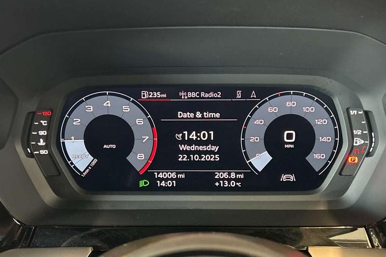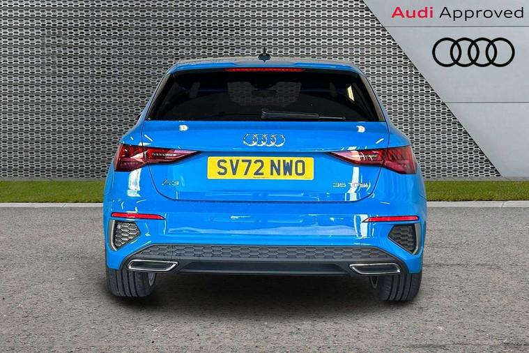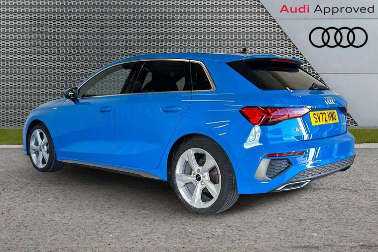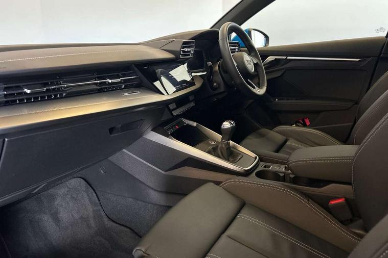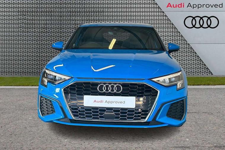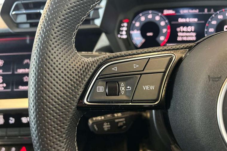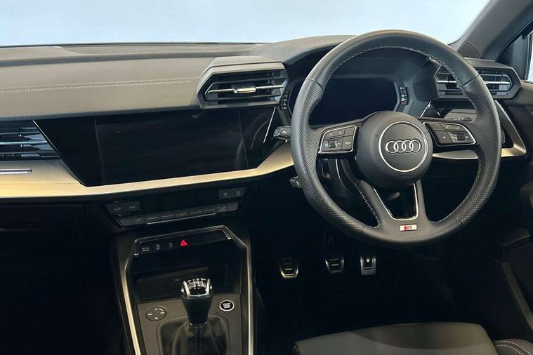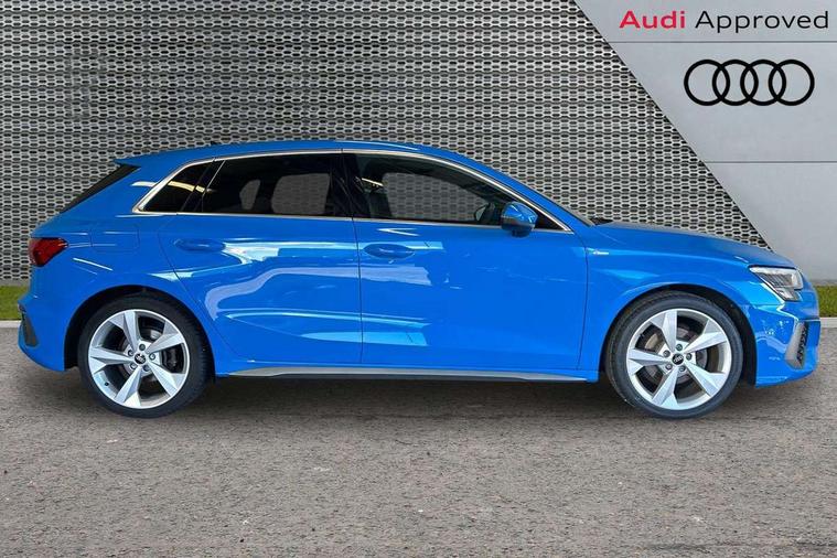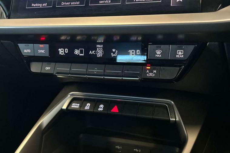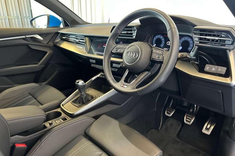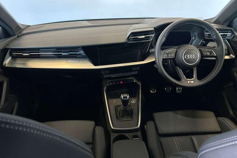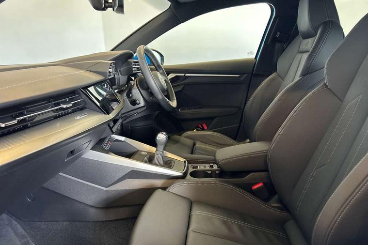 Audi drive select (Auto, Comfort, Dynamic, Efficiency and Individual), Audi smartphone interface, Audi Virtual Cockpit - 10.25" digital and colour instrument cluster, Automatic start/stop system with recuperation, Bluetooth interface, Collision avoidance assistant, Cruise control, e-Call (emergency call), Electromechanical power speed sensitive steering, Lane departure warning system, MMI Navigation Plus with high resolution 10.1" colour touch screen display, Rear parking sensors, Service indicator, Trip computer, Voice control system with natural language interaction, 2xUSB-C connection with data and charging functions, 6 passive loudspeakers, DAB Digital radio, 3rd brake light, Acoustic glass windscreen, Aluminium window trim, Auto dimming frameless rear view mirror, Electrically adjustable/heated/folding/auto dimming door mirrors with integrated LED indications + kerb view function for passenger side, Front electric windows, Illuminated aluminium inserts front door sills with S logo, LED daytime running lights, LED headlights with LED rear lights and dynamic rear indicators, Light and rain sensors, Privacy glass - dark tinted rear window, rear door and side windows, Rear electric windows, Rear side air outlets in grained matt black, Rear side wing doors, Rear wiper, S line bumpers, S roof spoiler, 12V socket and storage compartment in front centre console, 3 seat bench in 2nd row, 40/20/40 split folding rear seat bench with cupholder, Black cloth headlining, Dual zone electronic climate control, Front and rear centre armrest in leather, Front and rear headrests, Front/rear floor mats, Height and reach adjustable steering wheel, Illuminated vanity mirror, Interior lighting - glove compartment light and right hand side, Luggage compartment floor covering, Manual boot compartment lid, Manually adjustable front seats, Seat side bolsters, Single front passenger seat, Stainless steel pedals and front footrest in black, Twin leather upholstery with front sports seats S embossed logo, Aluminium interior elements pack - A3 Sportback, S line styling pack - A3 Sportback, 3x3 point rear seat belts, Audi pre sense front, Driver and front passenger airbag with passenger airbag deactivation, Electronic Stabilisation Control (ESC) including ABS, ASR and EDL, First aid kit with warning triangle and 2 safety vests, Front side airbags with head airbags and interaction airbag, Pre-sense front with pedestrian and cyclist detection, Seatbelt monitoring, Tyre pressure loss indicator, Anti theft alarm, Anti-theft wheel bolts, Immobiliser, Manual child locks, Remote control central locking, Accent surfaces in the dashboard and centre console in platinum grey silk effect paint finish, Dark spectrum aluminium inlays,