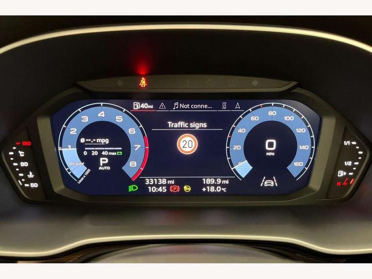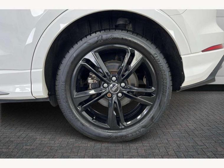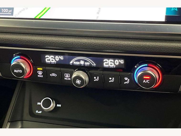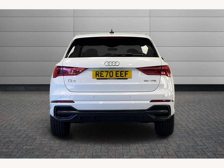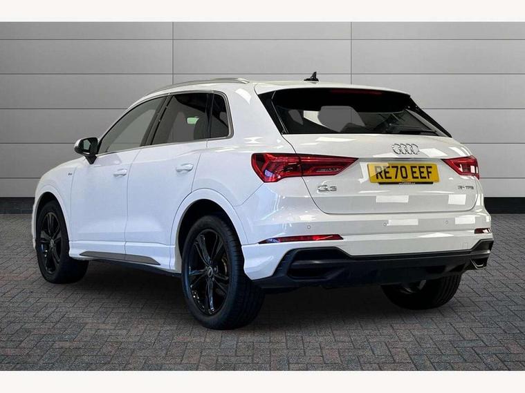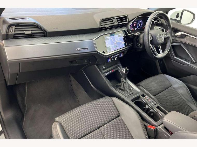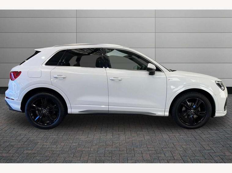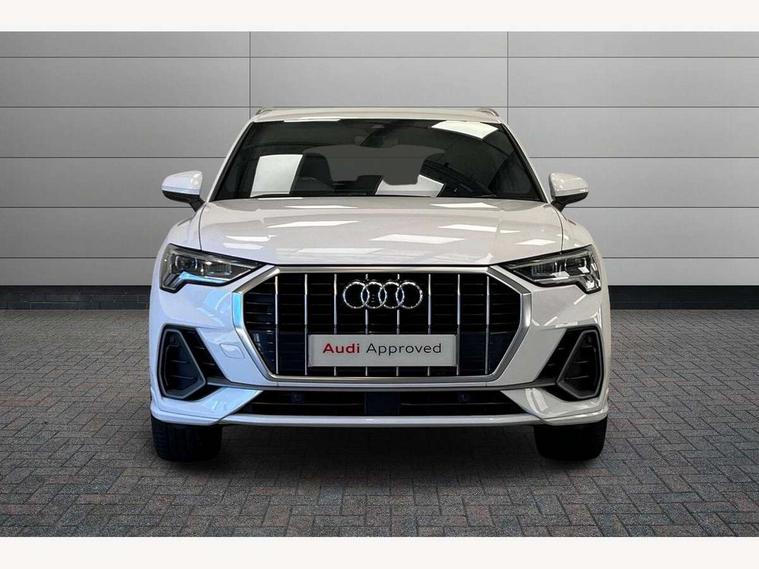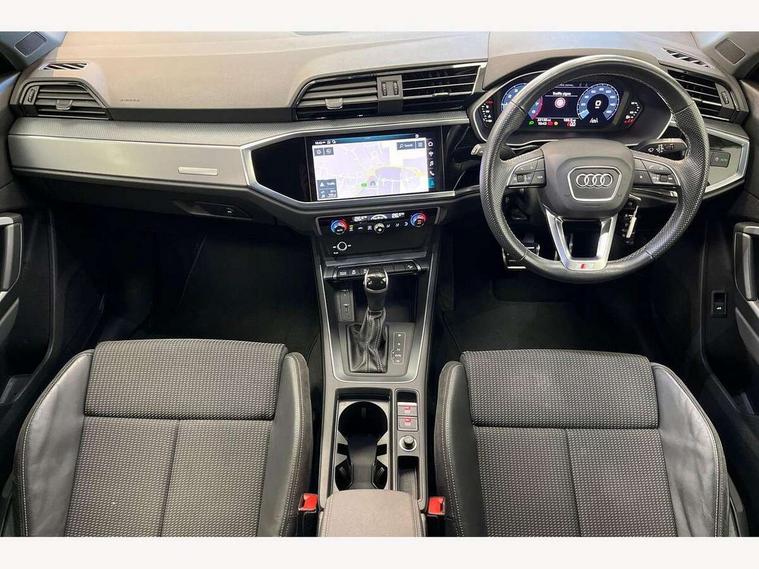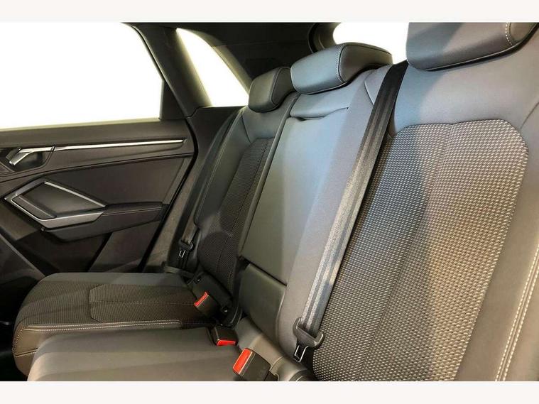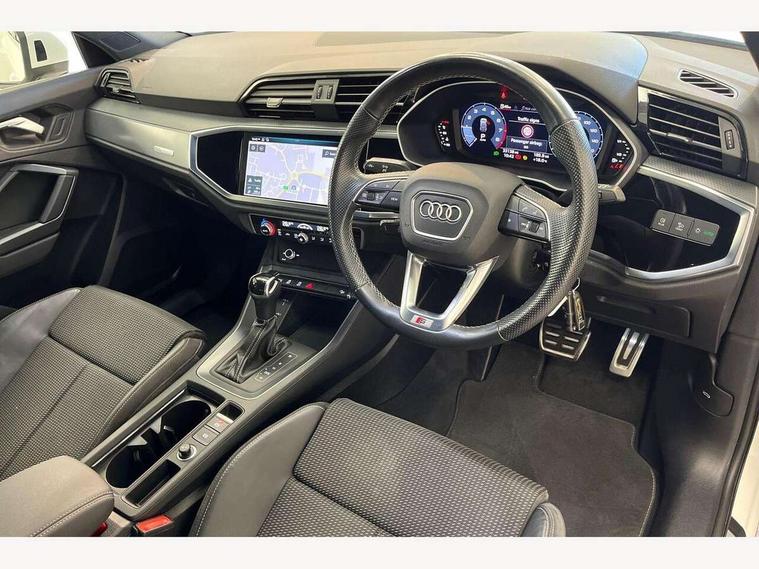 Audi connect safety and service (e-call), Audi drive select, Audi lane departure warning, Audi side assist, Audi smartphone interface includes wireless Apple carplay/Android Auto, Audi Virtual Cockpit - 10.25" display, Bluetooth interface, Camera based traffic sign recognition, MMI Navigation Plus with high resolution 10.1 inch touchscreen colour display, Power operated tailgate, Progressive steering, Service interval indicator, Start stop system with recuperation, Voice control system with natural language interaction, 48V Mild hybrid technology, Sports suspension, 1 x USB type C and 1 USB type A charging points, 6 passive loudspeakers, DAB digital radio module, Acoustic windscreen, Aluminium roof rails, Aluminium window trim, Auto dimming frameless rear view mirror, Body coloured bumpers, Electrically folding, adjustable and heated door mirrors with integrated LED side indicators and kerb view function for passenger side, Front and rear electric windows, Front fog lights, Front side air inlets in matt platinum grey, Front spoiler blade in matt platinum grey, Grille vertical bars in aluminium silver/Matt, High gloss black finish B and C pillars, LED headlights with LED daytime running lights and dynamic rear indicator, LED rear lights, Privacy glass dark tinted rear and rear-side windows (from B-pillar backwards), Rain and light sensors, Rear diffuser strip in matt titanium black, S line badges on front wings, S Line front and rear bumpers, Side skirt insert in matt Platinium grey, Silver chrome grille surround, Titanium black radiator grille, 12V socket in rear centre console, 40:20:40 folding with manual adjustment for 60:40 forwards/backwards position and backrest angle, Adjustable rear seat bench/backrest with centre armrest and cupholder, Black cloth headlining, Dual zone electronic climate control, Front and rear black floor mats with contrast stitching in rock grey, Front and rear headrests, Front and rear roof module including reading lights, Front centre armrest, Glove compartment lighting, Height and reach adjustable steering wheel, Illuminated door sill trims with S logo, ISOFIX child seat mounting for front passenger with airbag deactivation and outer rear seat including top tether attachment point for outer rear seats, Luggage compartment light, Manual front seats with height adjustment, Perforated leather gearknob, Stainless steel luggage compartment sill finisher, Stainless steel pedals, Tool kit, Non smoking pack - Q3, 3x3 point rear seatbelts, 6 airbags - Driver, front passenger, curtain and side windows, Audi pre-sense front with pedestrain and cyclist recognition, Electrically operated child locks on rear doors, Electromechanical parking brake, Electronic stabilisation control including ABS, ASR and EDL, Hill descent control, Hill hold assist, Pre sense basic, Seatbelt monitoring, Tyre pressure warning, Warning triangle and first aid kit, Anti theft alarm, Anti theft wheel bolts, Remote central locking, Dark matt brushed aluminium inlay, Detail dashboard around MMI touch colour display in glass look, black with surround in aluminium look, Leatherette door armrest, Tyre repair kit,